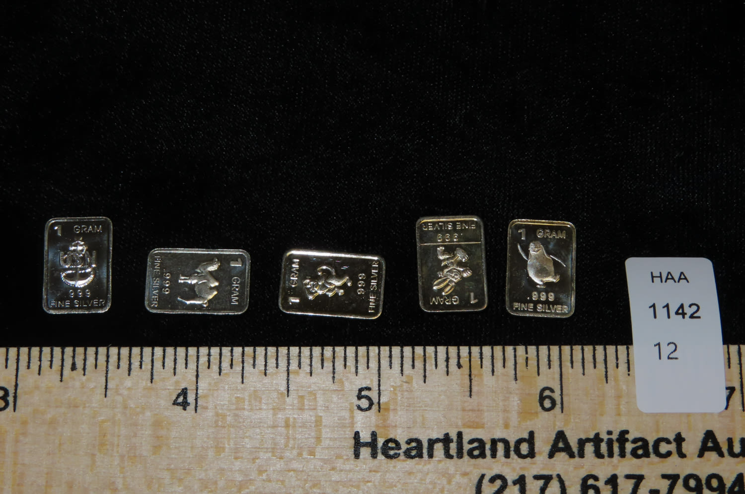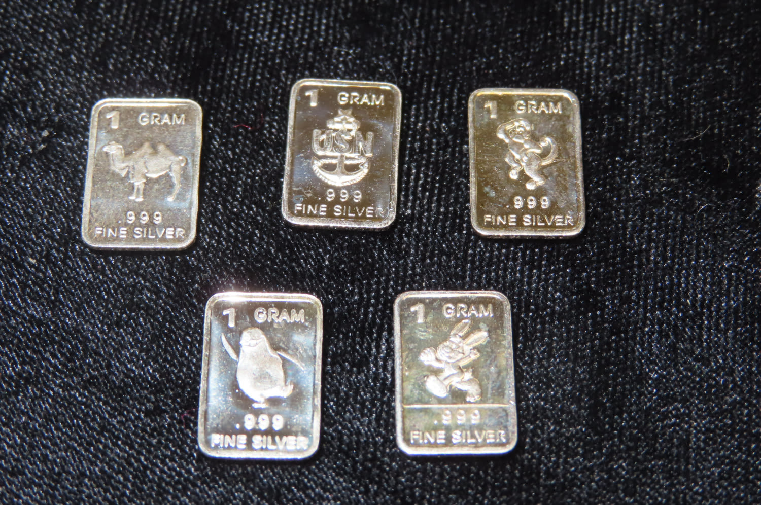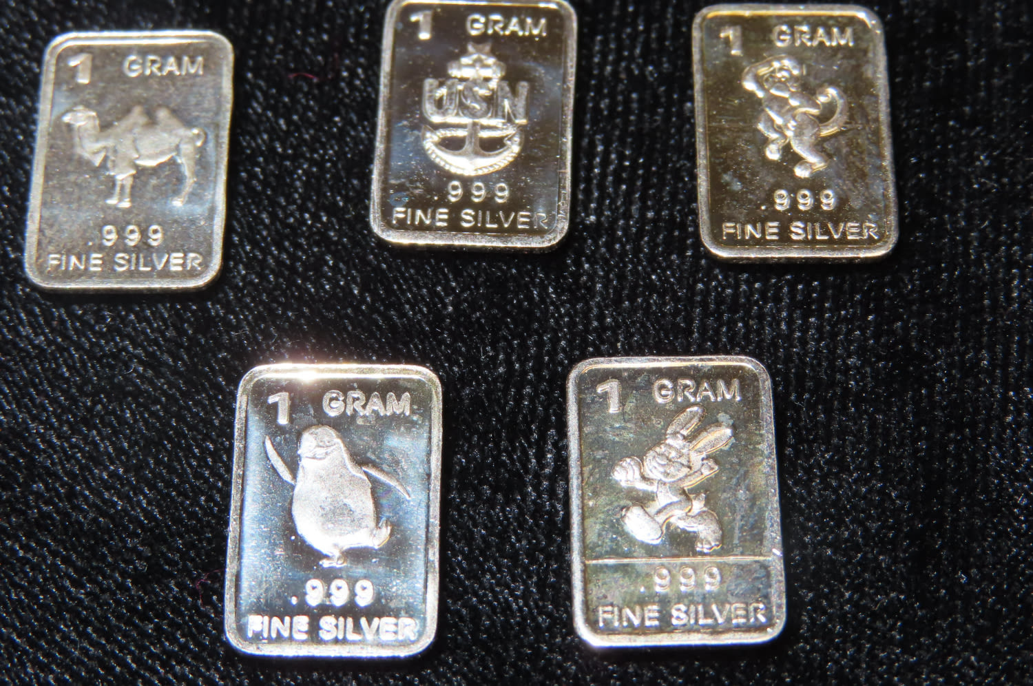 LOT OF 5 MINI SILVER BARS, 1 GRAM EACH, .999 PURE SILVER BULLION