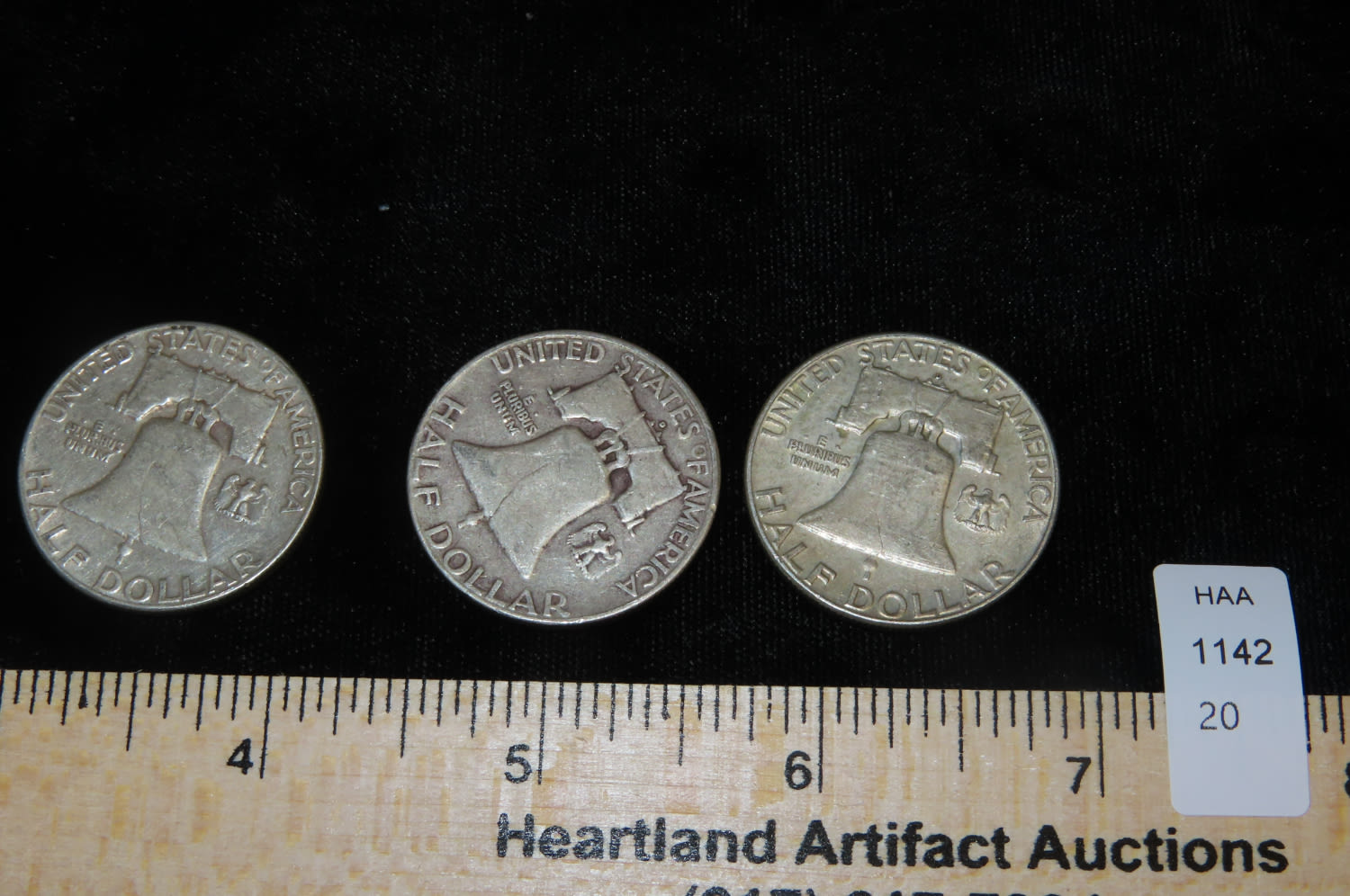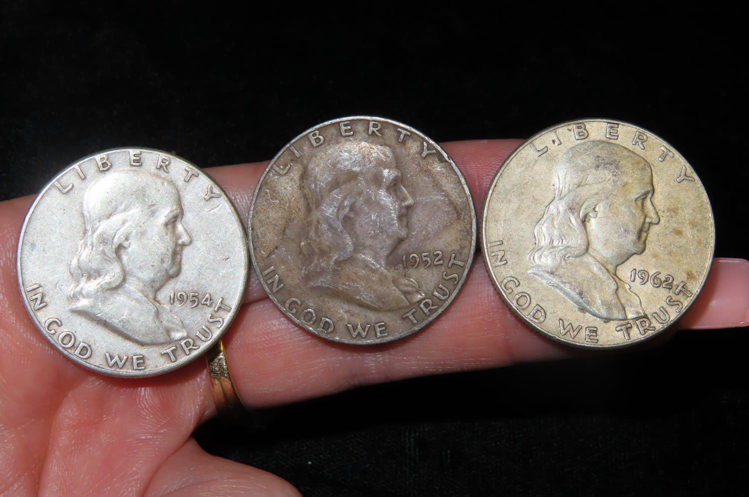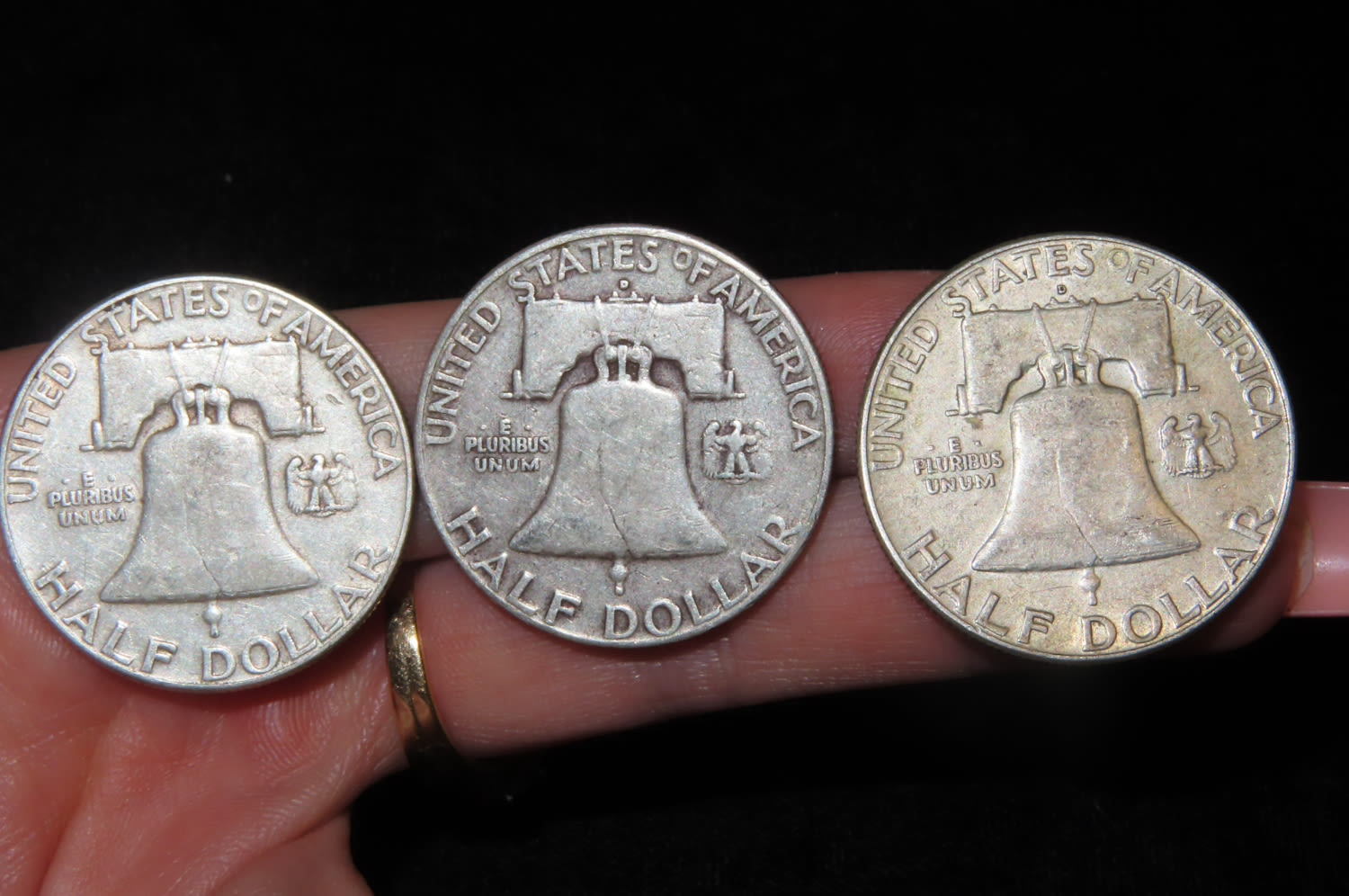 LOT OF 3 FRANKLIN SILVER HALF DOLLARS. ALL DIFFERENT