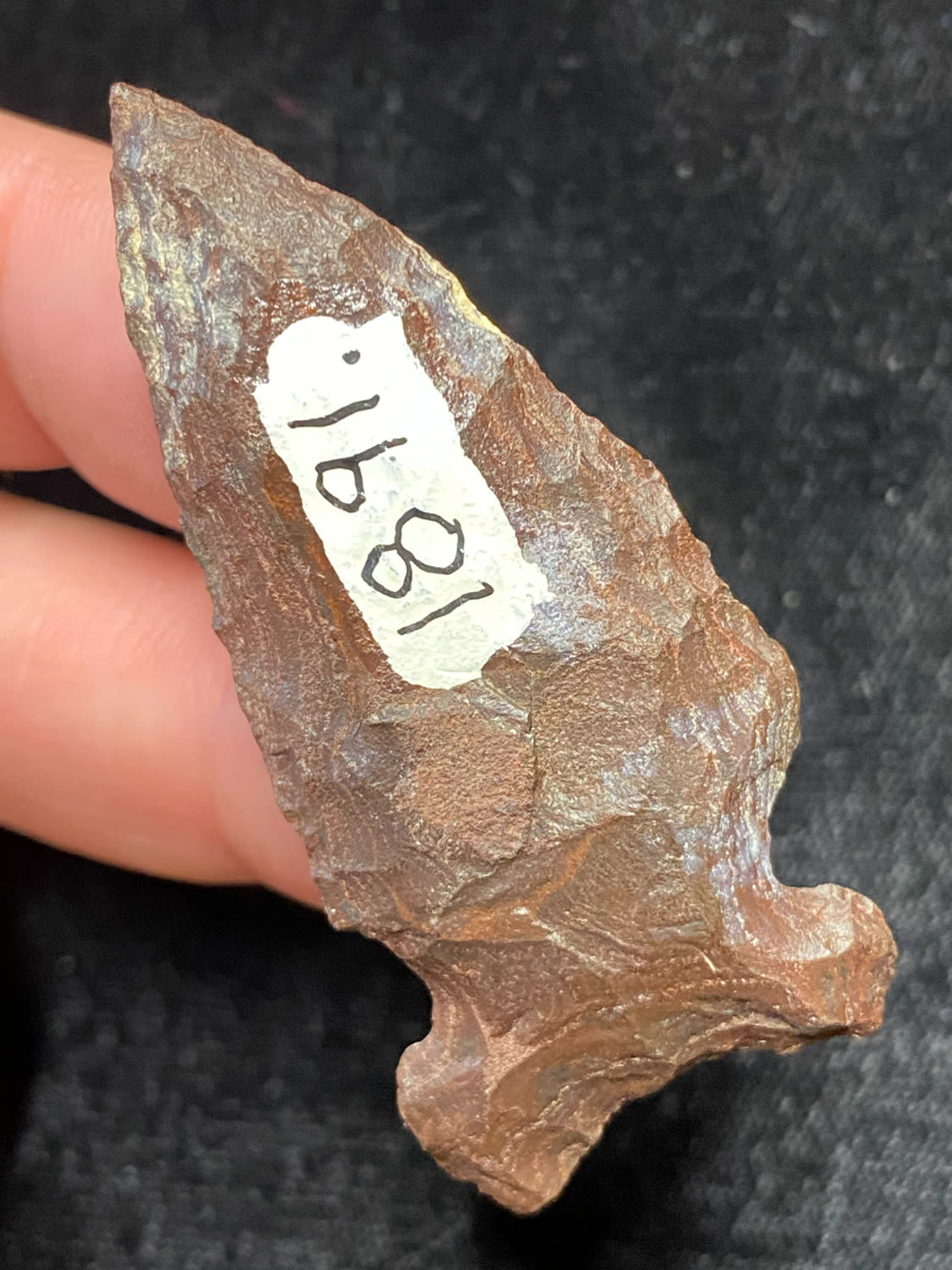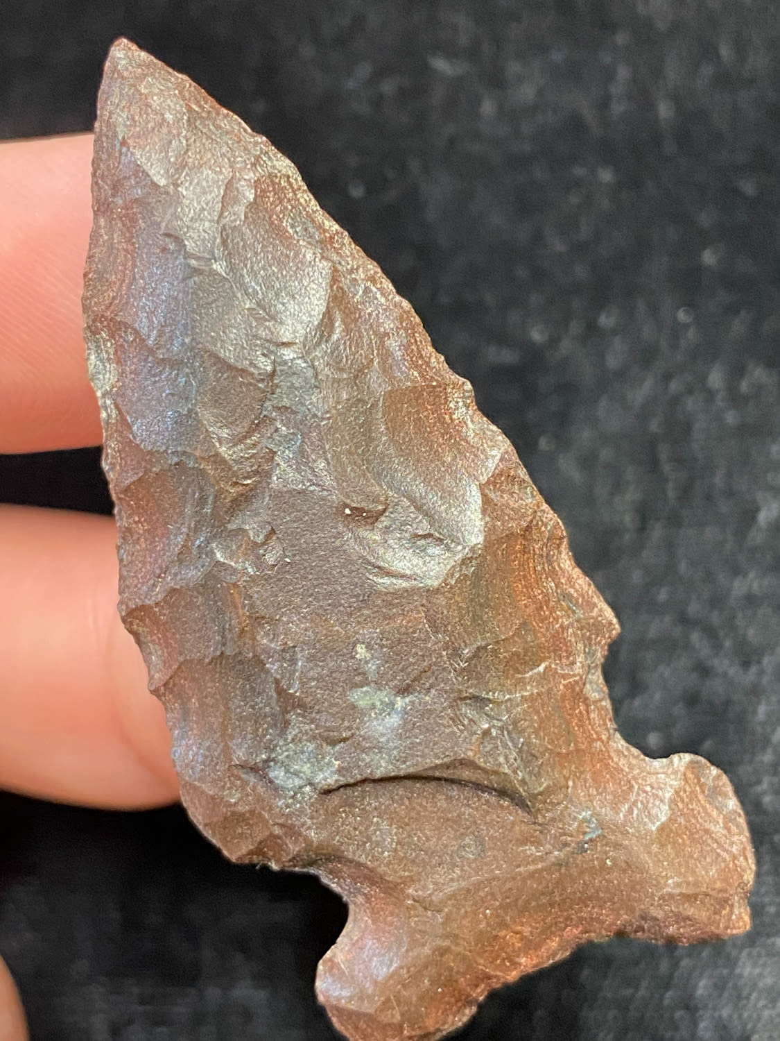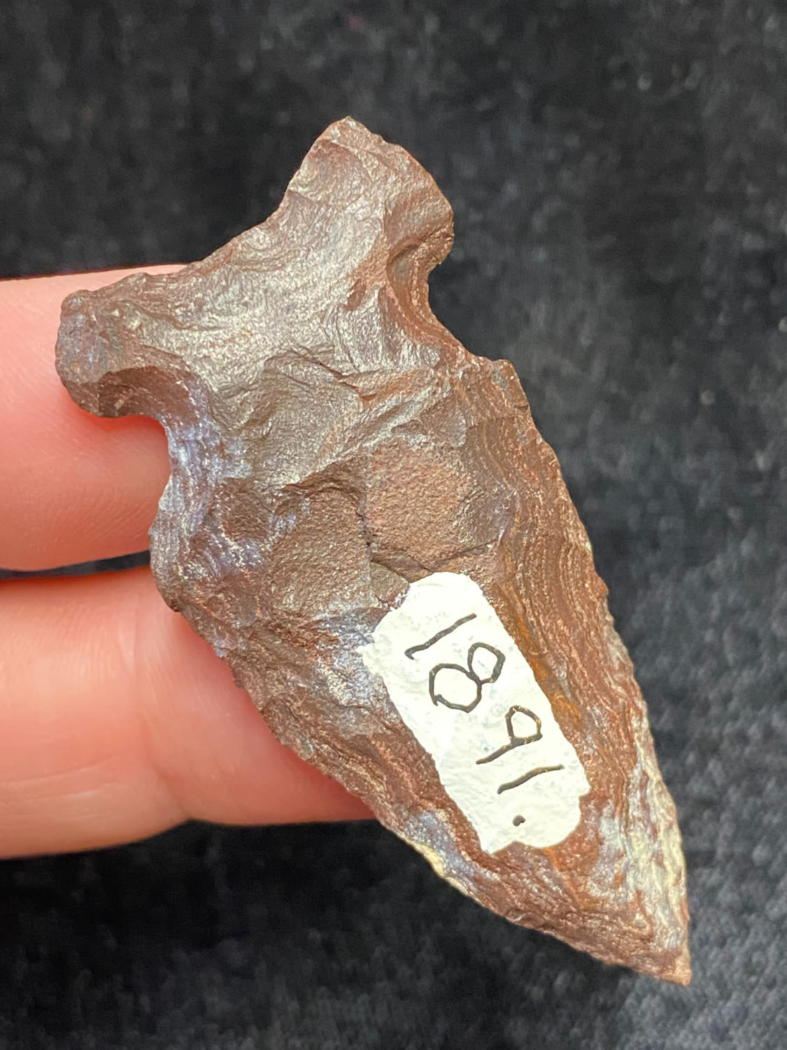 2″ Extremely nice point, Side Notched, Brown/Black material, found in Winn Co Wisconsin, 1964, Ex. Sam Wasion Collection