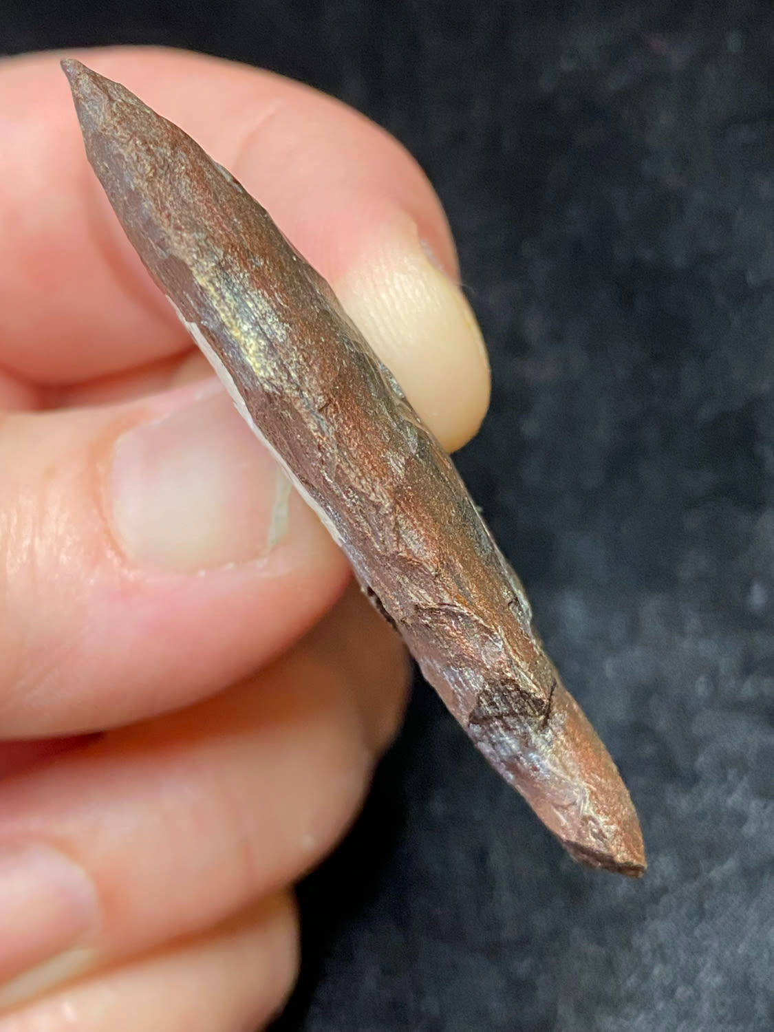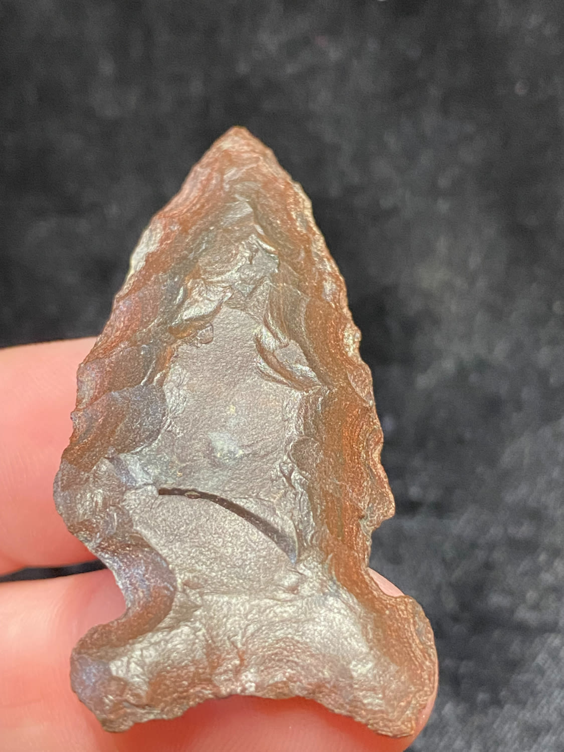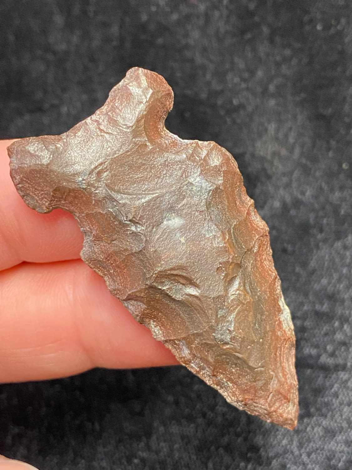 2″ Extremely nice point, Side Notched, Brown/Black material, found in Winn Co Wisconsin, 1964, Ex. Sam Wasion Collection