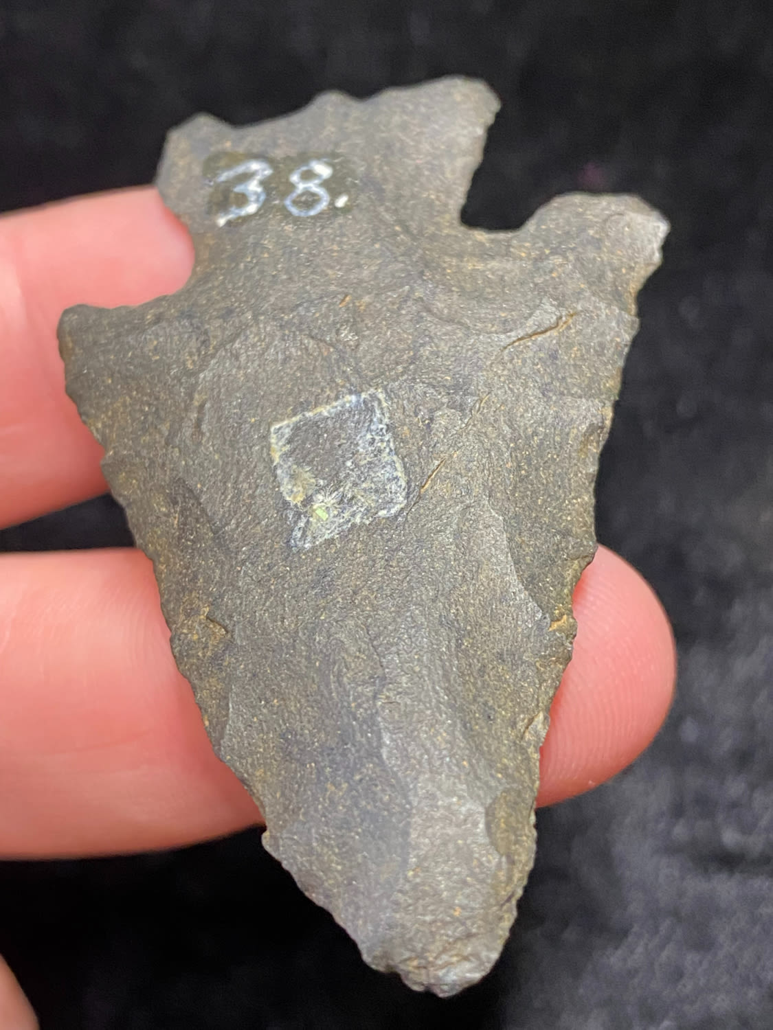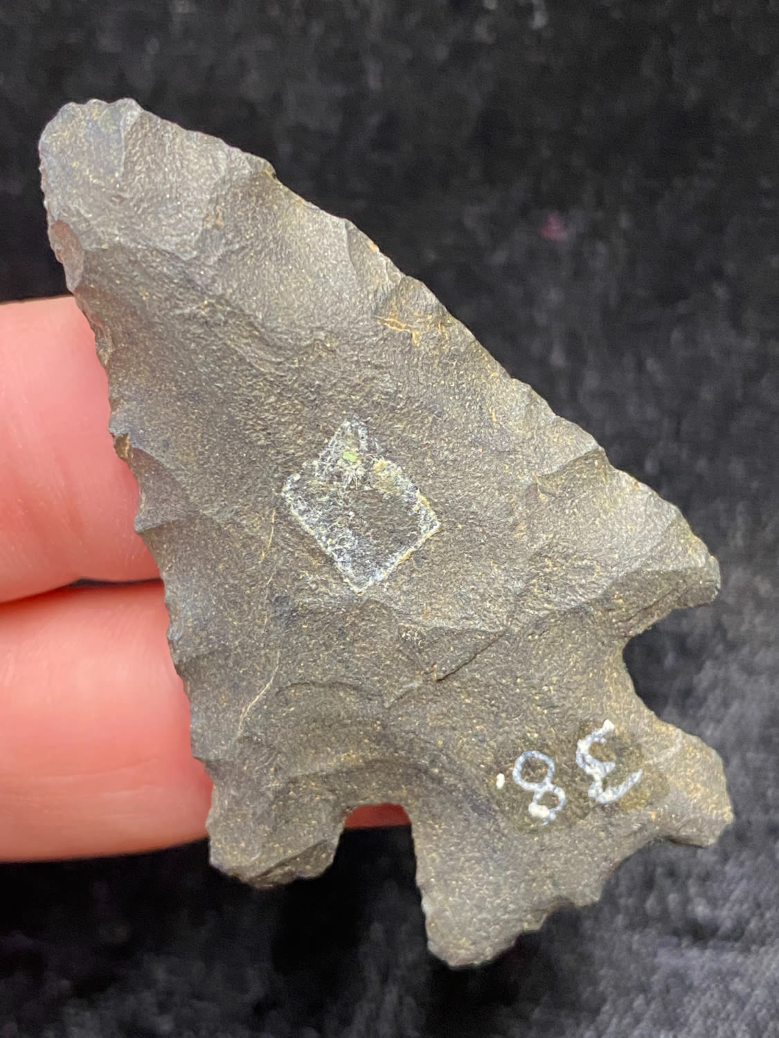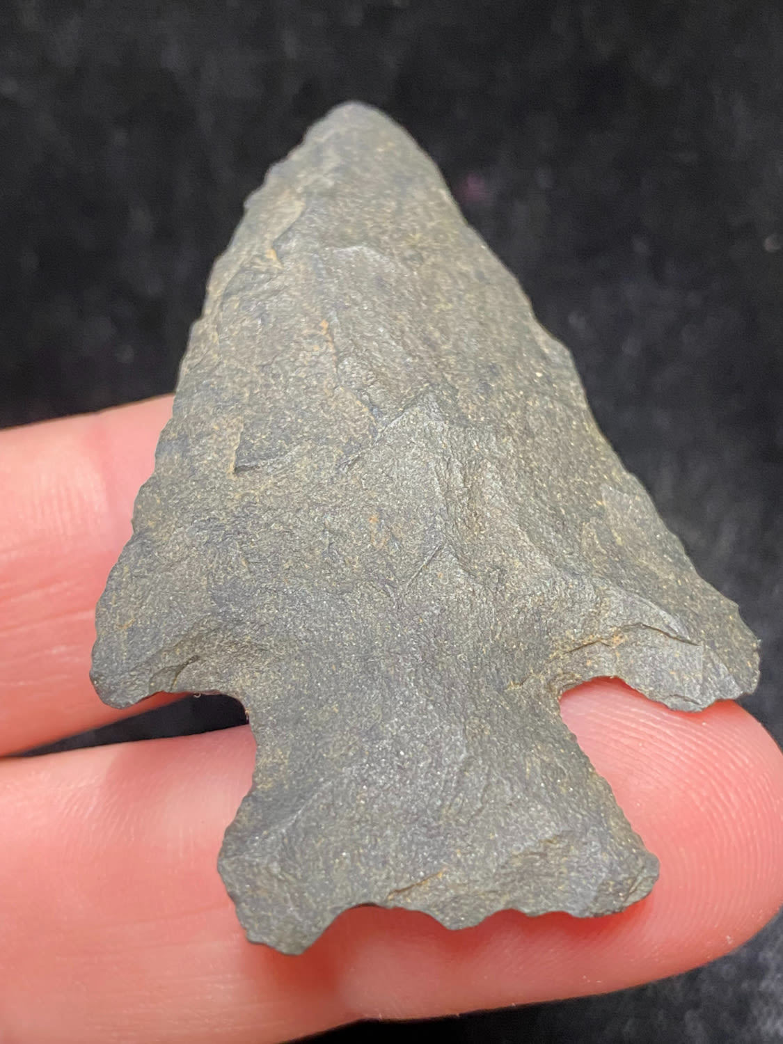 2 1/8″ Typical Arrowhead, Black Slate-like material, purchased for 3 cents in 1946, Ex. Sam Wasion Collection