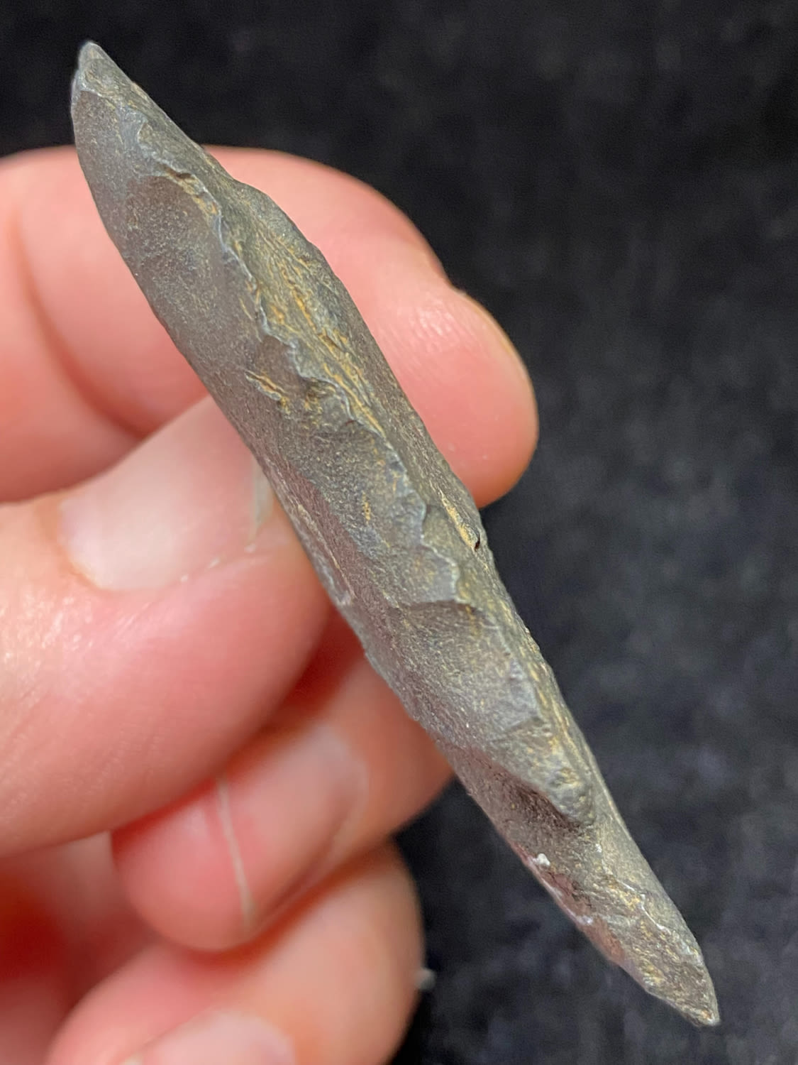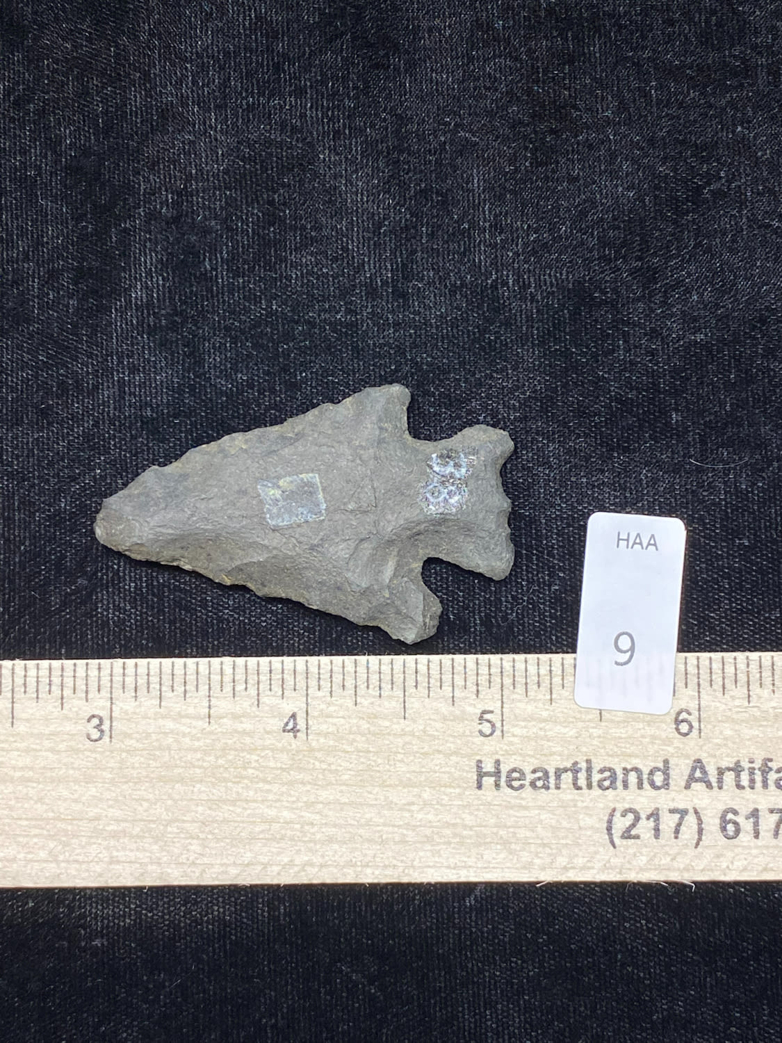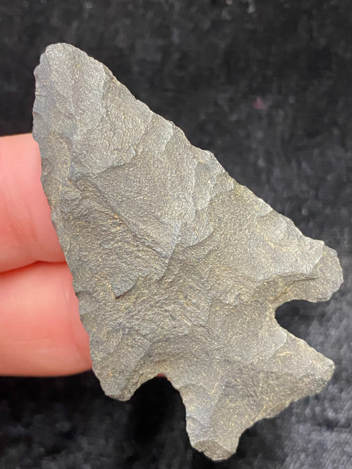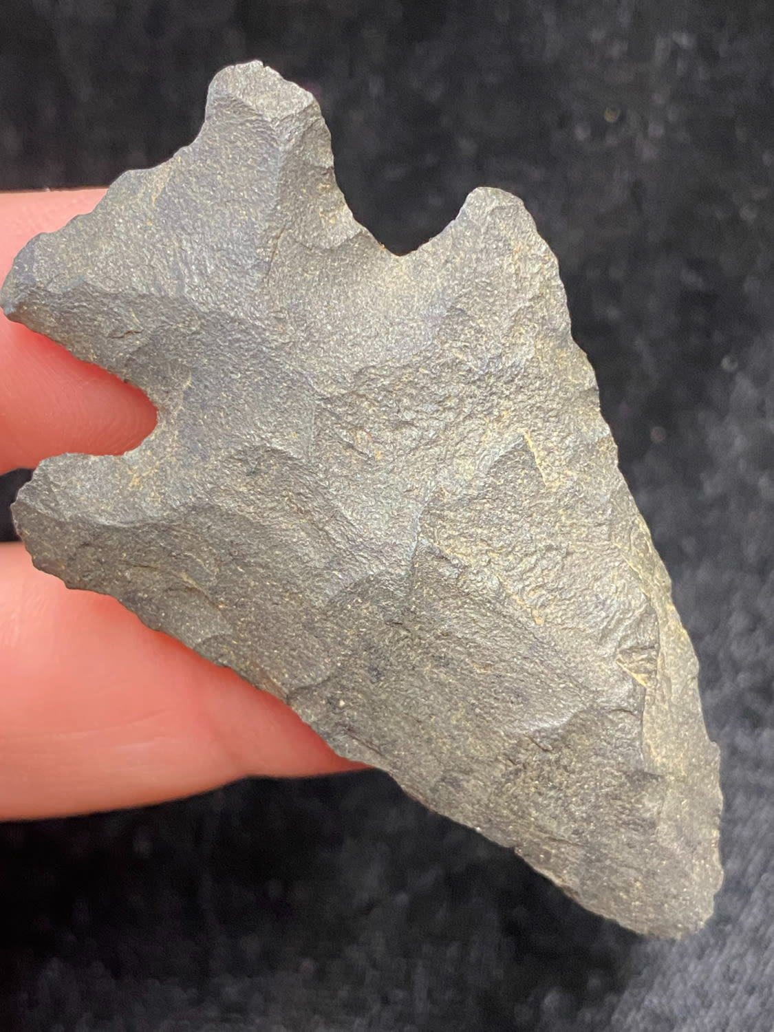 2 1/8″ Typical Arrowhead, Black Slate-like material, purchased for 3 cents in 1946, Ex. Sam Wasion Collection