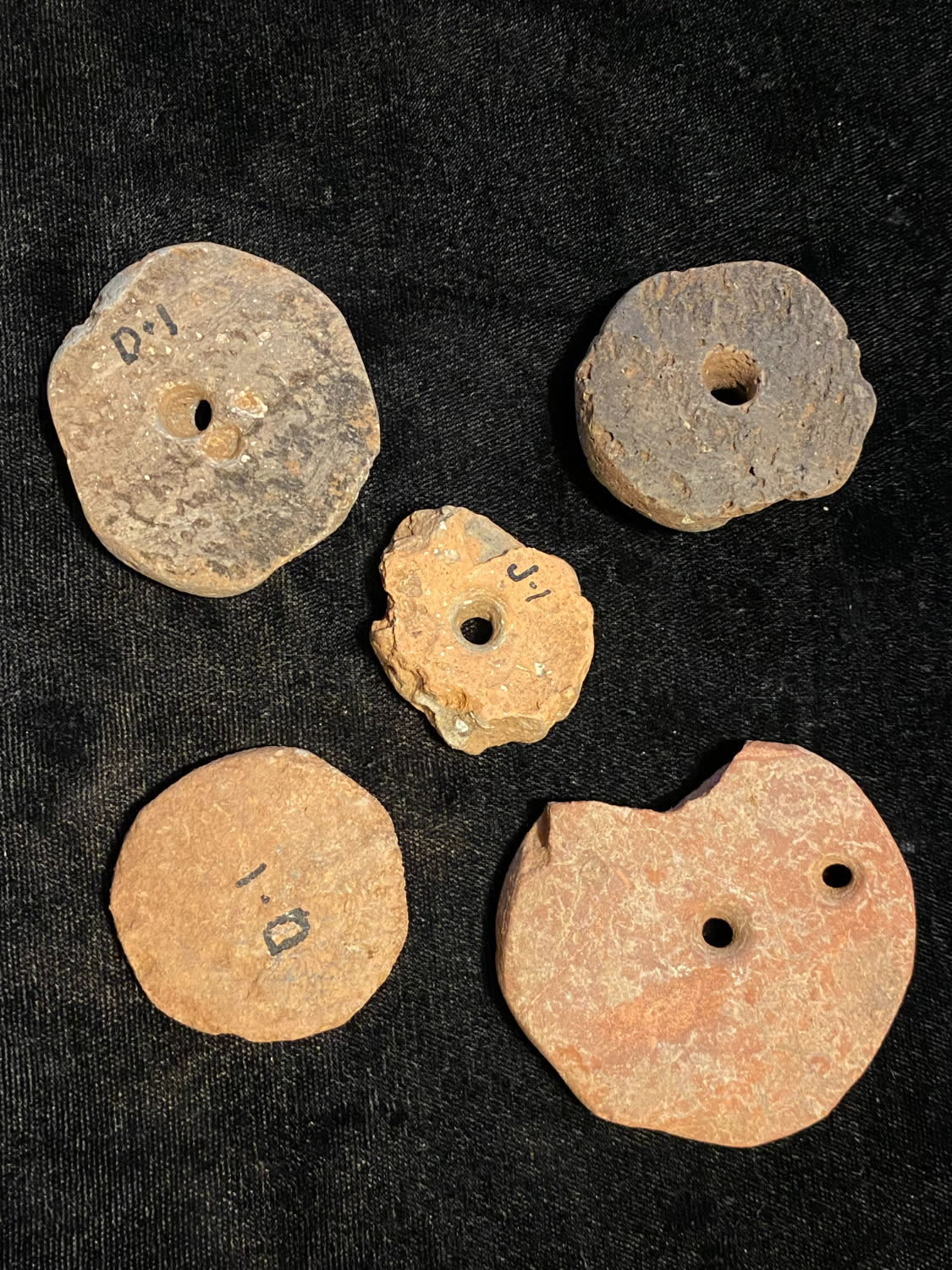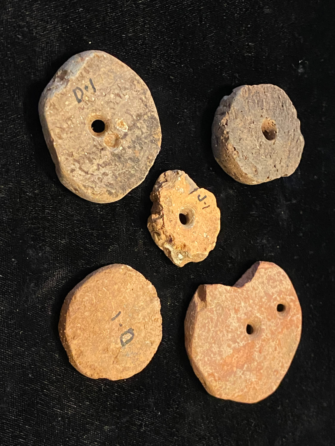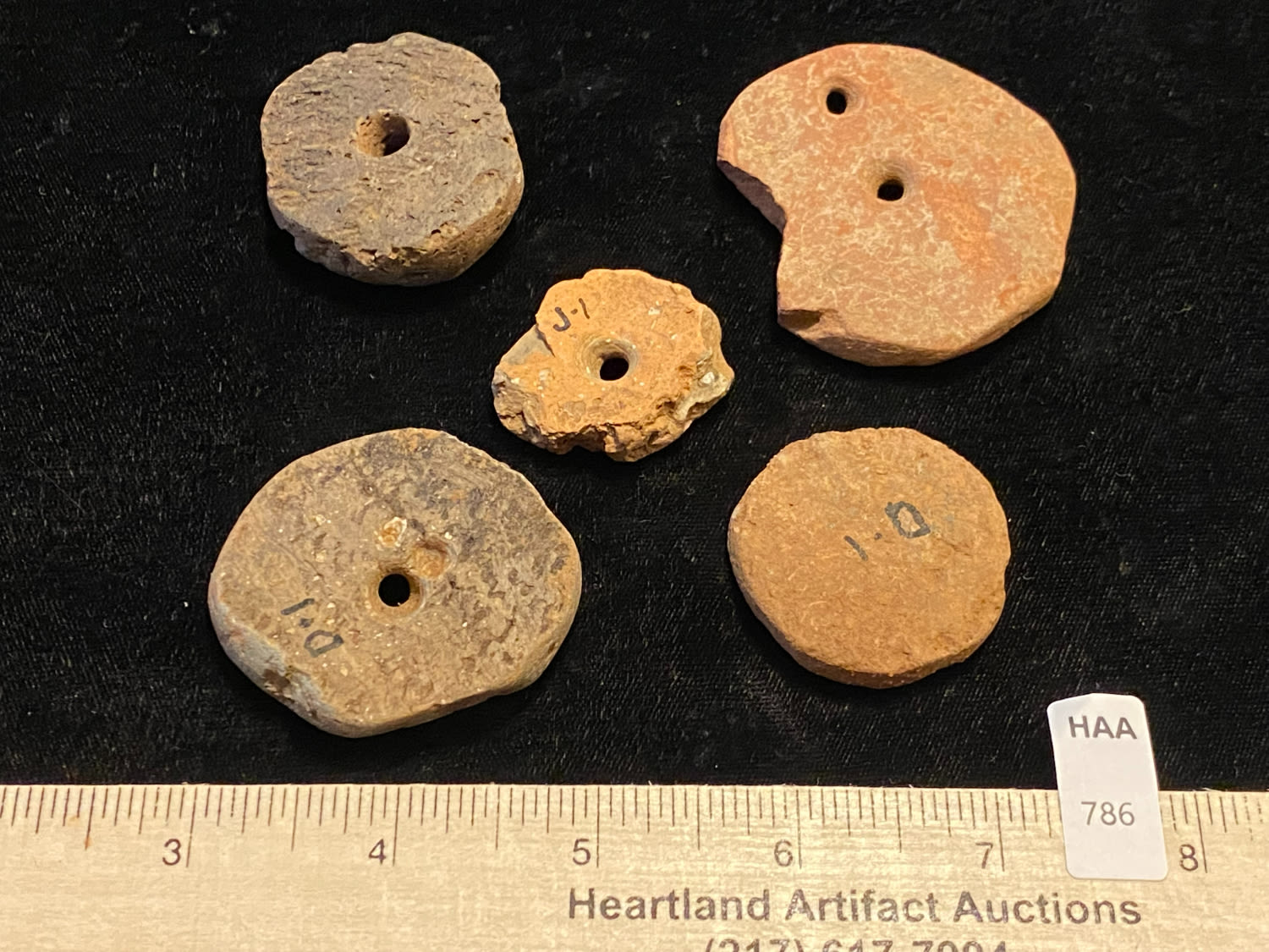 Grouping of Pottery Beads, and Gorget Pre-form, found in Central Oklahoma, Ex Jesse Jordon Collection