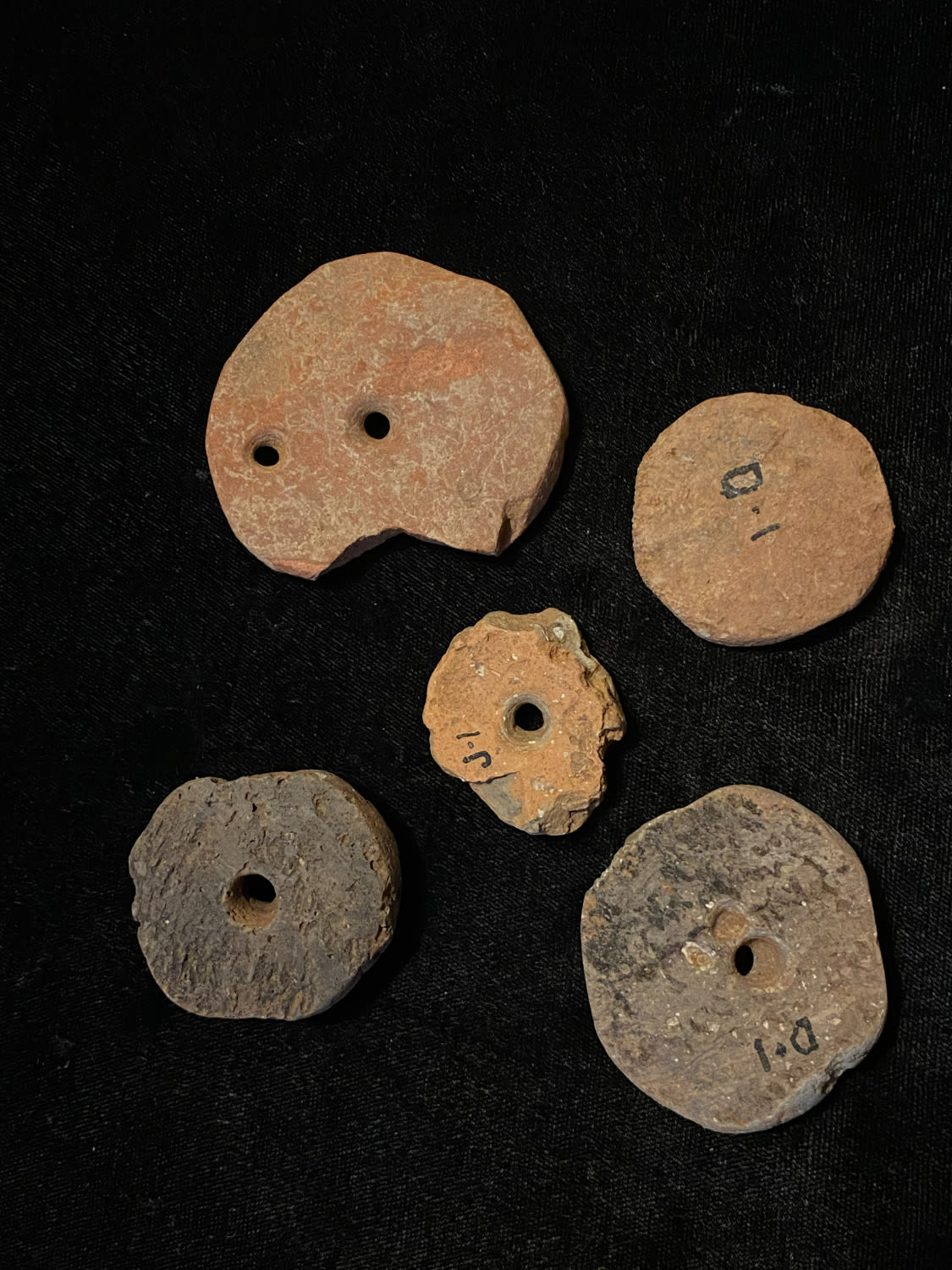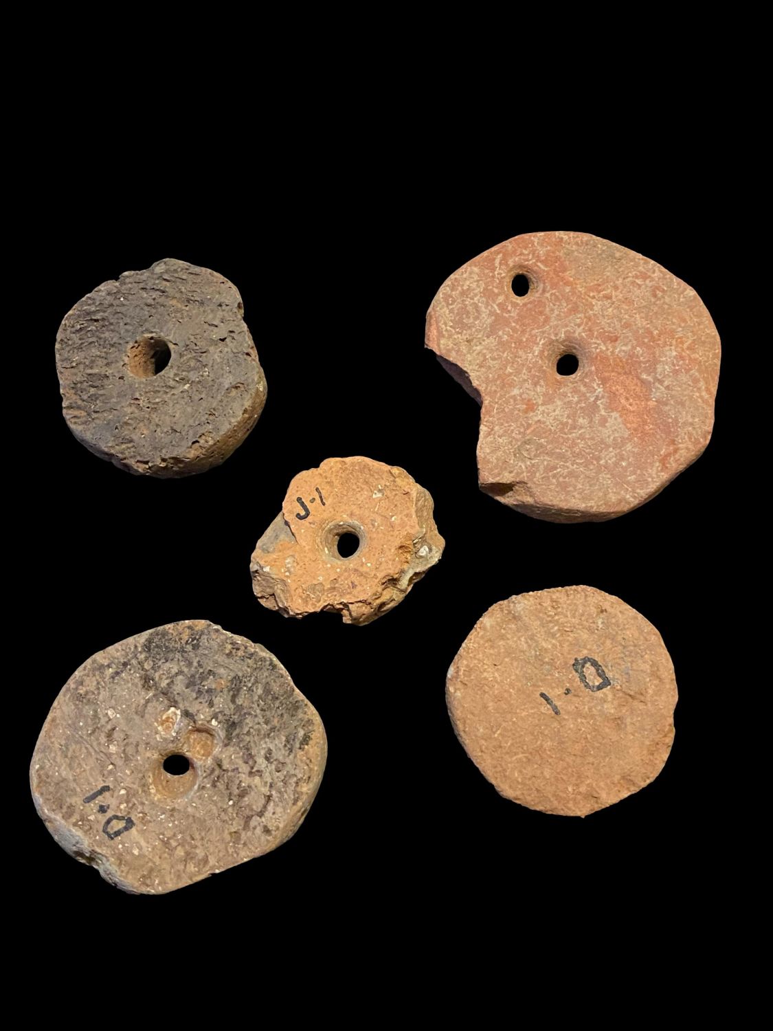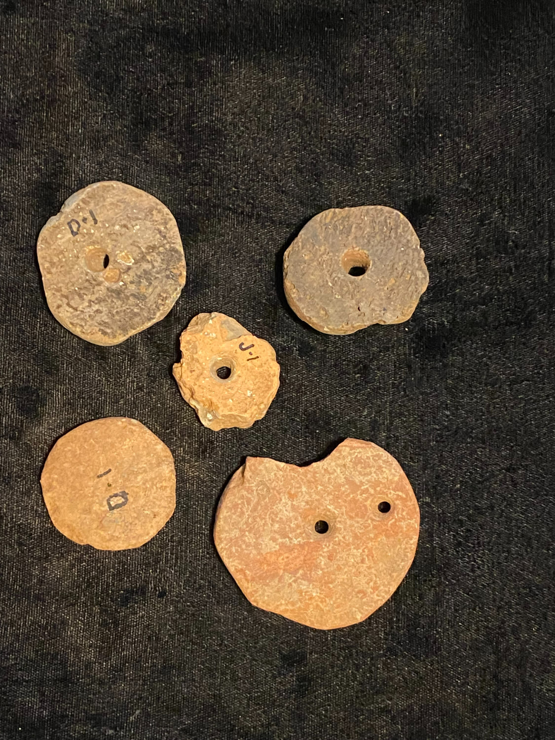 Grouping of Pottery Beads, and Gorget Pre-form, found in Central Oklahoma, Ex Jesse Jordon Collection