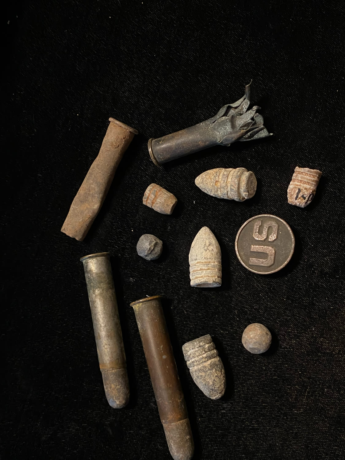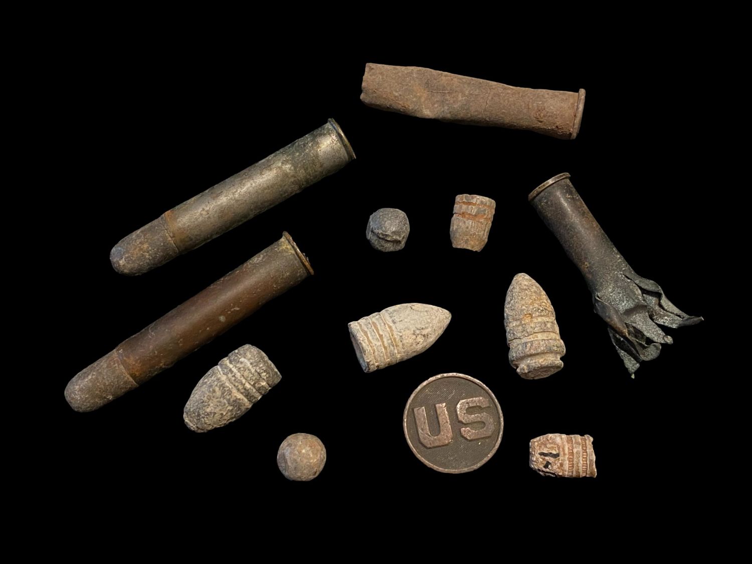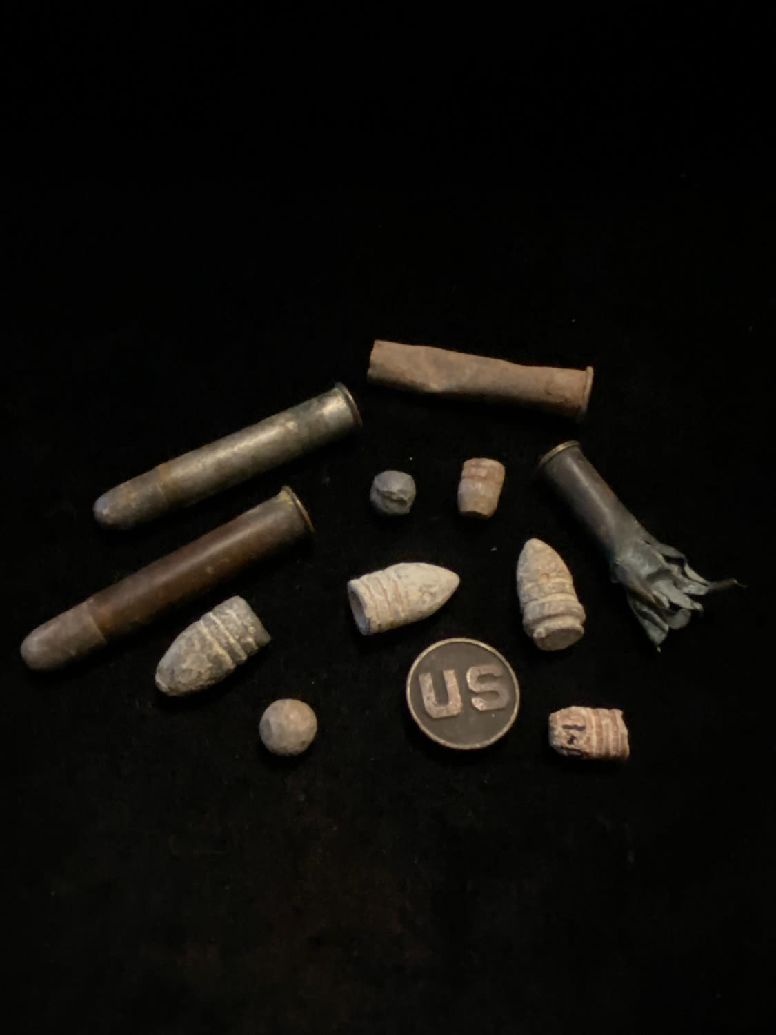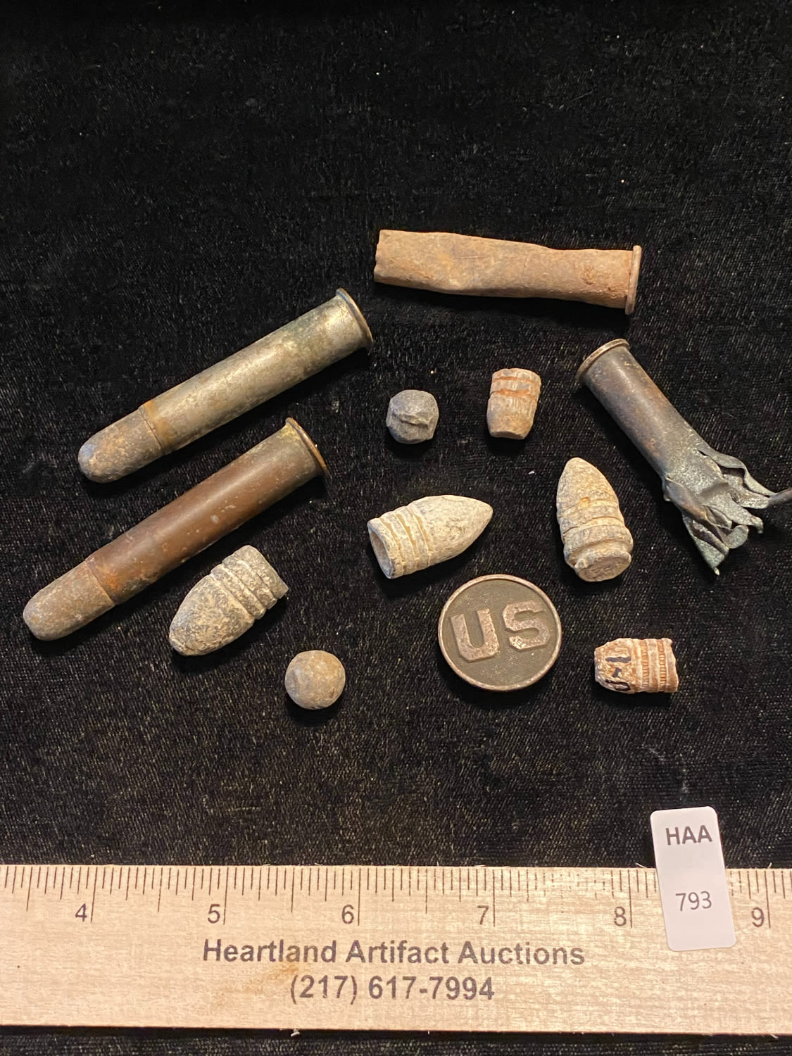 Grouping of Civil War Era Metal Objects-Bullets, Button, Lead Shot, and Casings, found in Central Oklahoma, Ex Jesse Jordon Collection