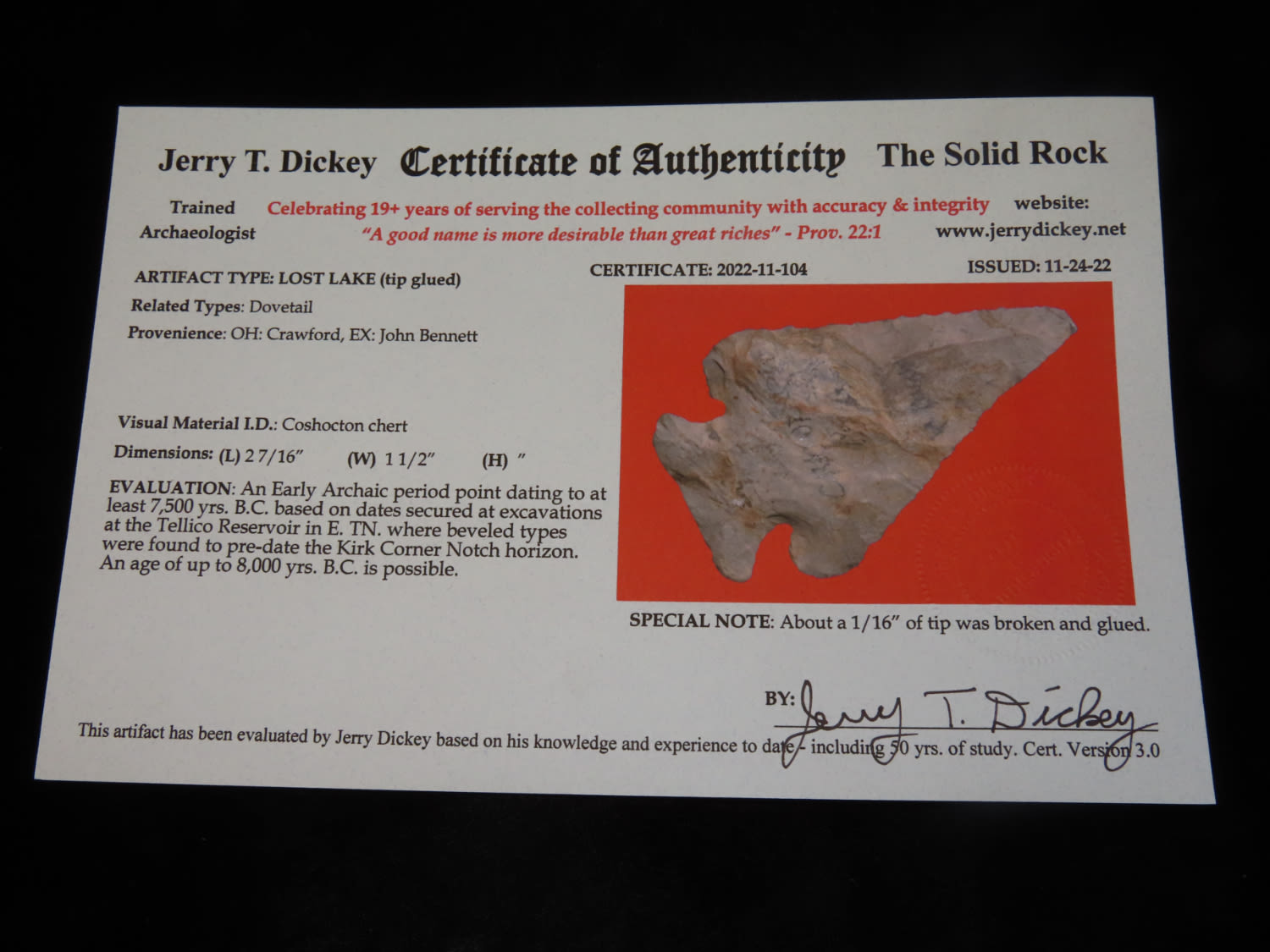 2 7/16″ Lost Lake, Dickey COA, Tip Glued, Crawford Co Indiana