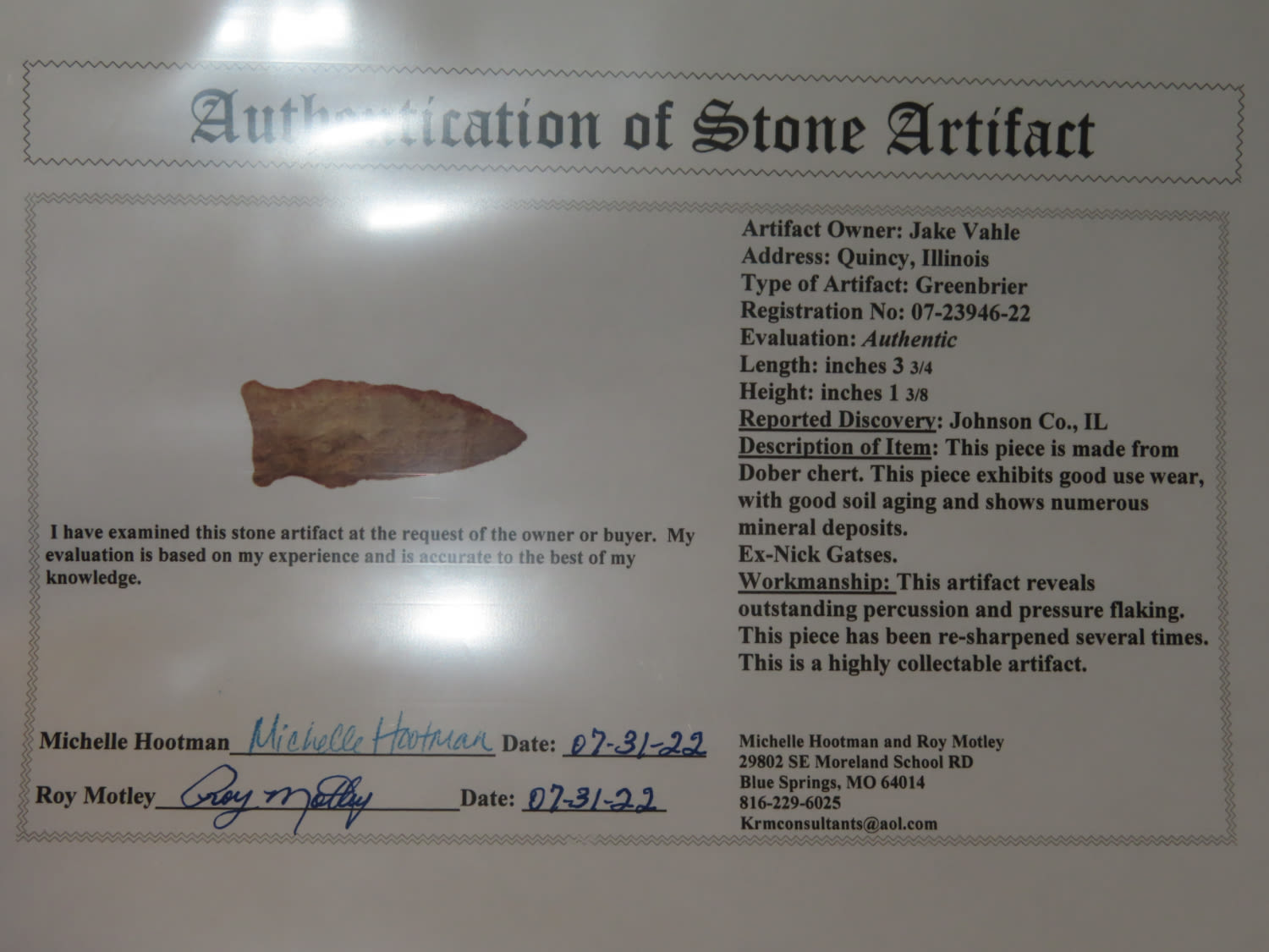 3 3/4″Greenbrier, Motley COA, found in Johnson Co Illinois, Ex Nick Gatses Collection