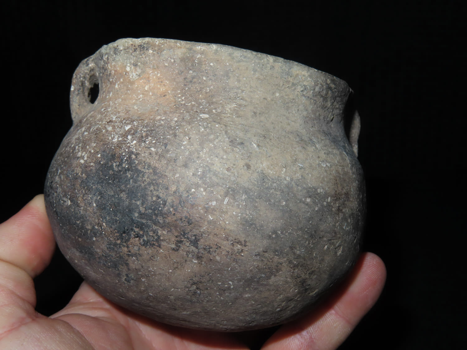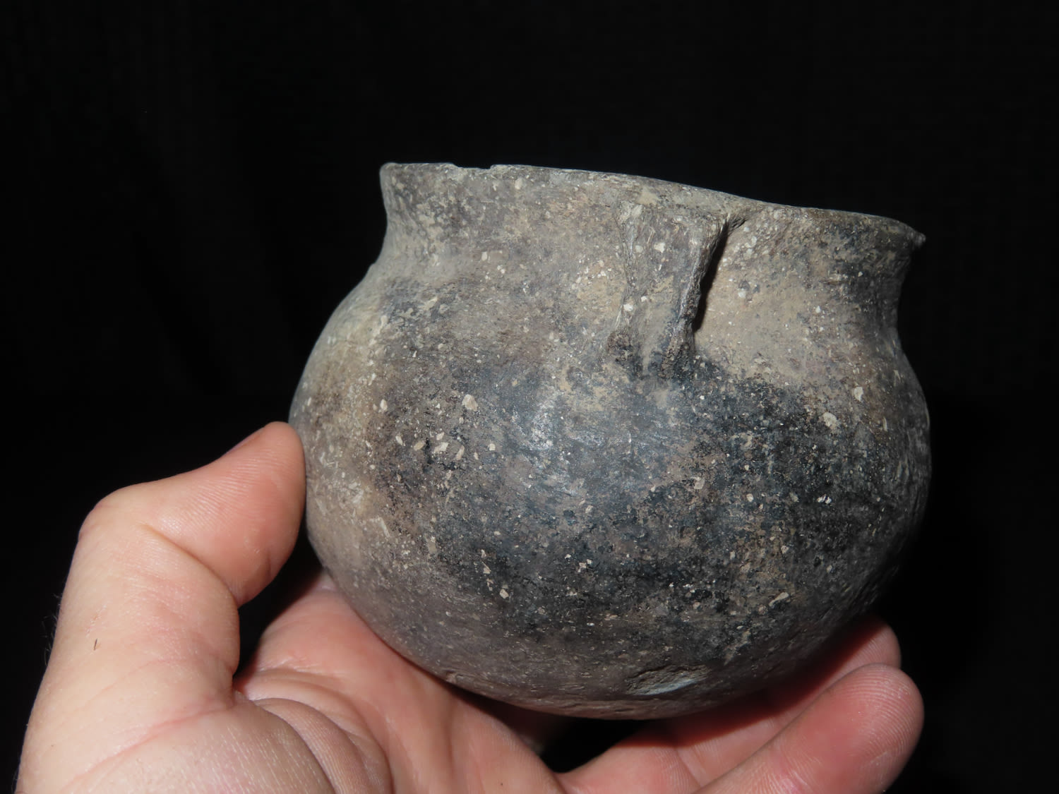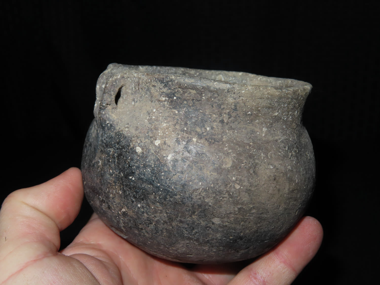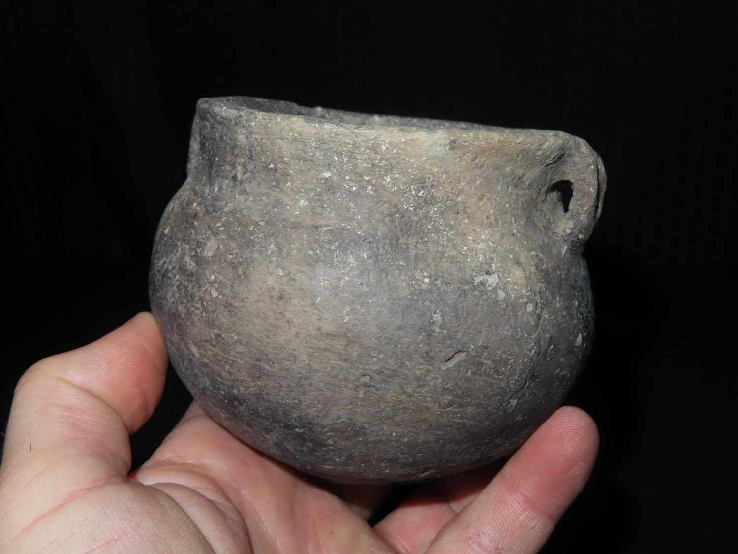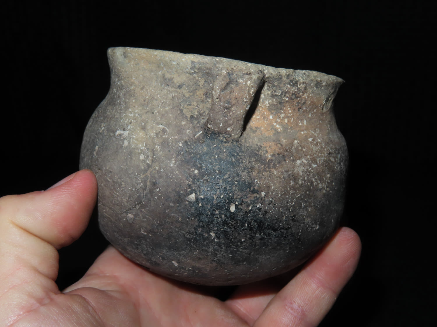 4″ dia. Miniature Strap Handle Mississippian Pottery Jar, found in Gibson Co Indiana, appears to have bottom repair, Ex Randall Kimbrell Collection **ALL POTTERY WILL INCUR FLAT $40 SHIPPING CHARGE PER LOT**