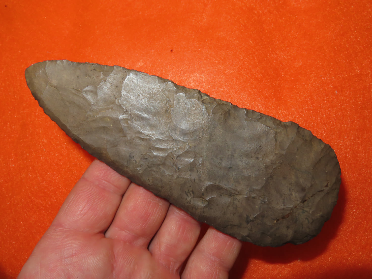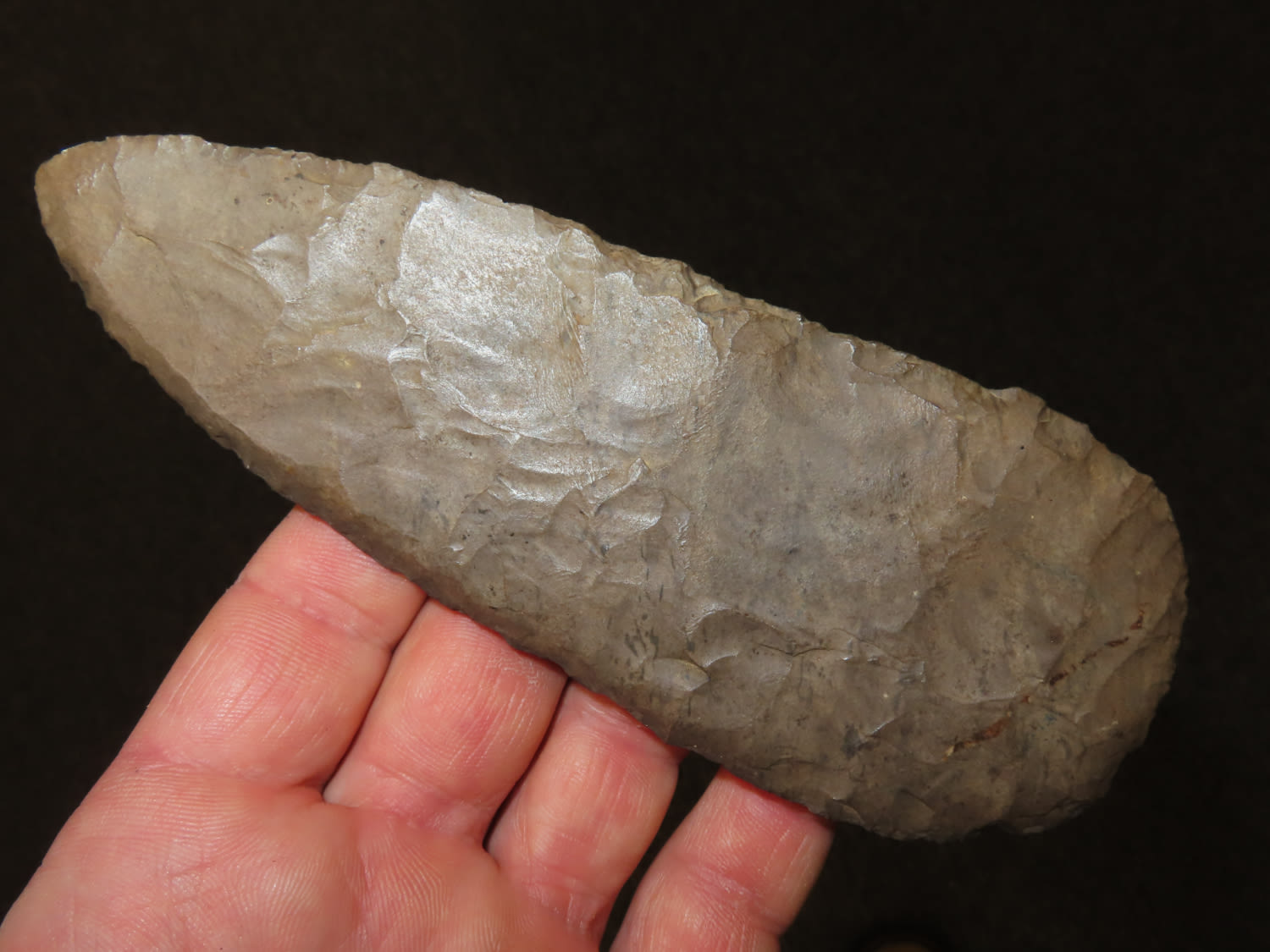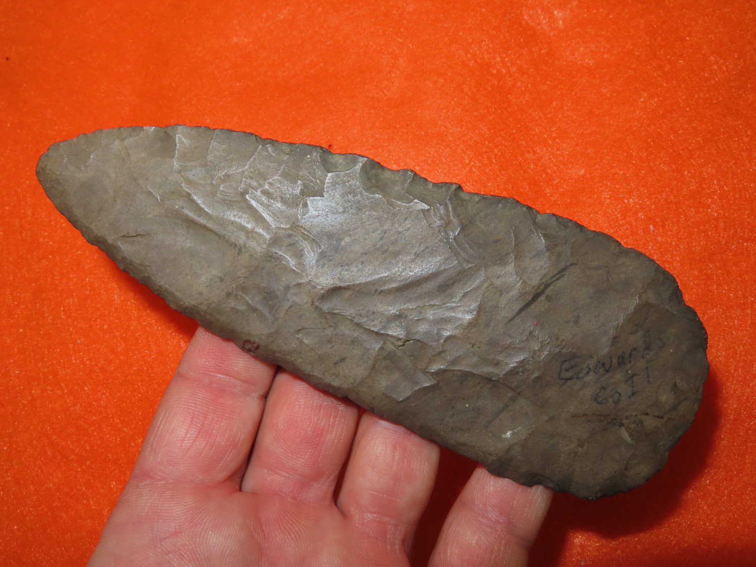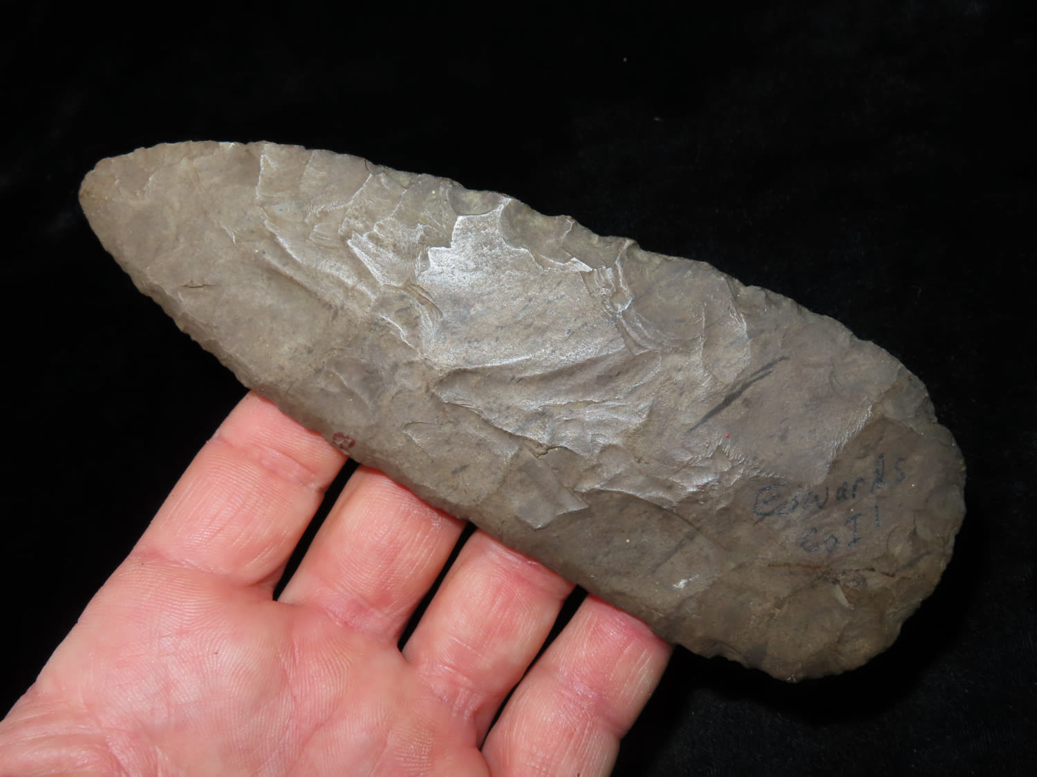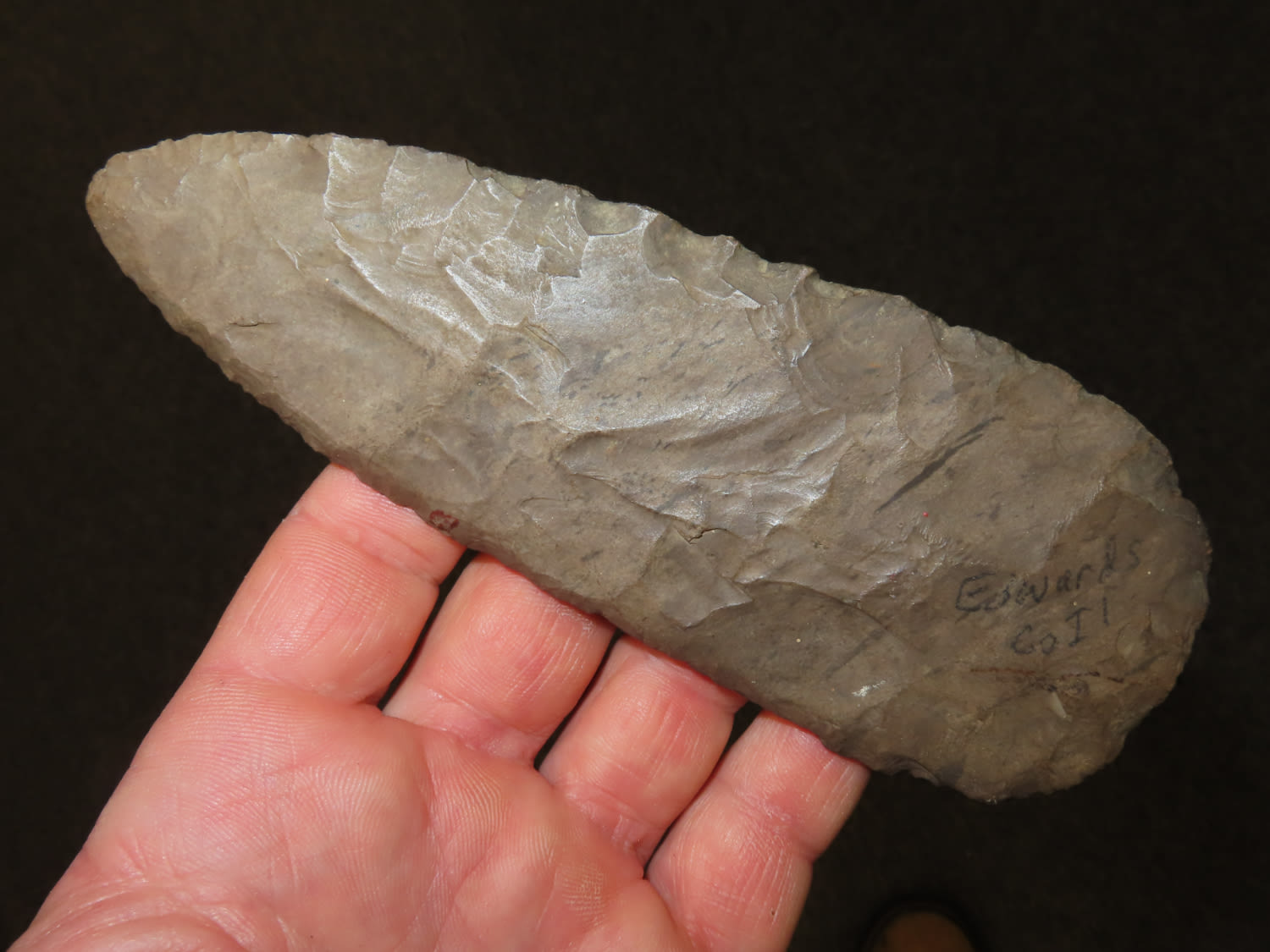 5 15/16″ Beveled Cobbs Blade Made of Dover Chert, found in Edwards Co Illinois by a school teacher, Ex Randall Kimbrell Collection