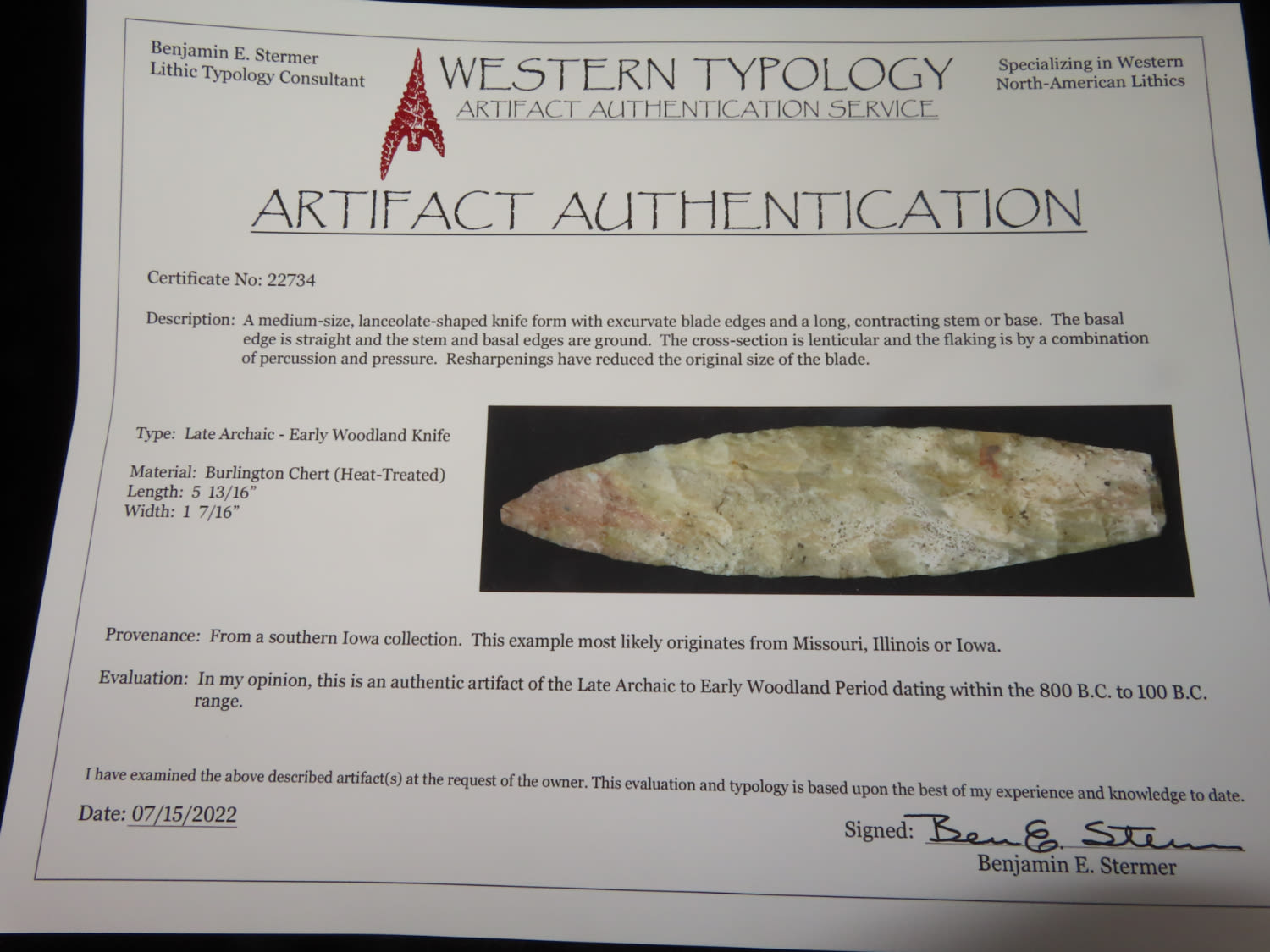 5 16/16″ Late Archaic/Early Woodland Knife, Stermer COA, from a collection in Southern Iowa