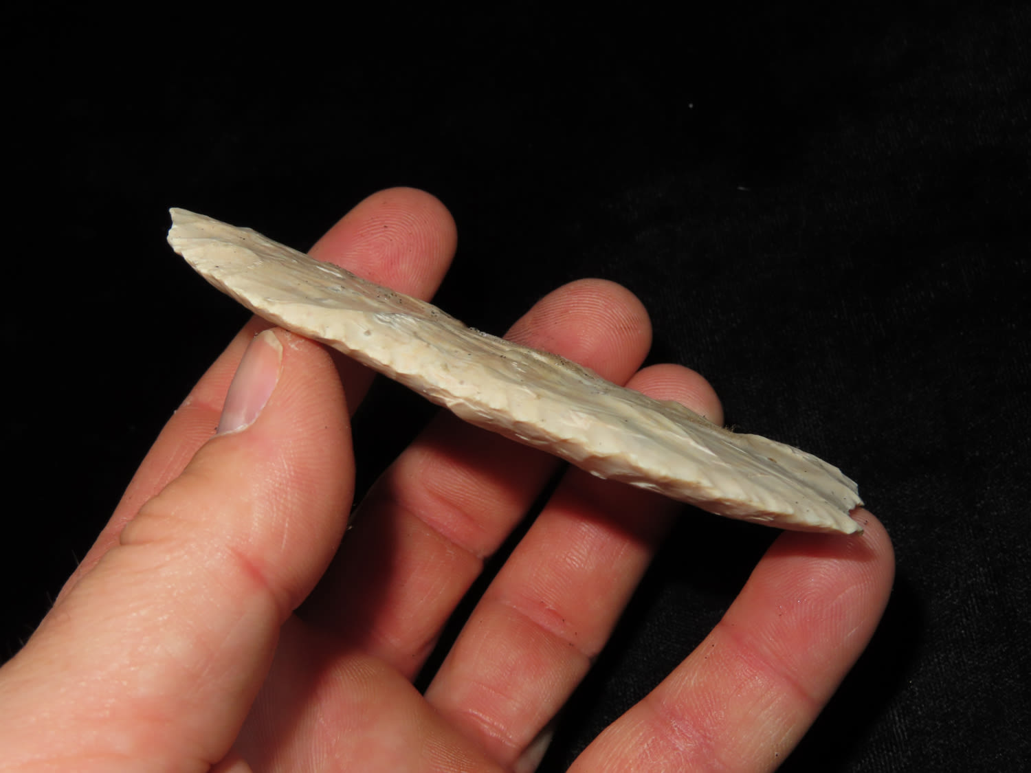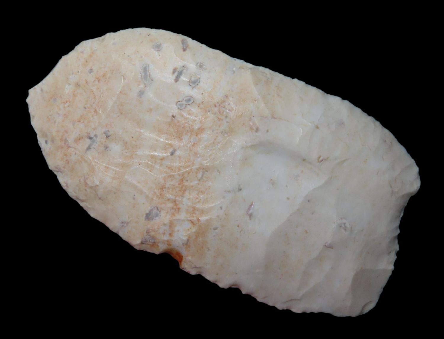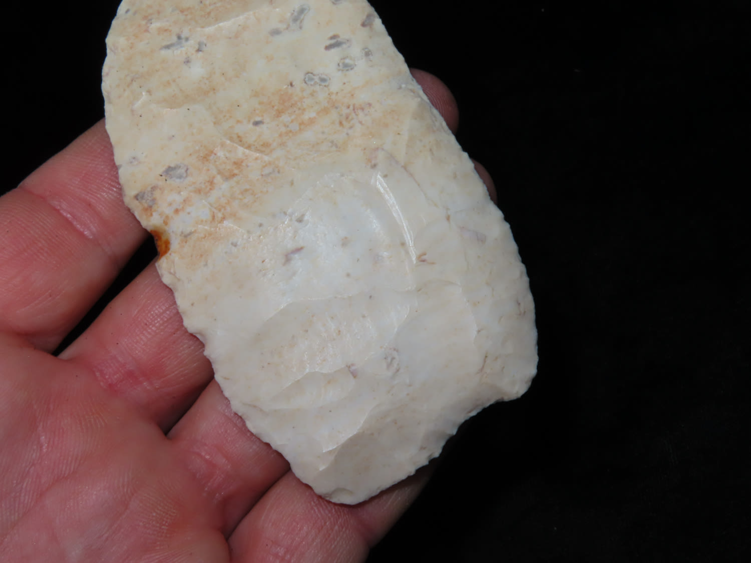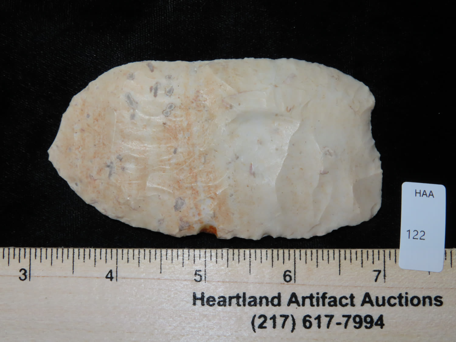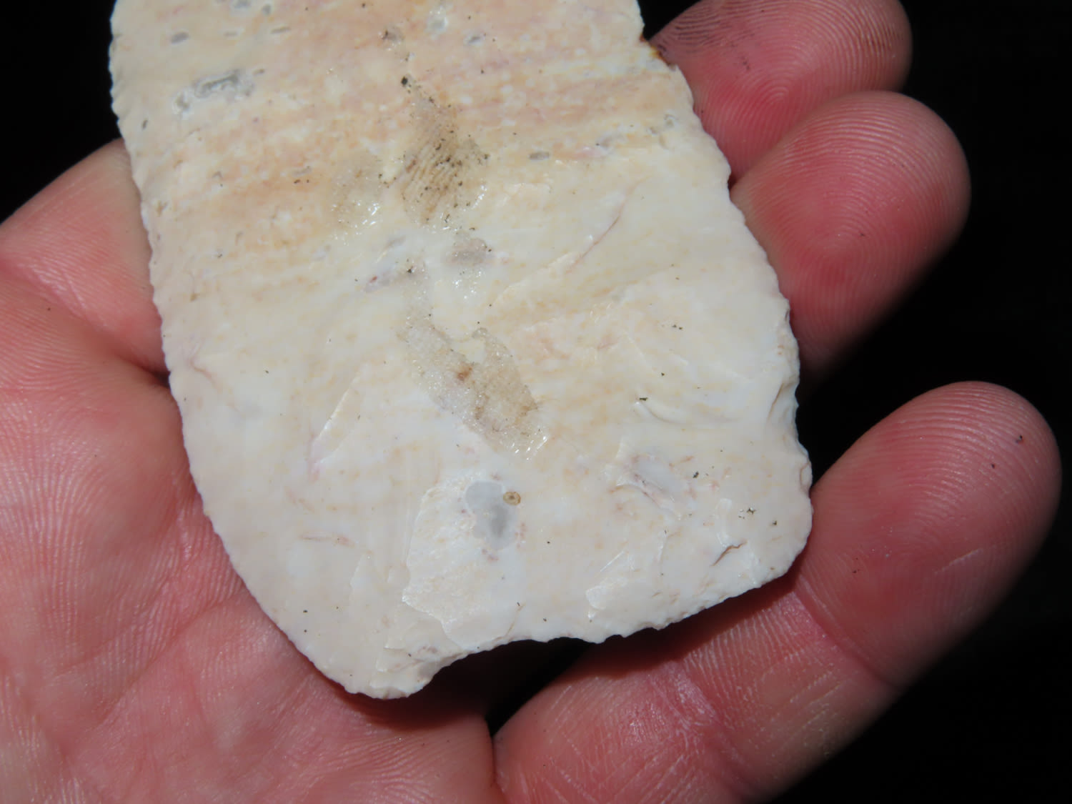 3 7/8″ Fluted Clovis Knife, made of creek stained Burlington Chert, found in White Co Illinois, Ex Randall Kimbrell Collection