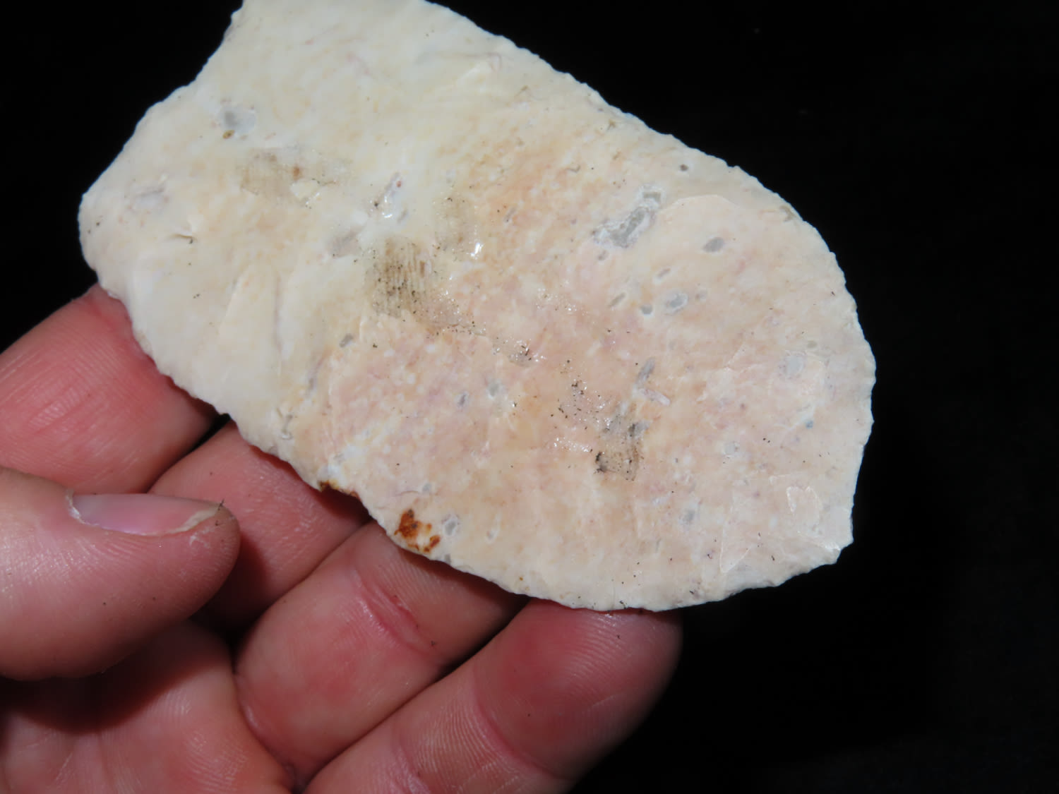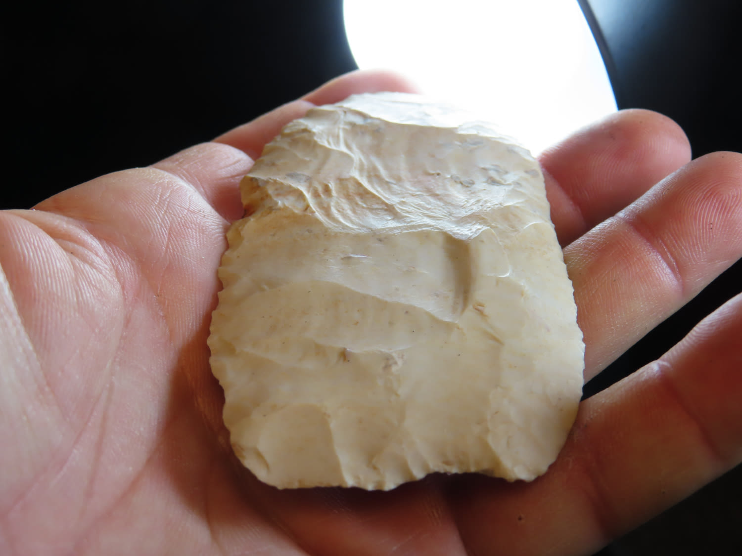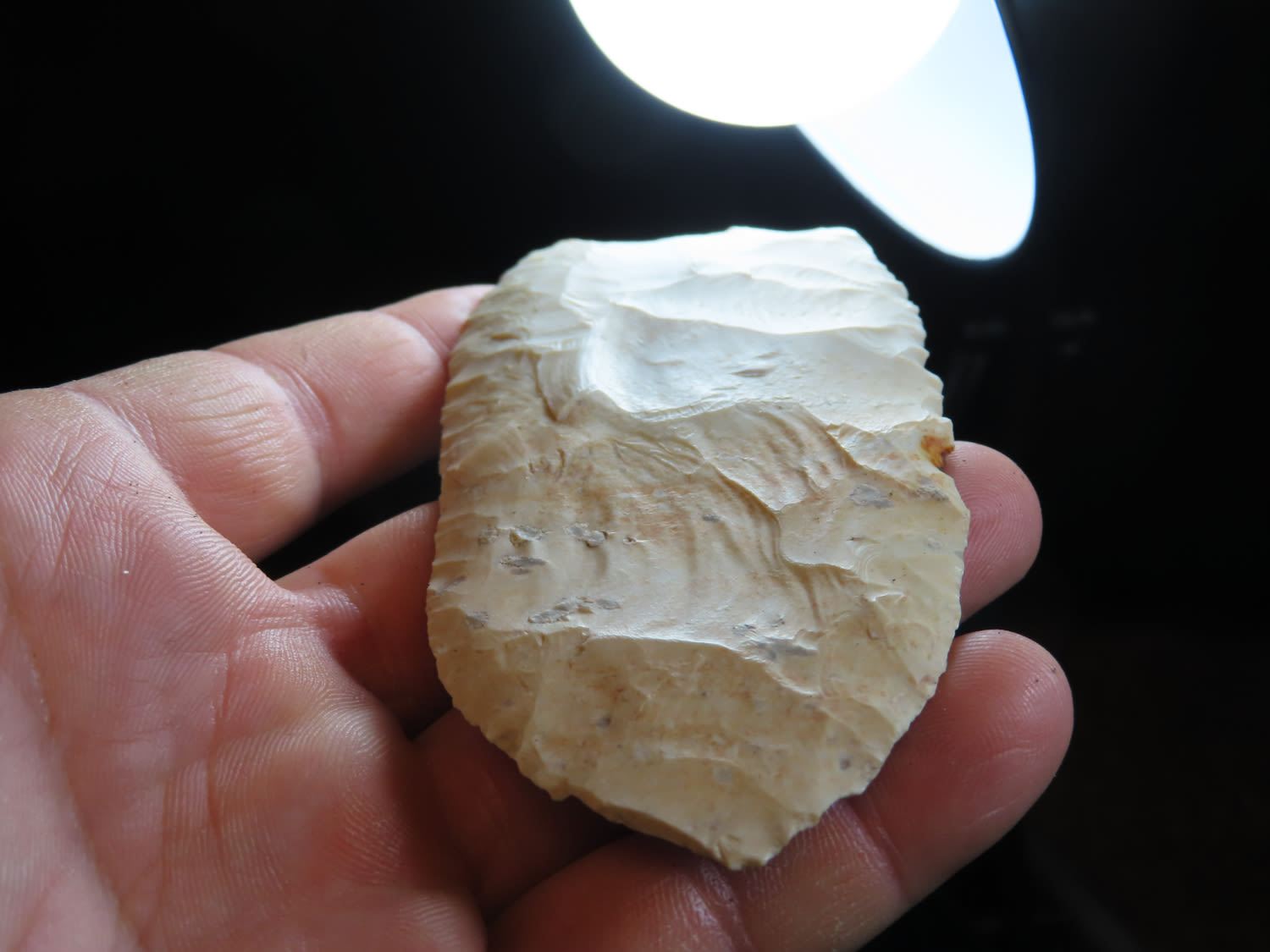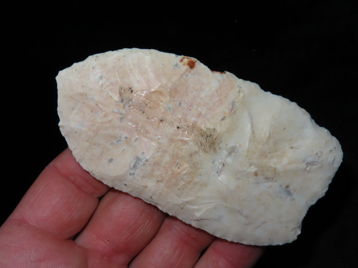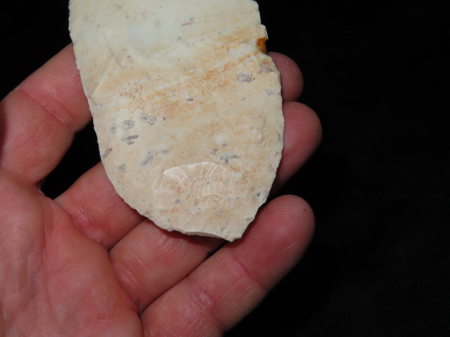 3 7/8″ Fluted Clovis Knife, made of creek stained Burlington Chert, found in White Co Illinois, Ex Randall Kimbrell Collection