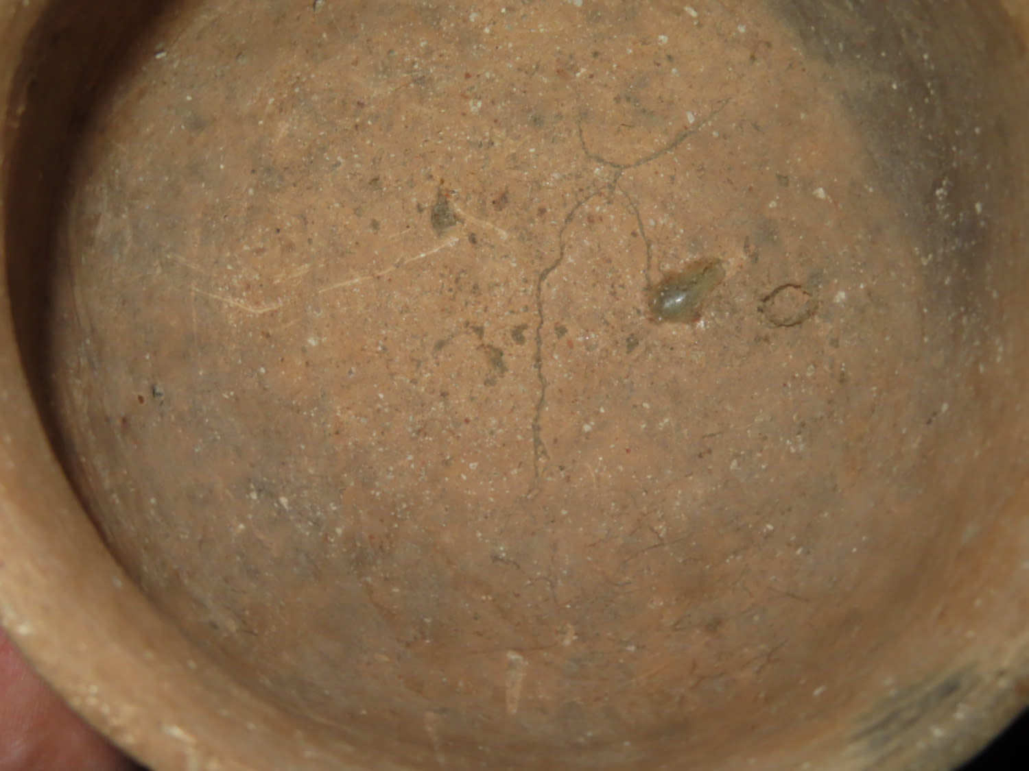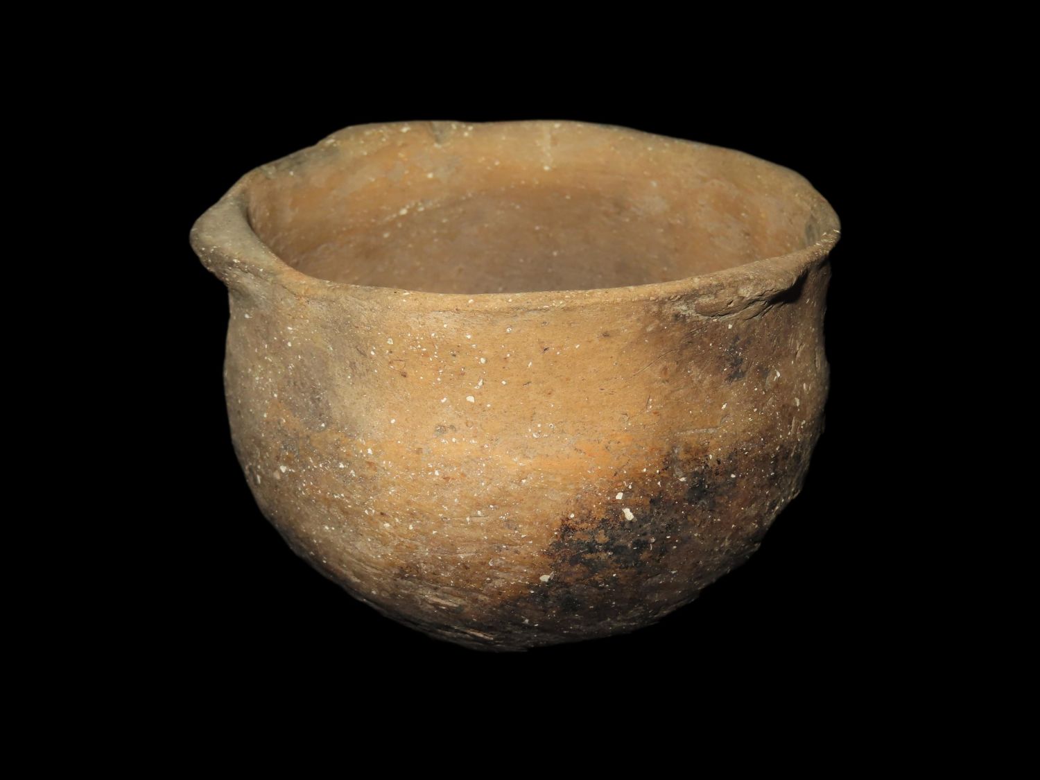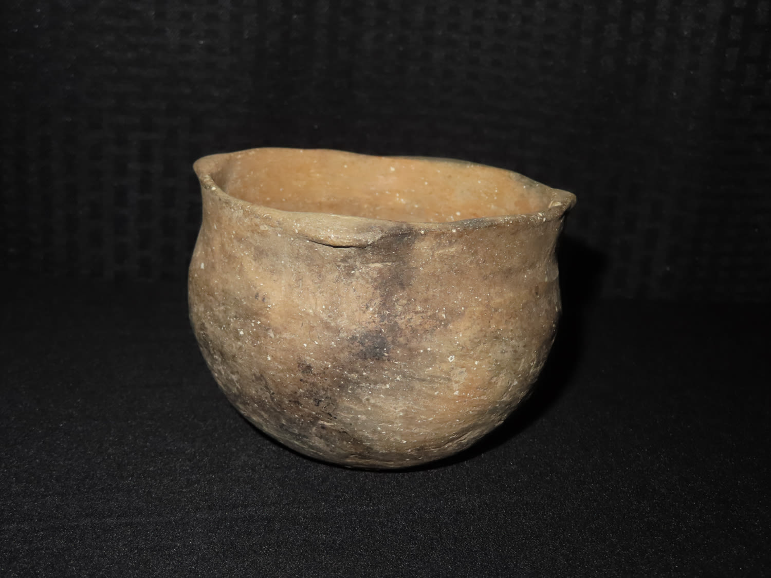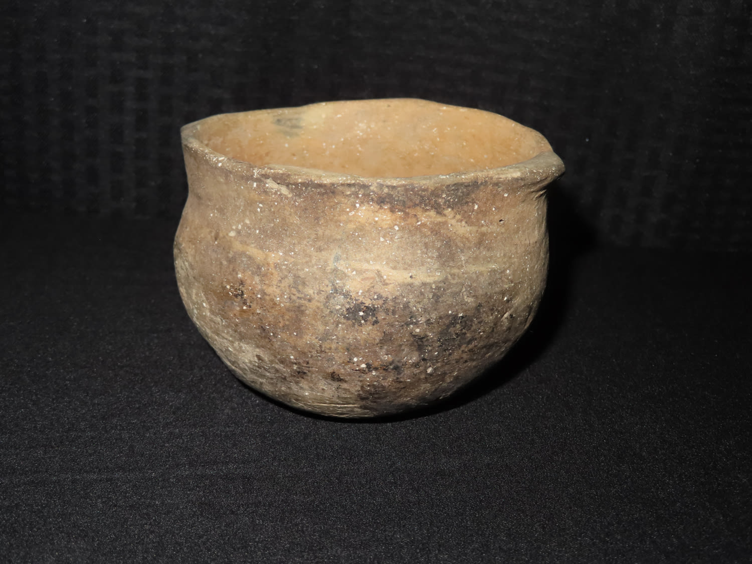 5″ dia. Mississippian Jar, with 4 Lug Handles decorate the rim, nice coloring, bottom repair, Ex Randall Kimbrell Collection **ALL POTTERY WILL INCUR FLAT $40 SHIPPING CHARGE PER LOT**