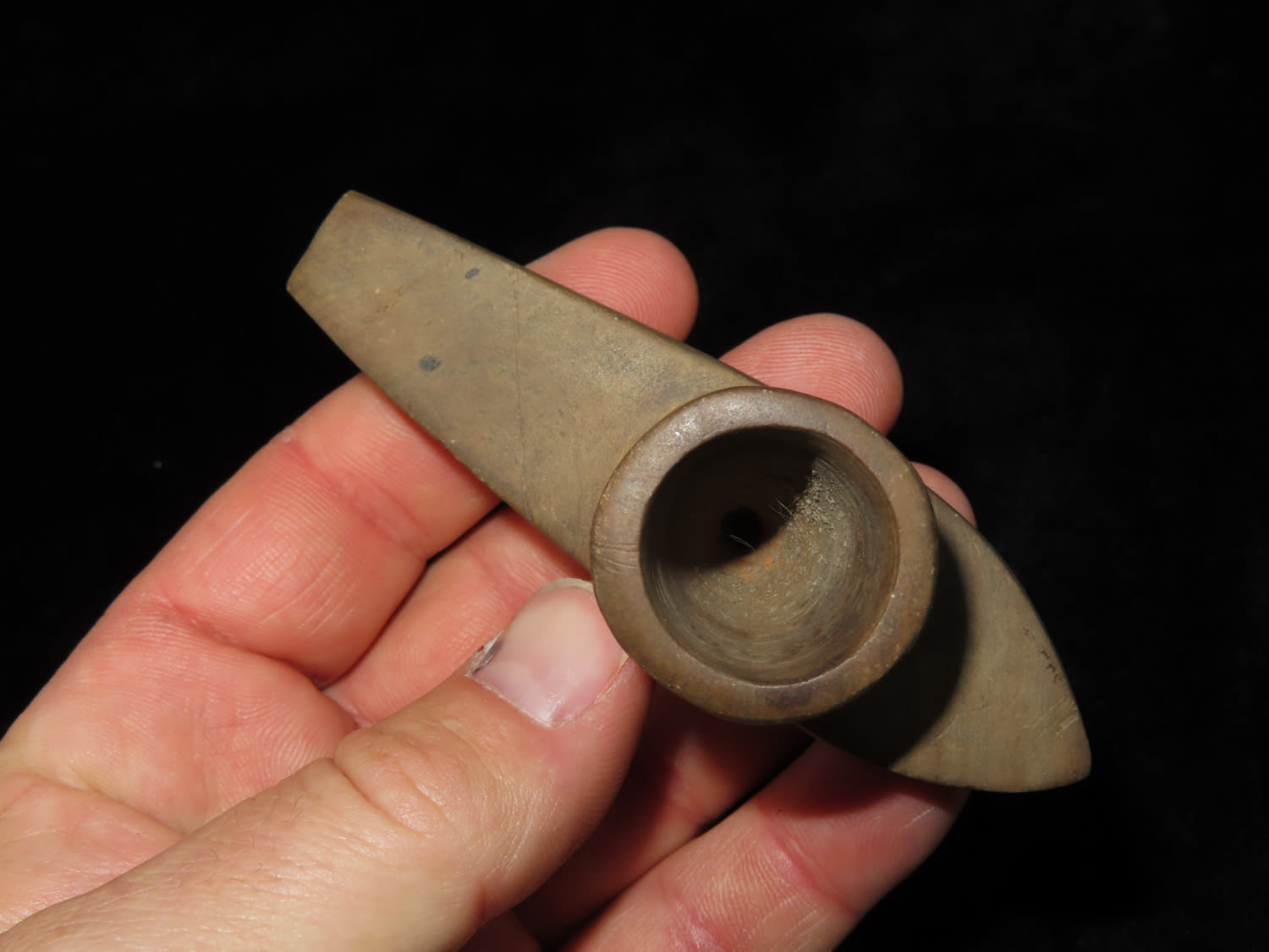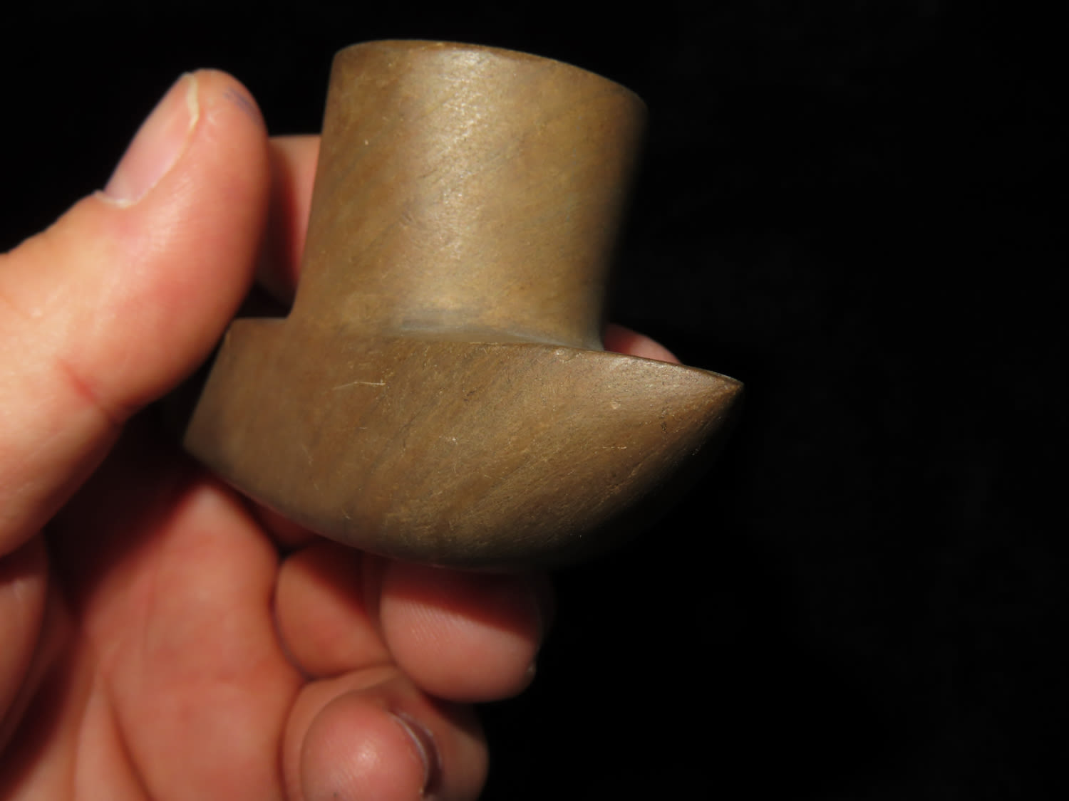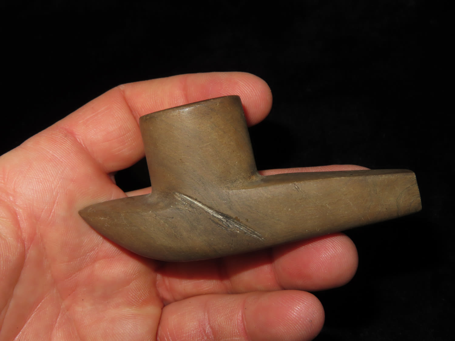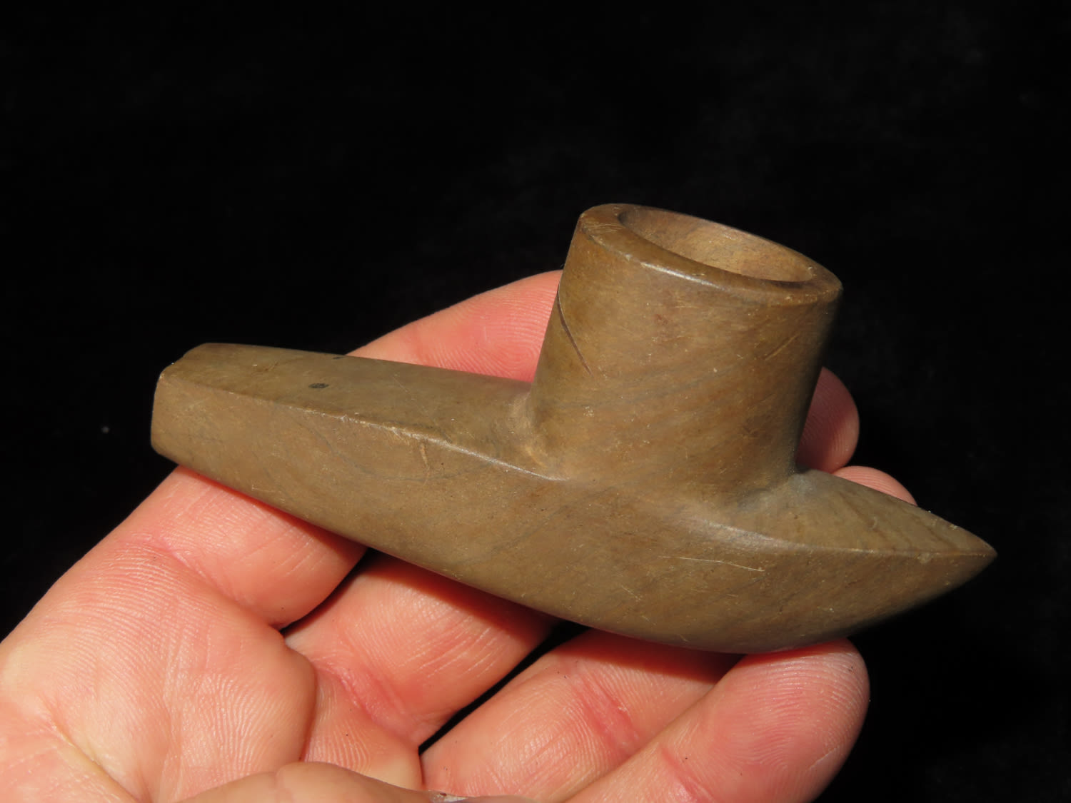 3 3/4″ Woodland Period Pipe Pictured in Lar Hothem “Ornamental Artifacts” page 120. , Made of Brown Hardstone, Nicely Polished, with Boat Shape platform, Ex Norbert Bingman, found in Southeastern Illinois, Ex Randall Kimbrell Collection
