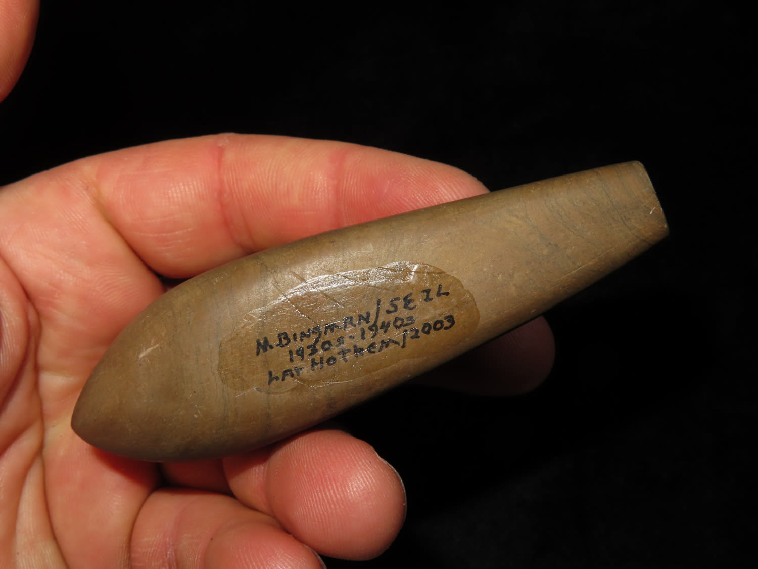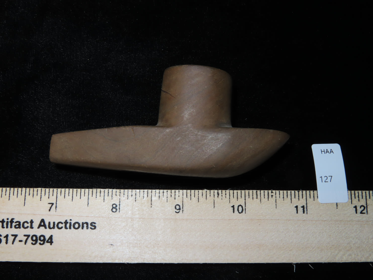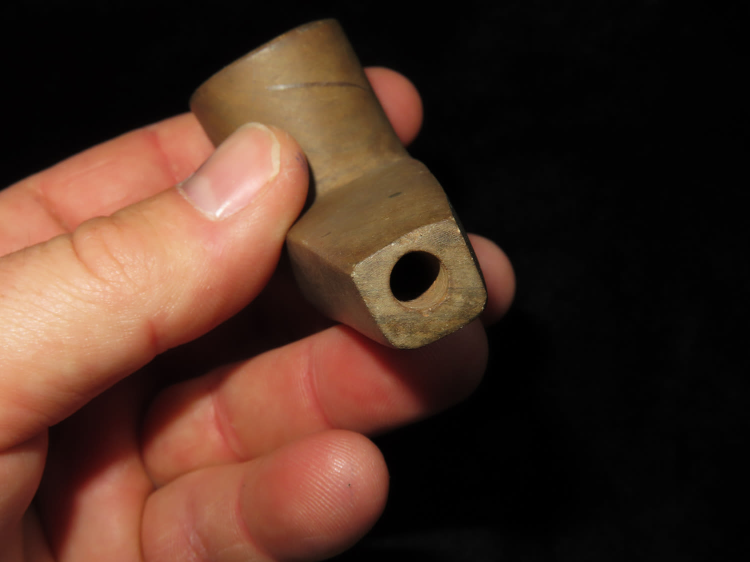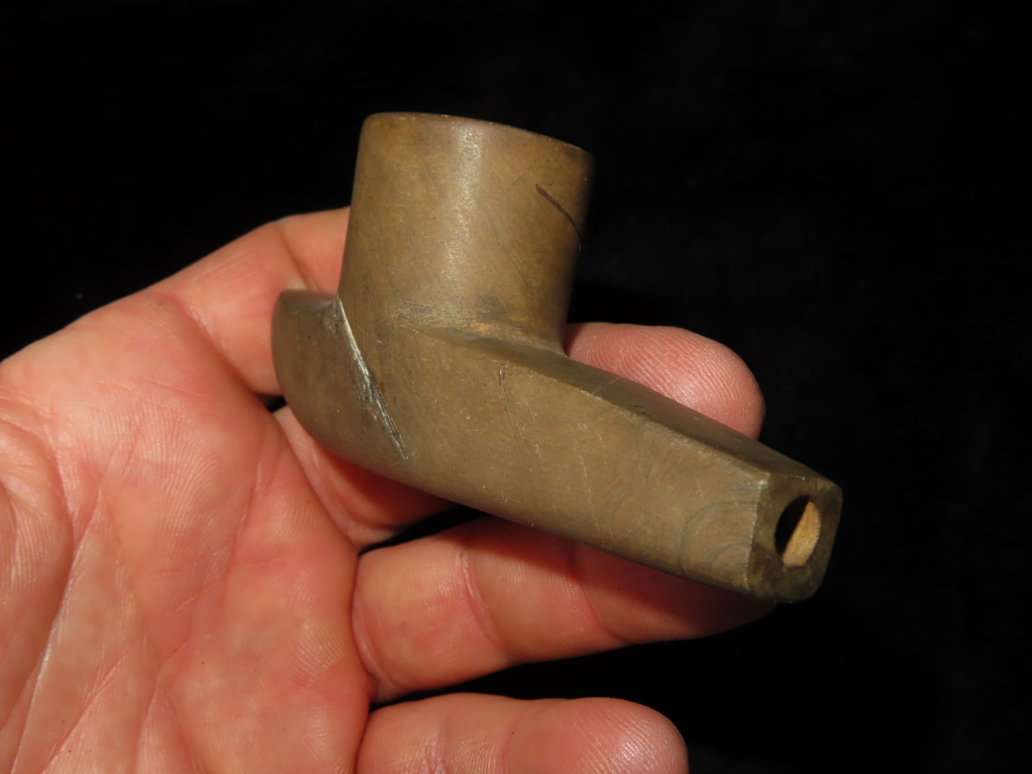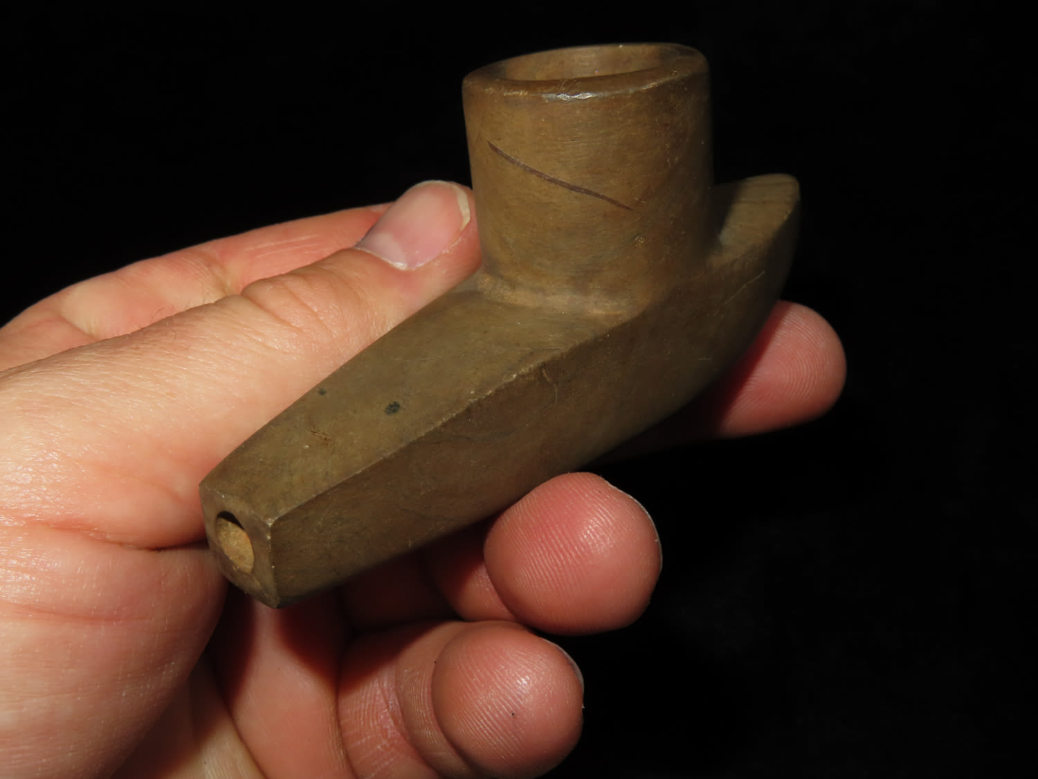 3 3/4″ Woodland Period Pipe Pictured in Lar Hothem “Ornamental Artifacts” page 120. , Made of Brown Hardstone, Nicely Polished, with Boat Shape platform, Ex Norbert Bingman, found in Southeastern Illinois, Ex Randall Kimbrell Collection