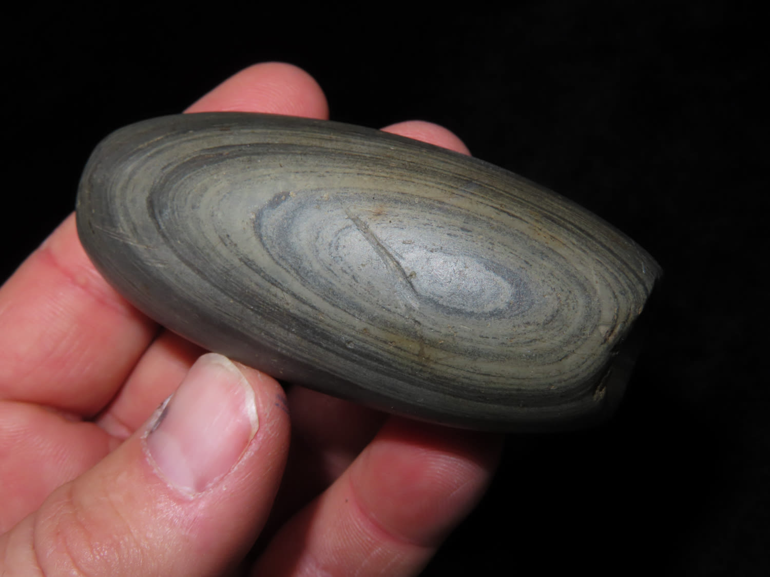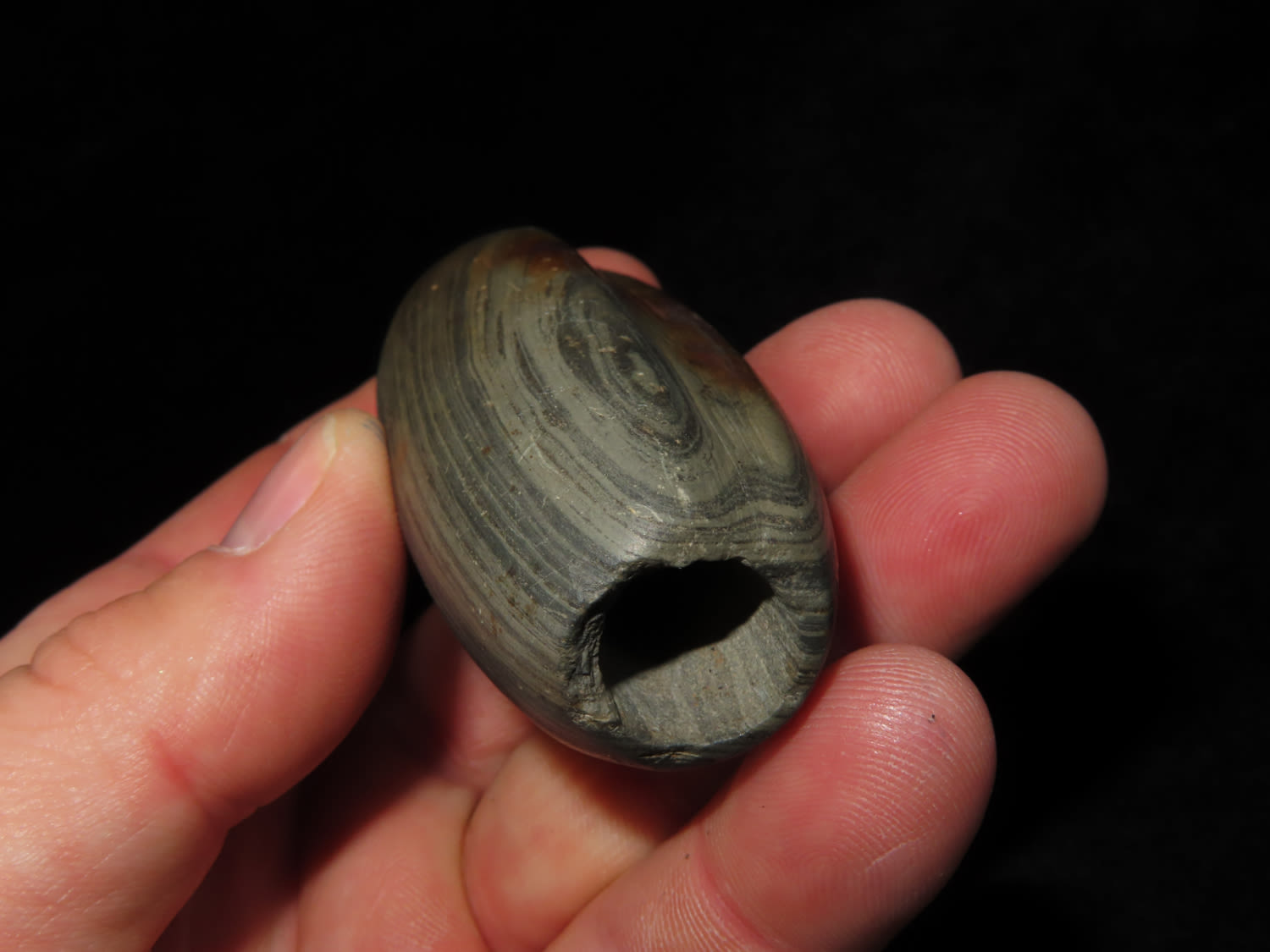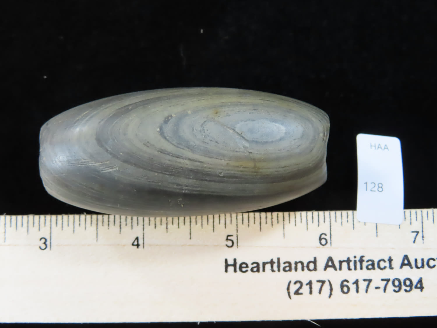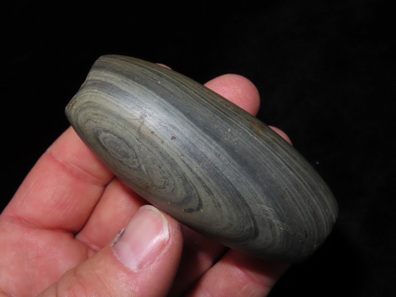 2 3/4″ Fluted Tube Bannerstone of Banded Slate, found in Franklin Co Indiana, Ex Randall Kimbrell Collection