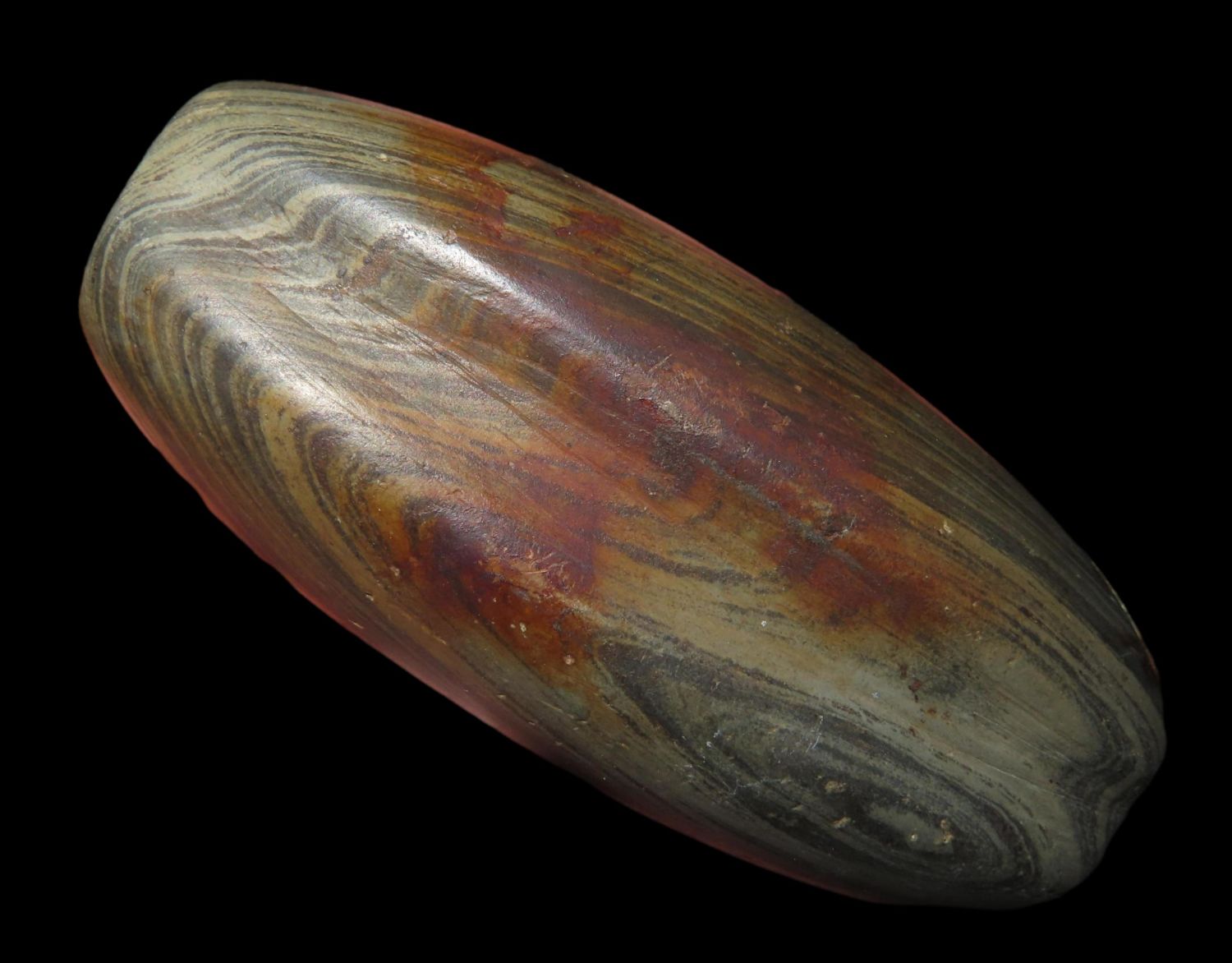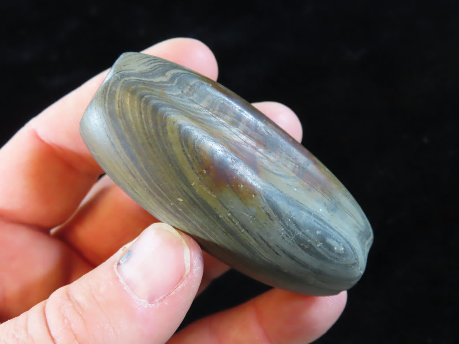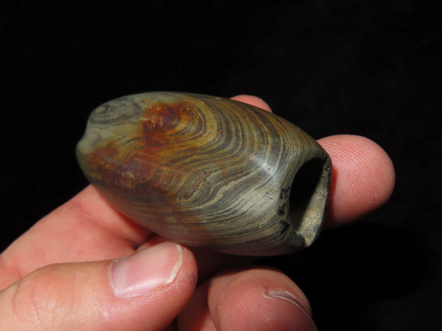 2 3/4″ Fluted Tube Bannerstone of Banded Slate, found in Franklin Co Indiana, Ex Randall Kimbrell Collection