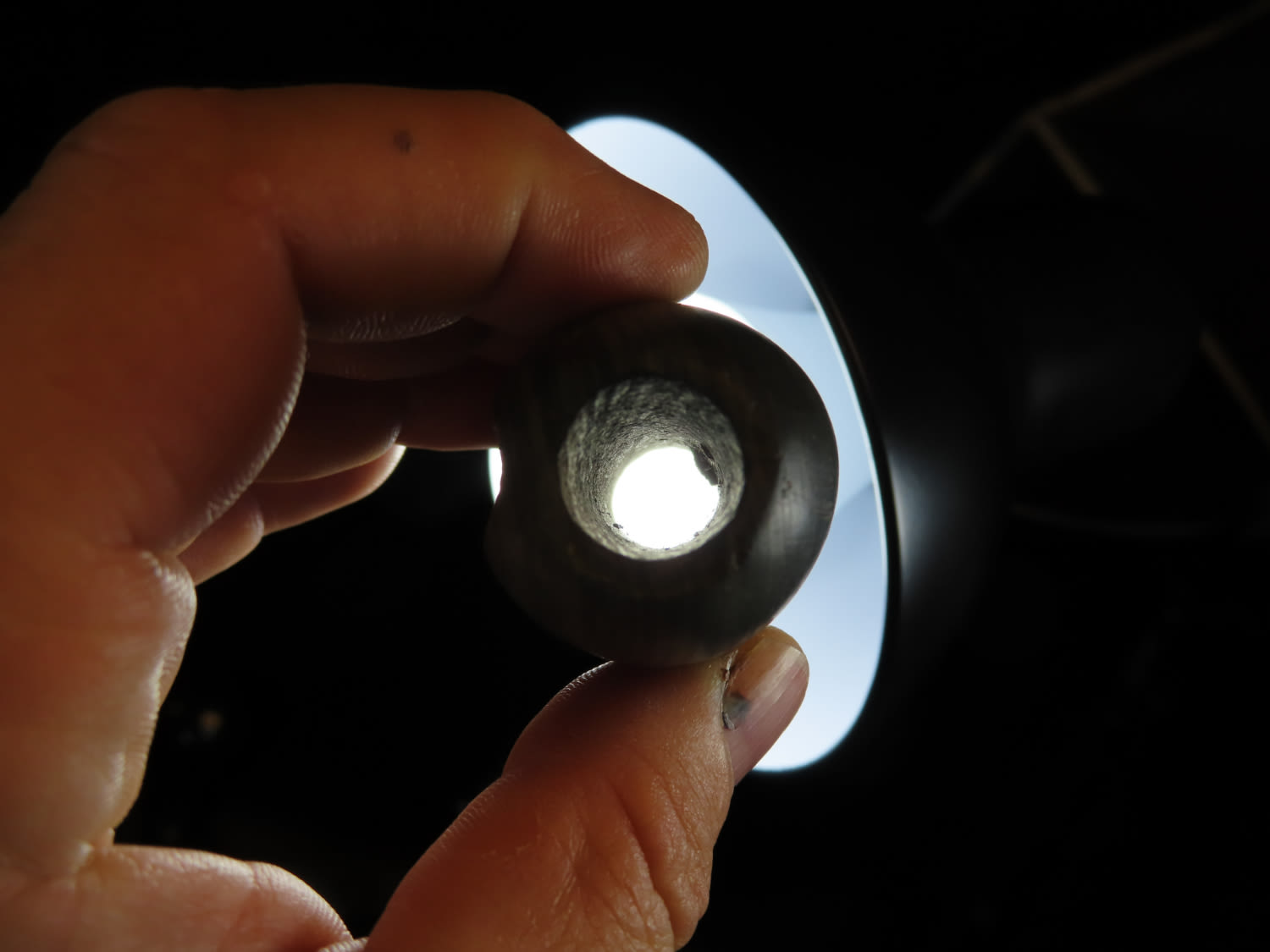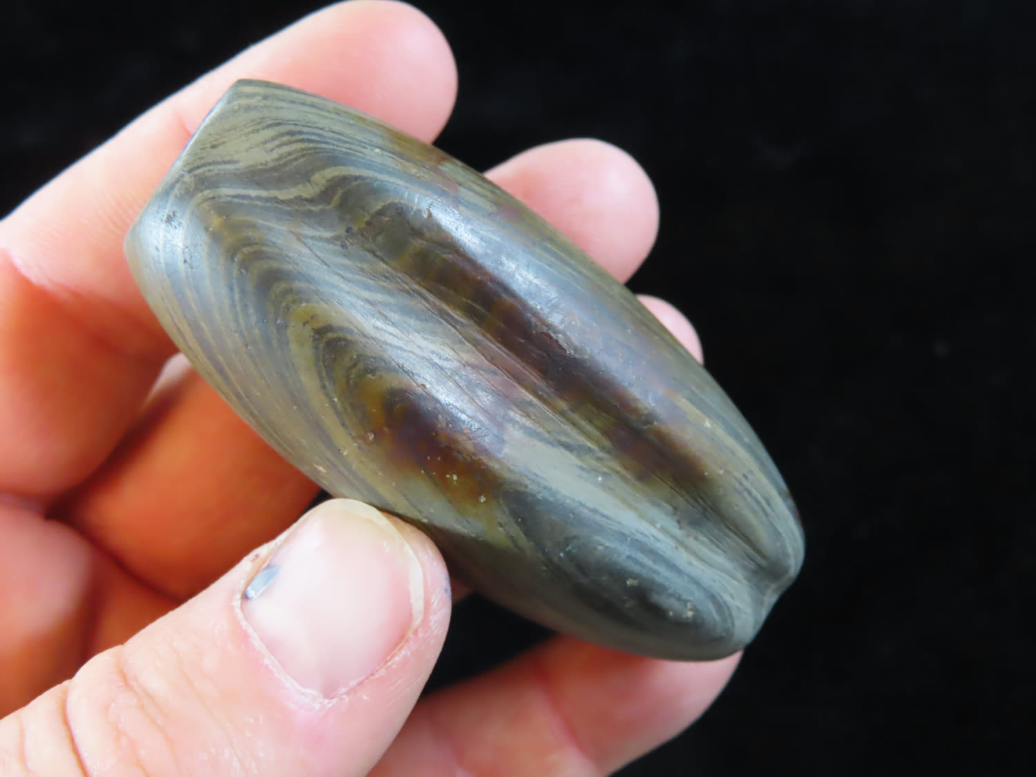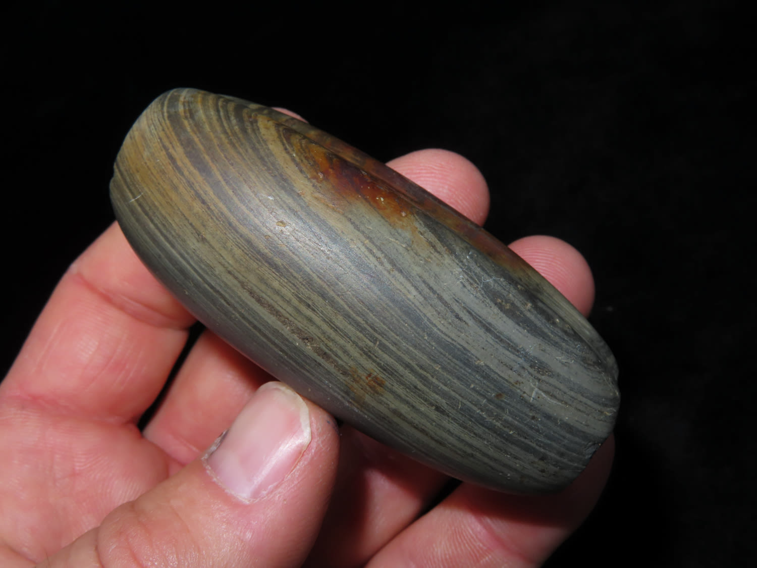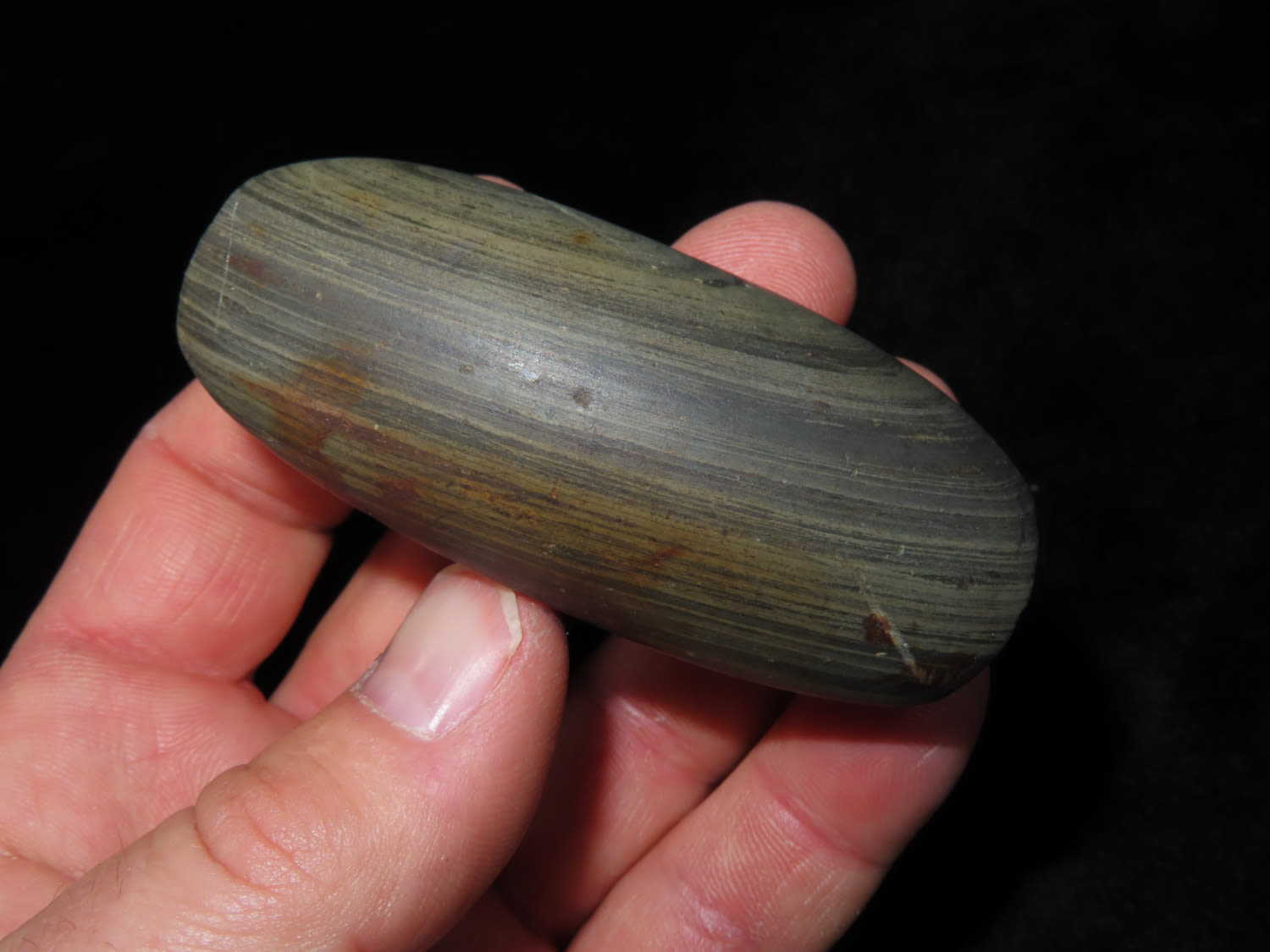 2 3/4″ Fluted Tube Bannerstone of Banded Slate, found in Franklin Co Indiana, Ex Randall Kimbrell Collection