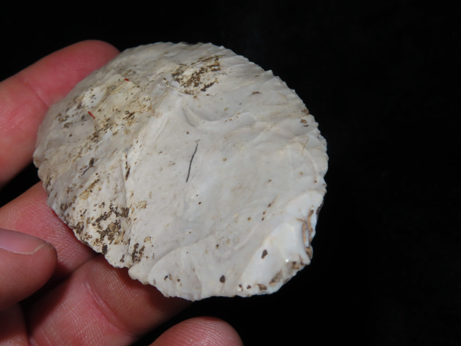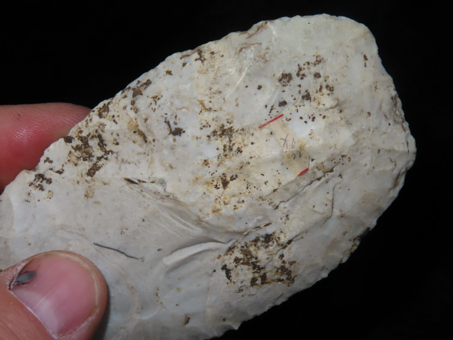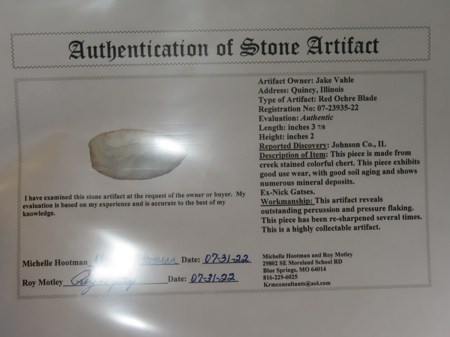3 7/8″ Red Ochre Blade, Motley COA, found in Johnson Co, Illinois, Ex Nick Gatses Collection