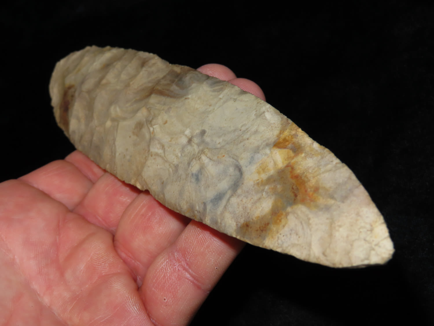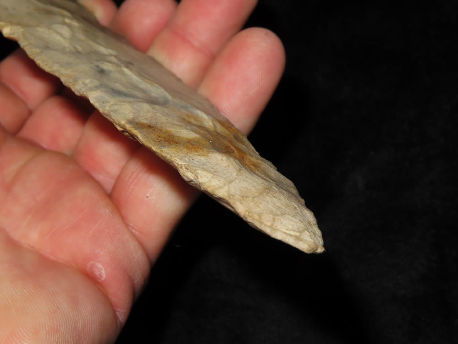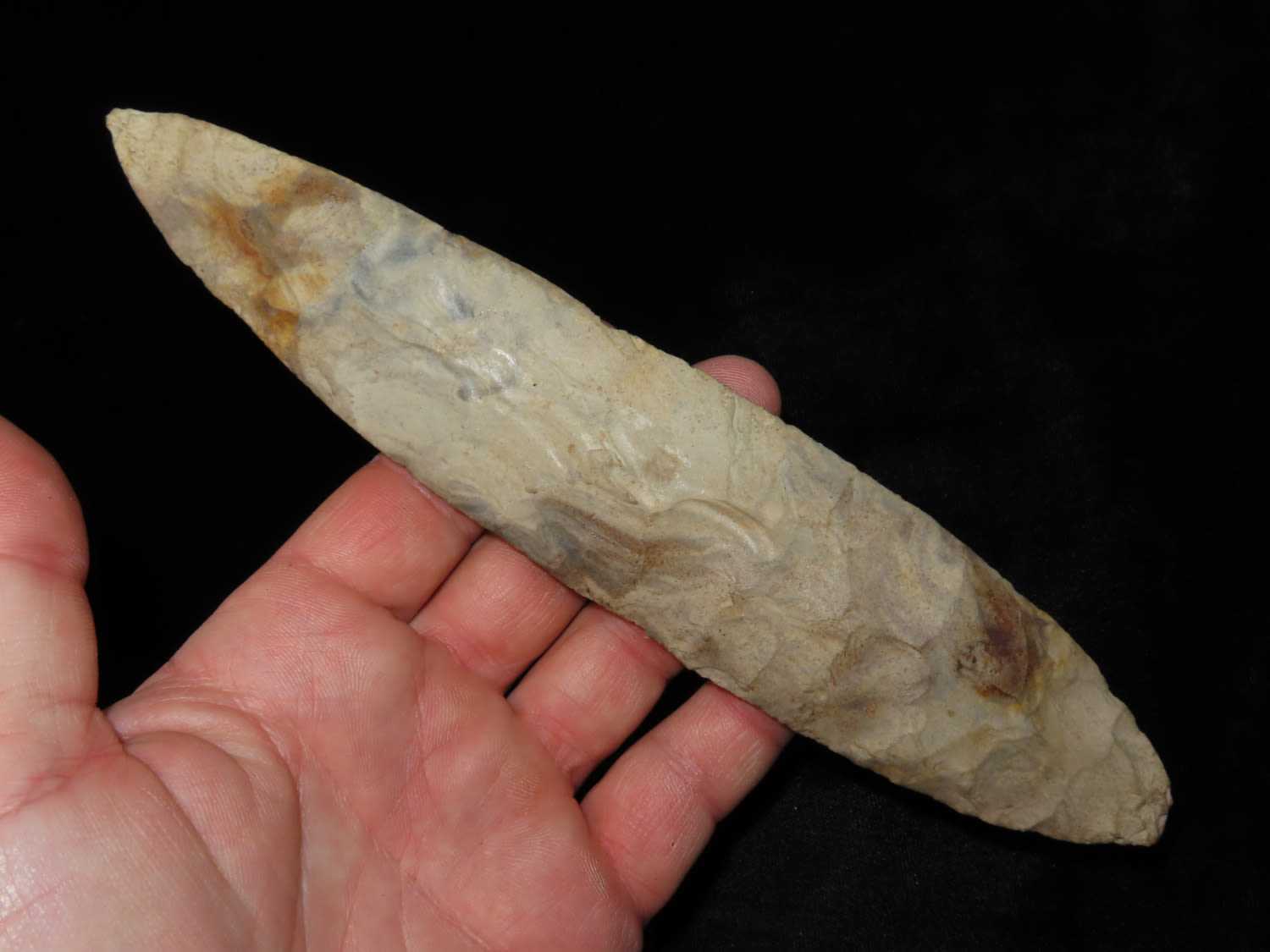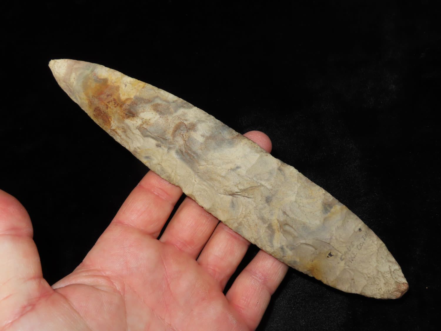 8 5/16″ Black Sand Adena Knife, found in Pike Co Indiana by Derek Gatewood, Exceptional Size and Color on piece with great overall presence, Ex Randall Kimbrell Collection