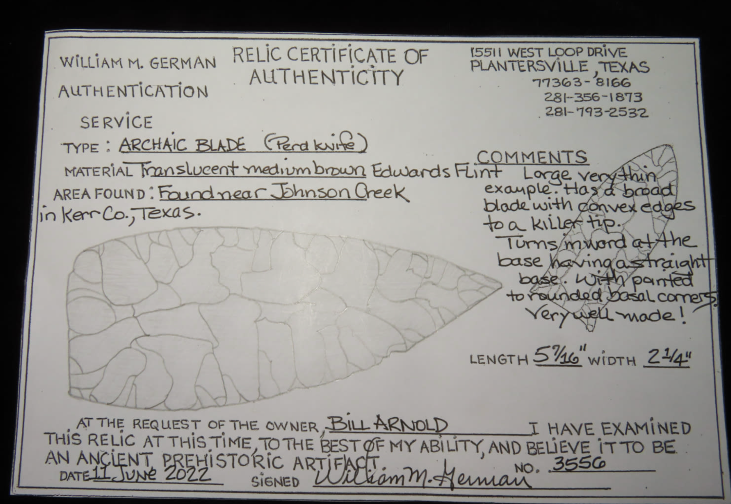 5 1/16″ Archaic Blade (Perd Knife), German COA, found near Johnson Creek, Kerr Co Texas