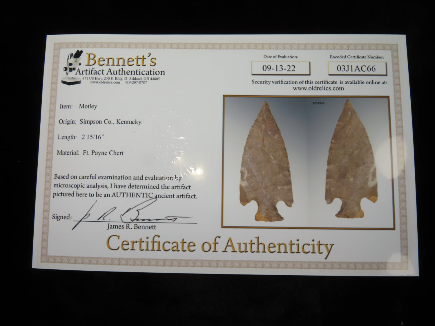 2 15/16″ Motley, Bennett COA, Unique Coloration in the Ft Payne Chert material, found in Simpson Co Kentucky