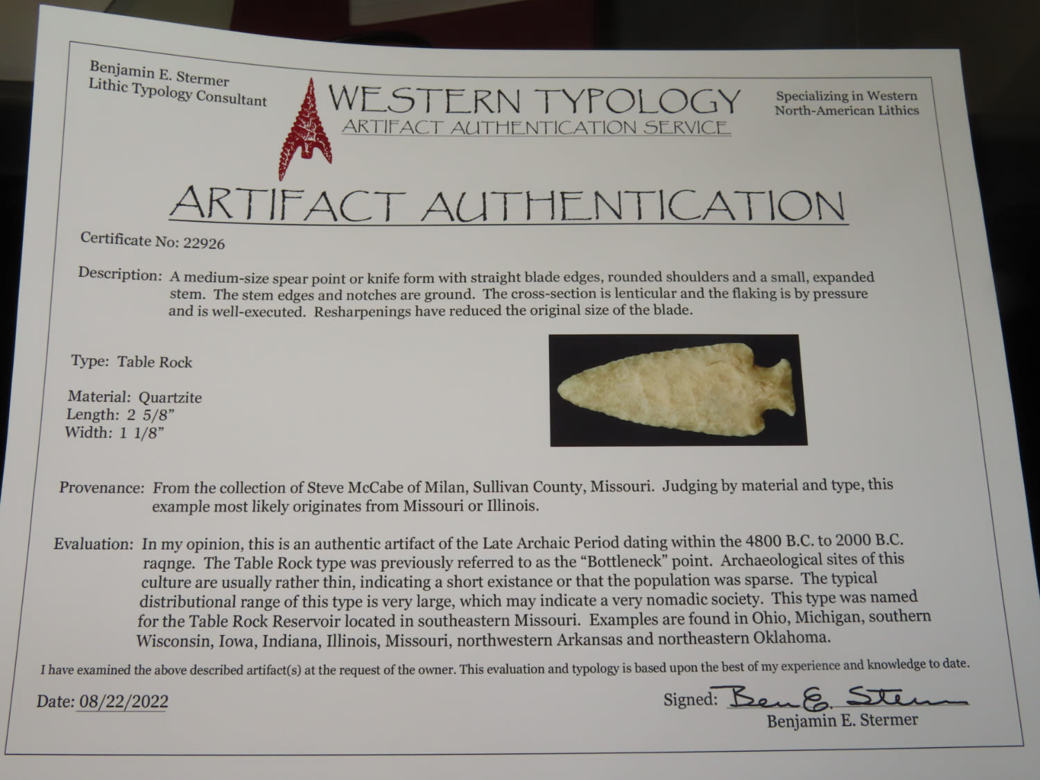 2 5/8″ Quartzite Tabel Rock, Stermer COA, Ex Steve McCabe Collection, Sullivan Co Missouri