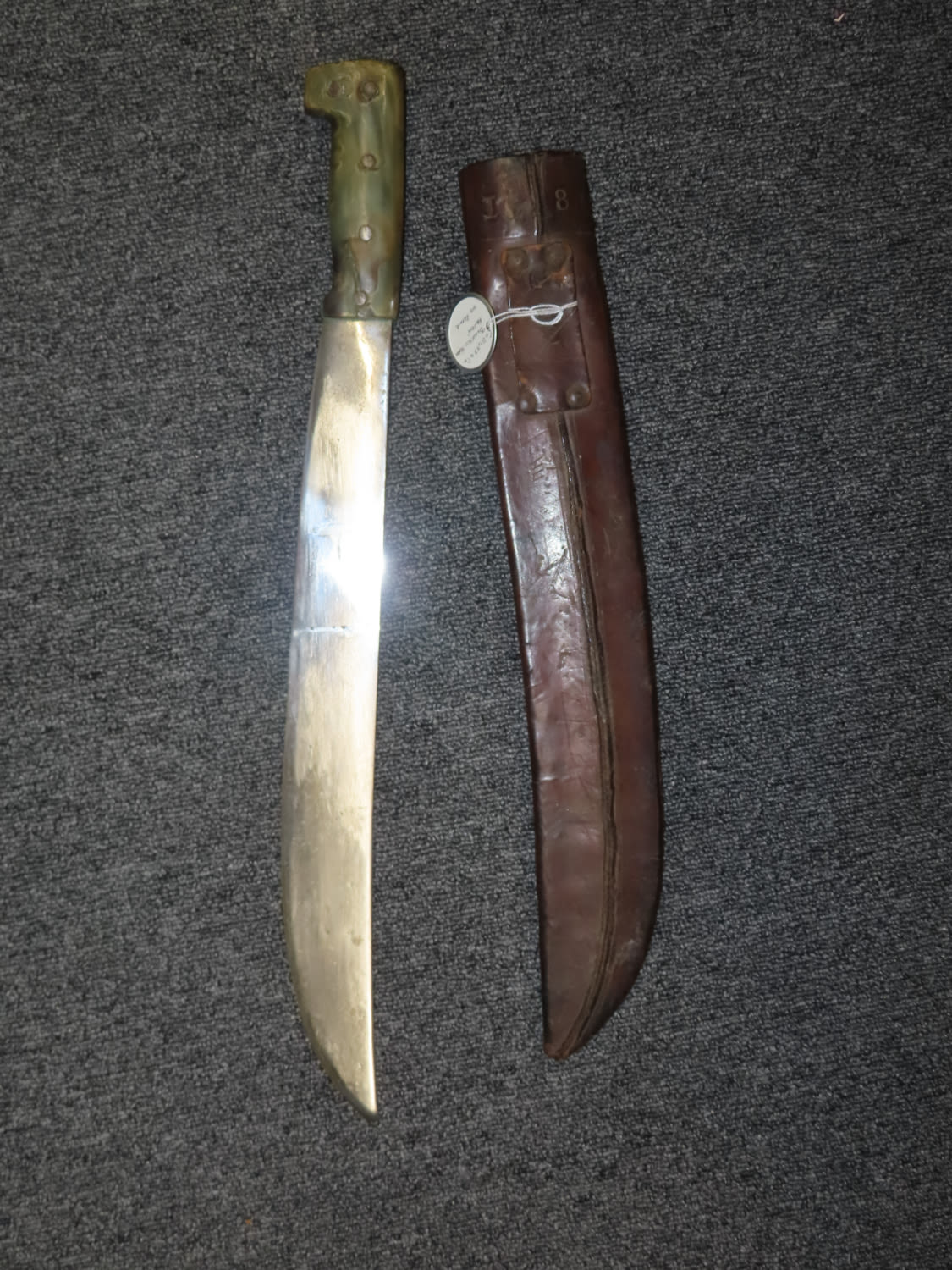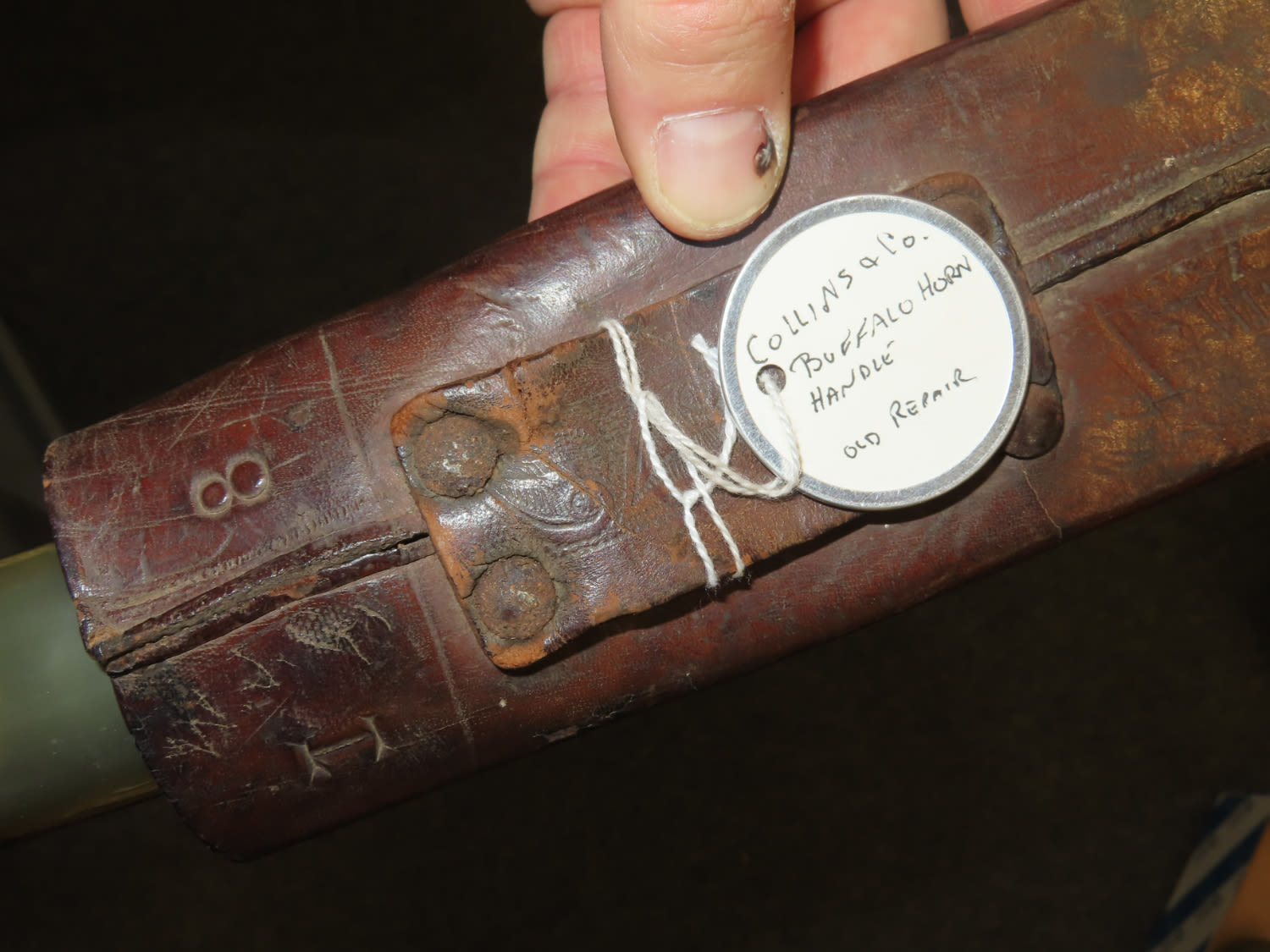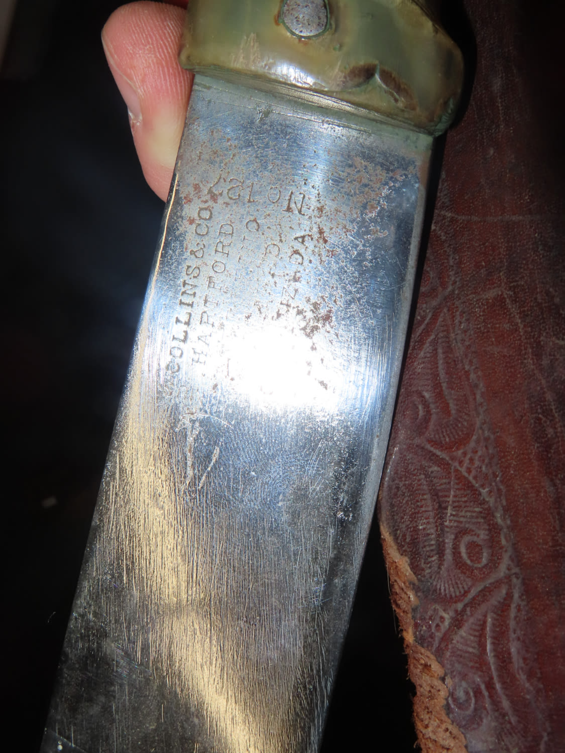 Machete with leather sheath that is designed; Clean blade, Collins and CO., Old repair with sheath; Ex. Randal Ridenour