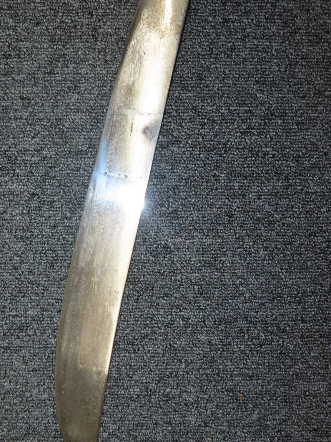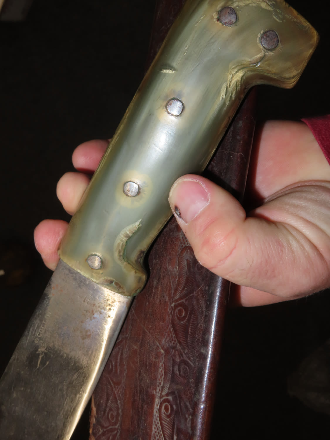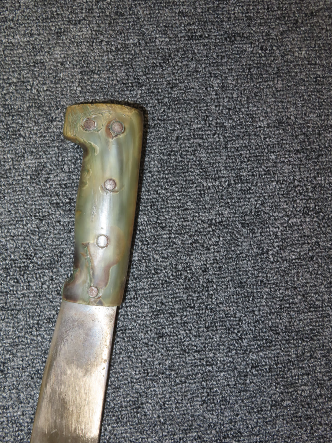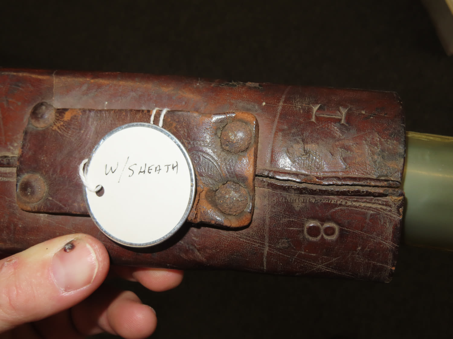 Machete with leather sheath that is designed; Clean blade, Collins and CO., Old repair with sheath; Ex. Randal Ridenour