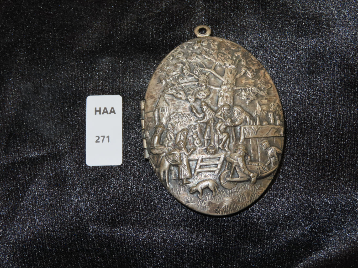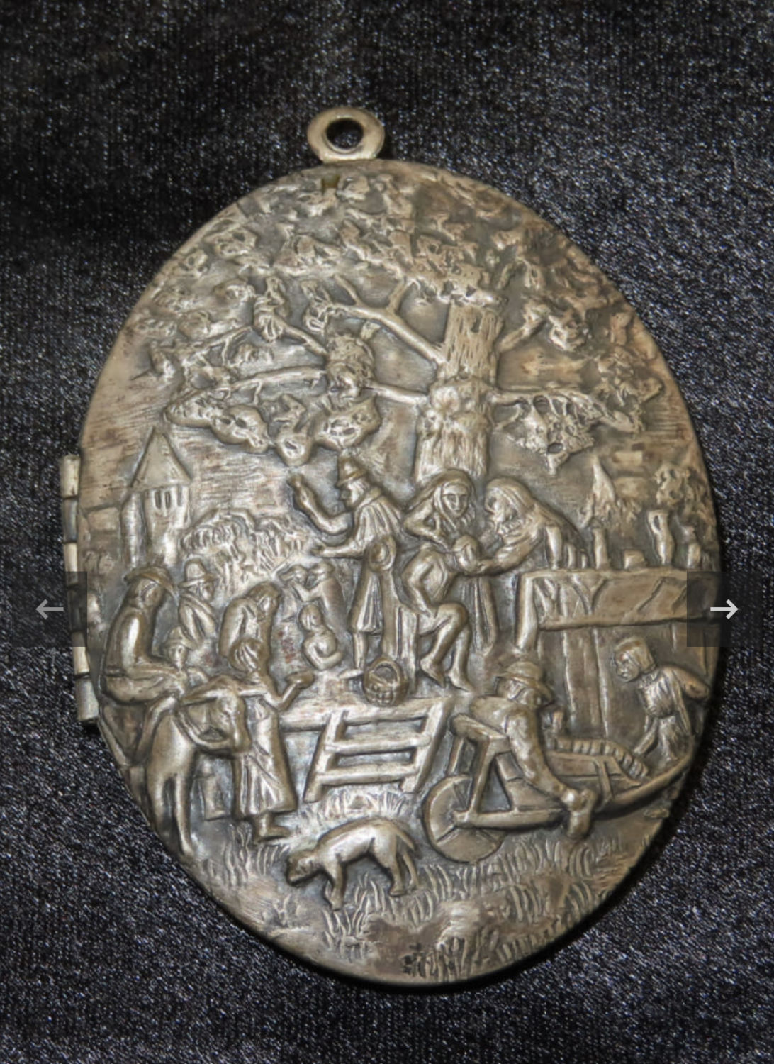 2 1/2″ x 2″ Vintage Whiting Davis Locket with embossed outdoor village scene from approx 1970’s