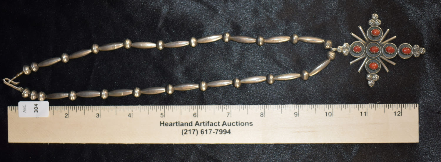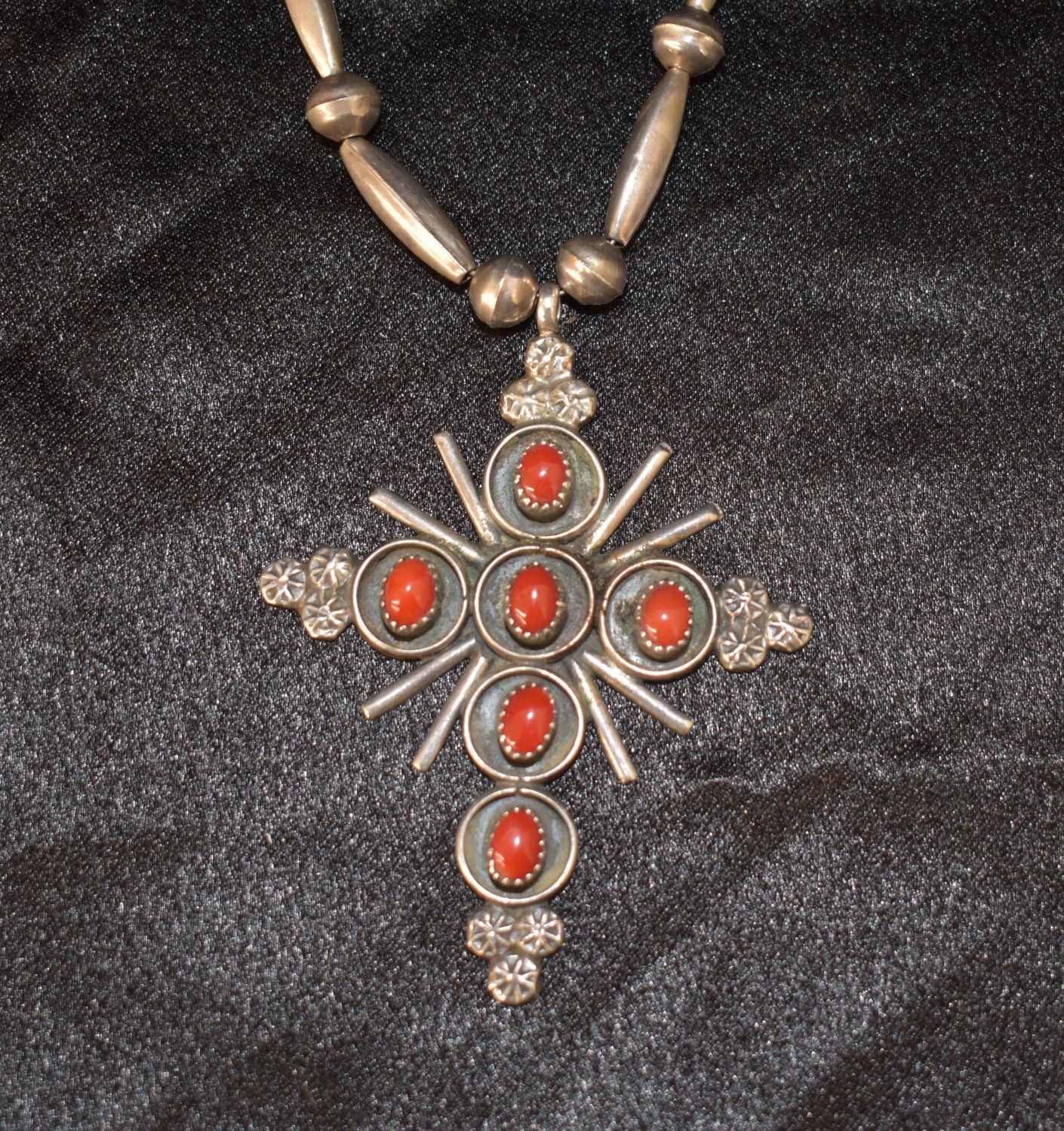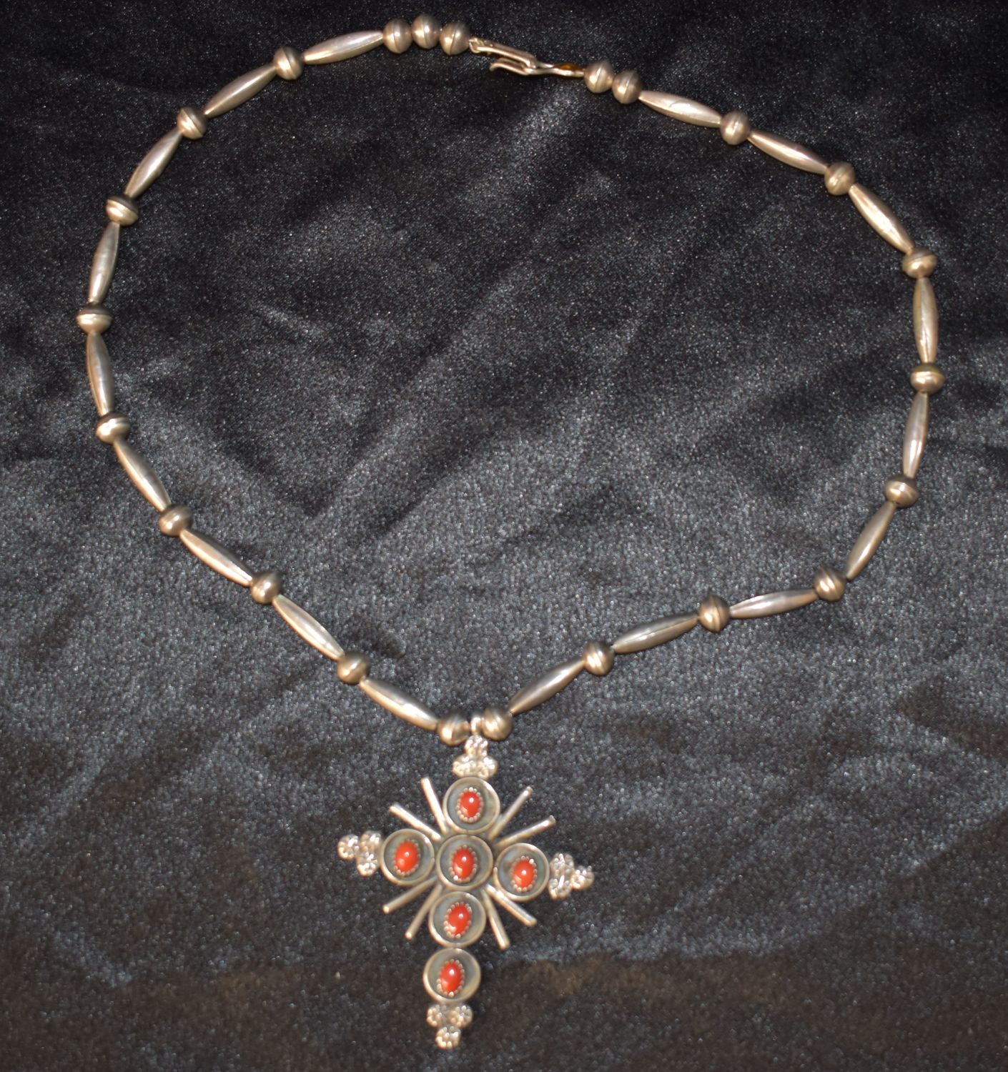 Silver Necklace w/Cross Pendant Adorned with Red Coral