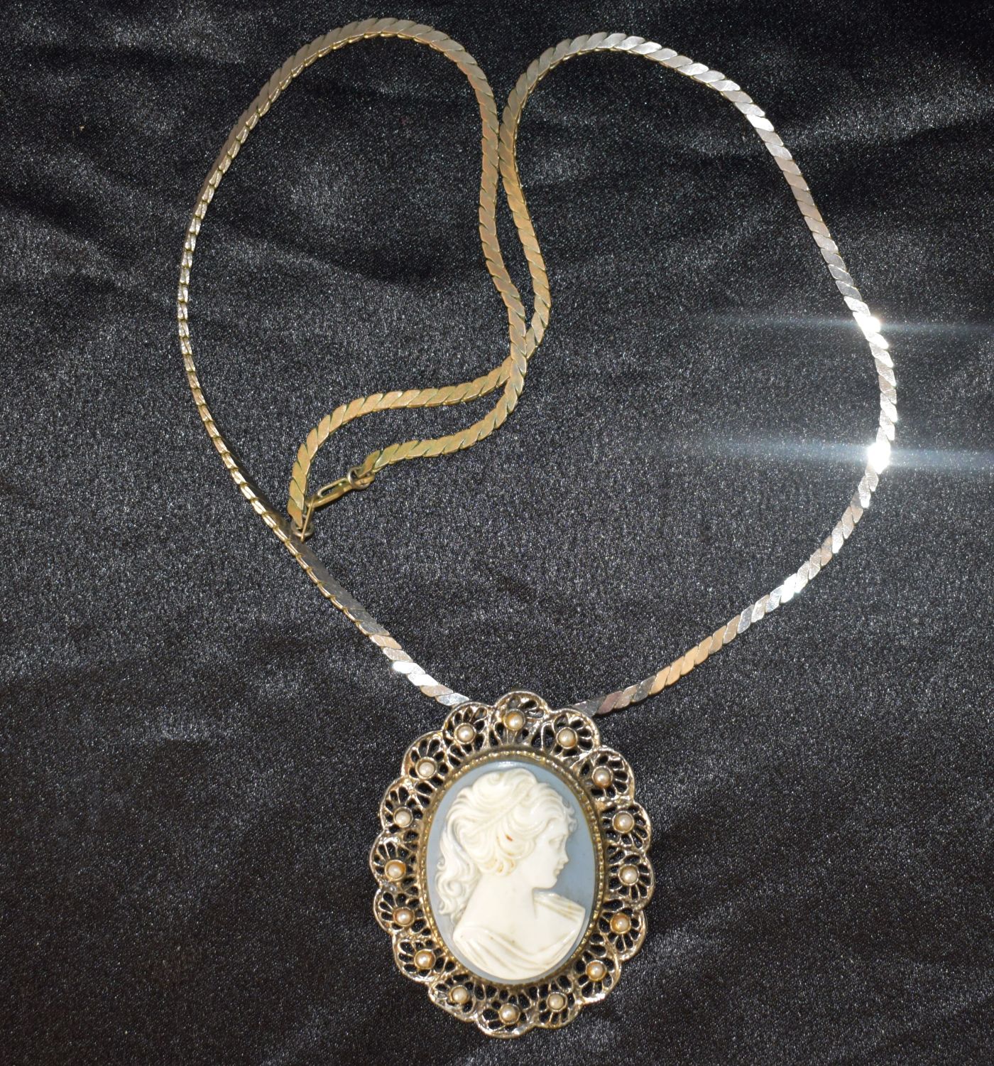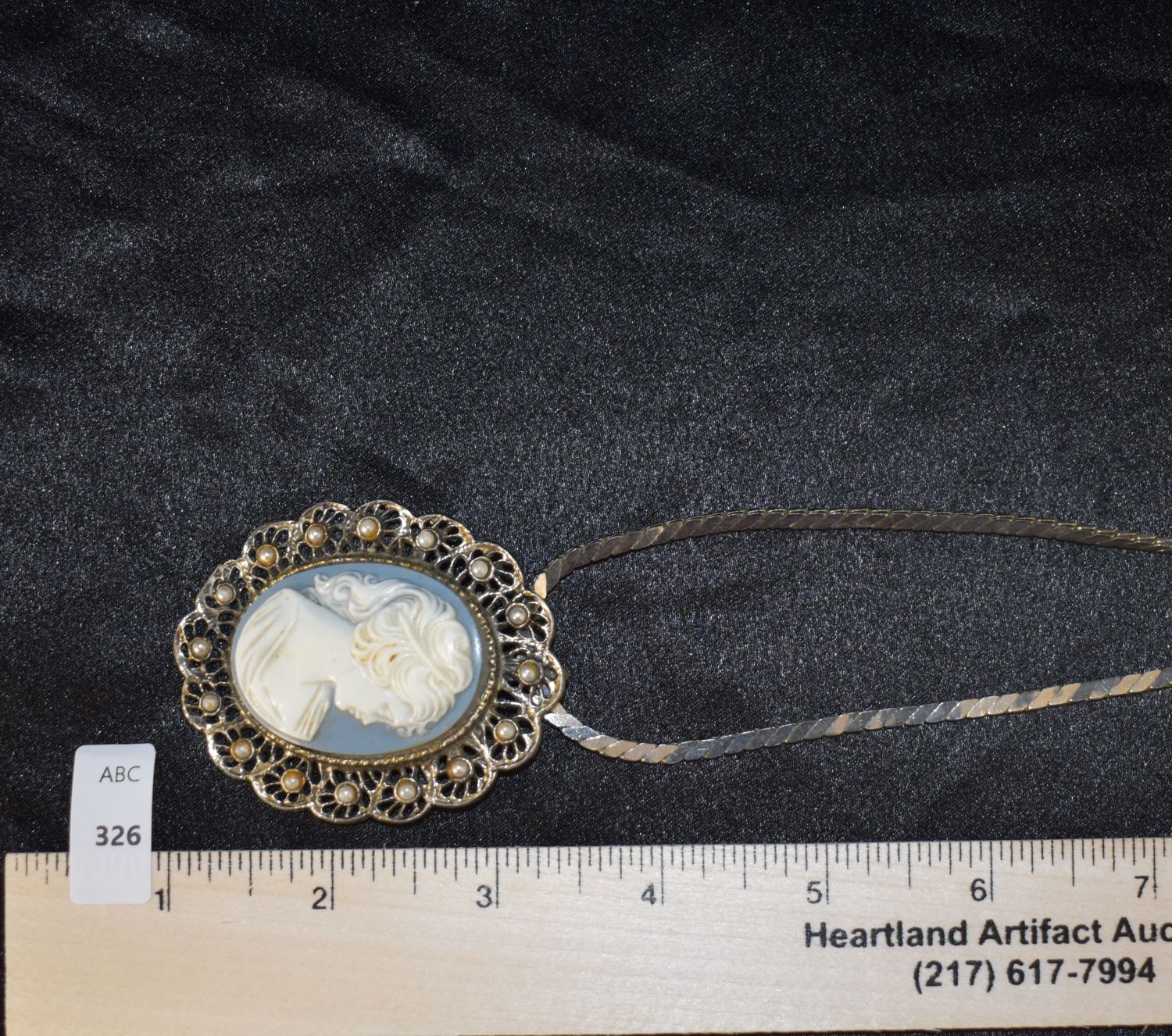 2 1/4″ Wedgewood Blue Cameo Pendant/Brooch, with artificial pearls, set in silver plated metal on silver plated chain, stamped Korea