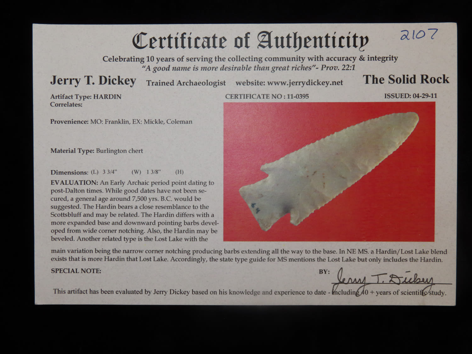 3 3/4" Hardin, 2xCOA-Dickey & Baker, found in Franklin Co, Missouri, Ex Mickle/Coleman, Ex Terry Allen, Ex John Limes Collection