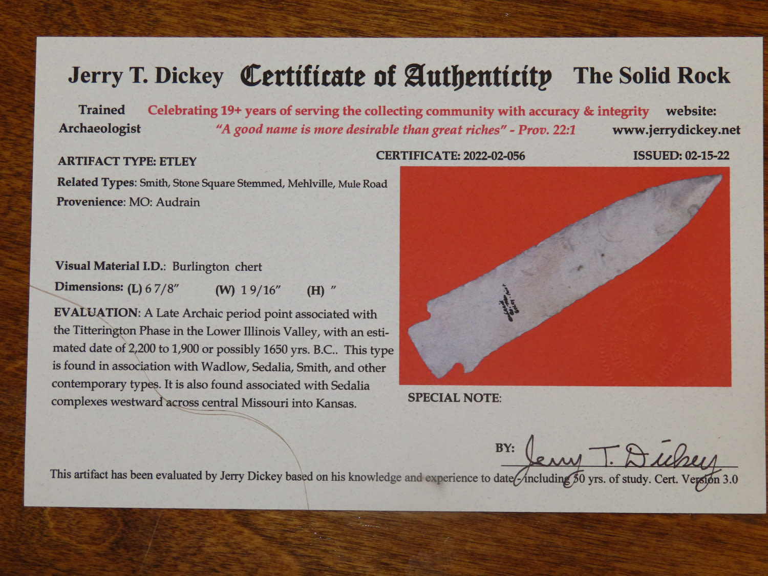 6 7/8″ Etley, Dickey COA, found in Audrain Co Missouri, , Ex John Limes Collection