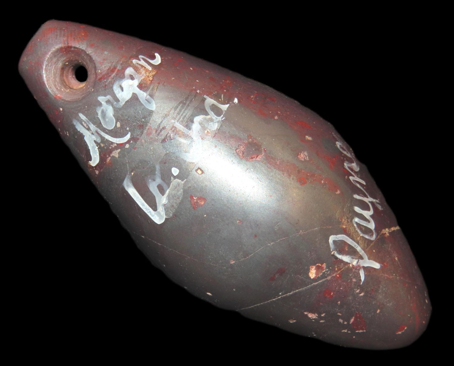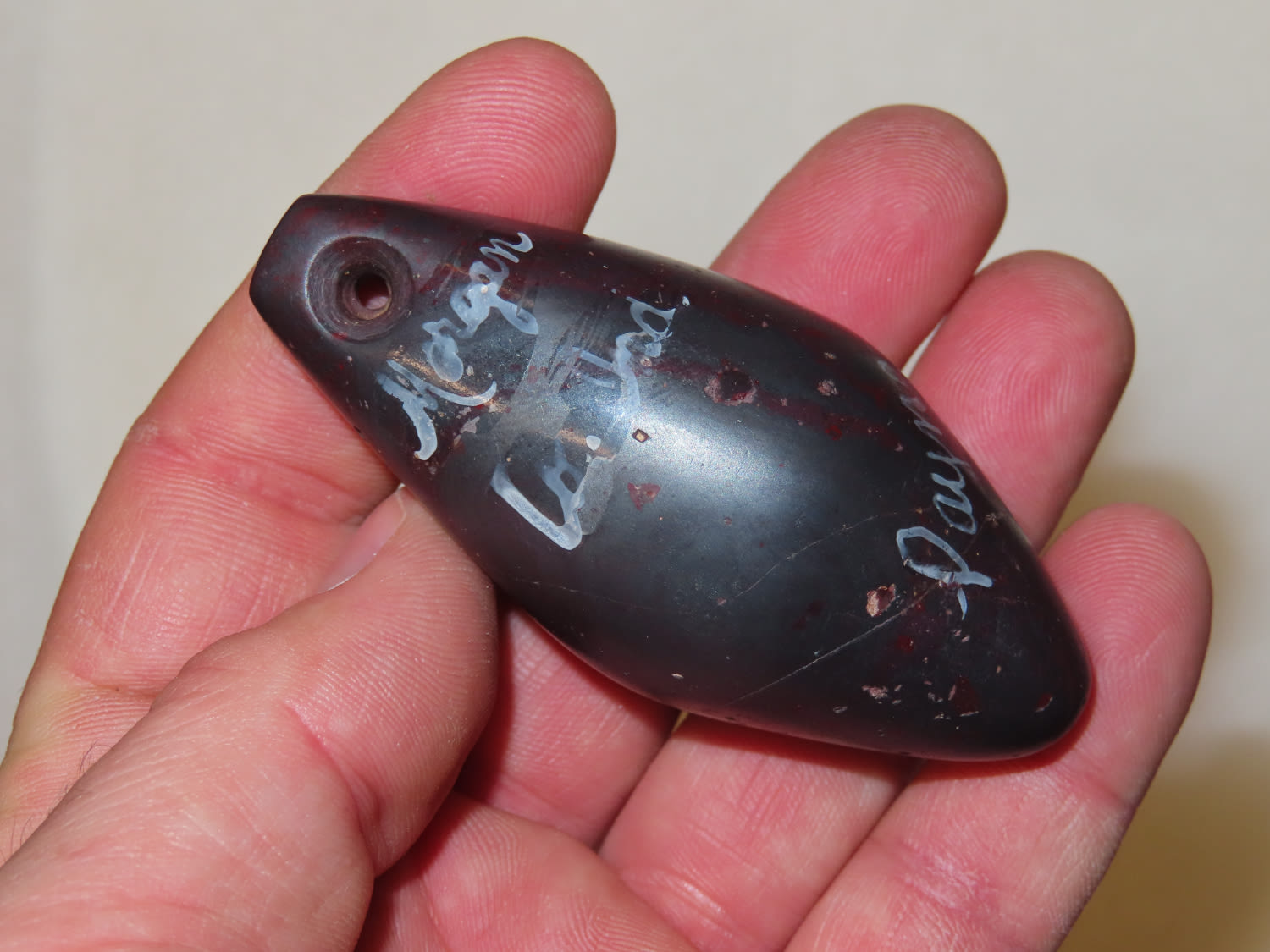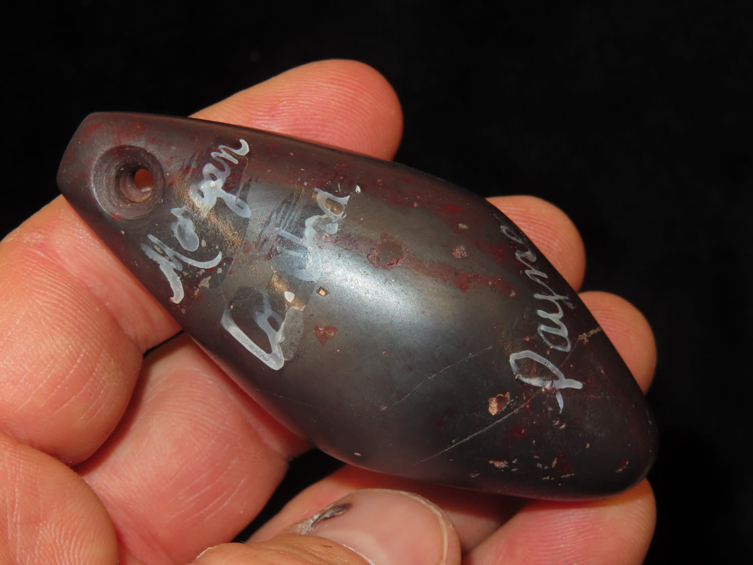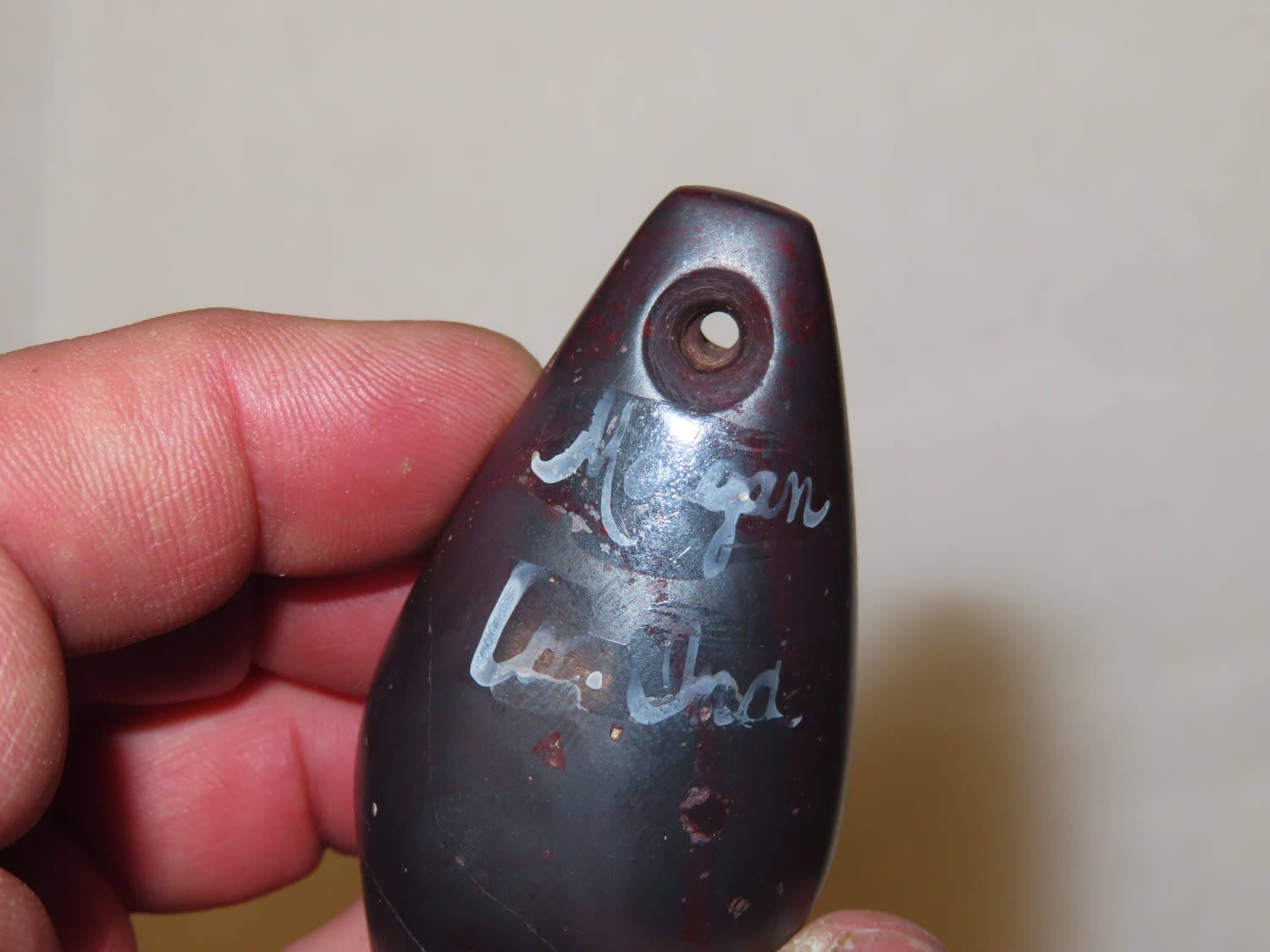 3″ Drilled Hematite Plummet, found in Morgan Co, Indiana, Ex Judge Edward Payne Collection