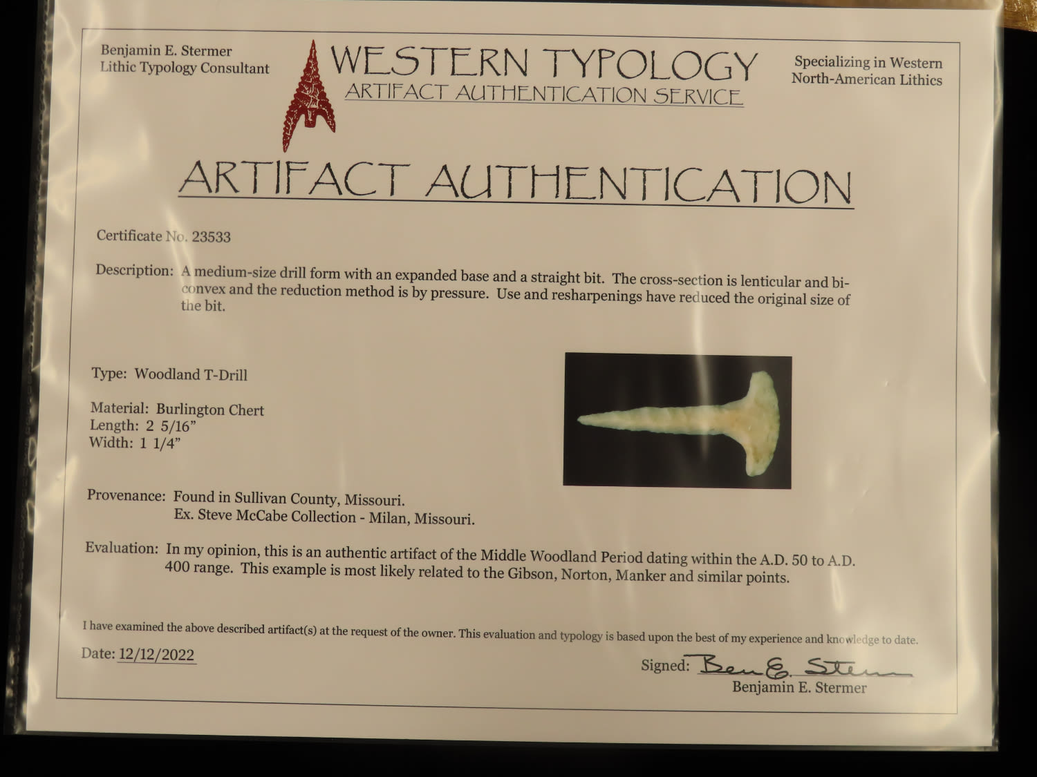 2 5/16″ Woodland T-Drill, Stermer COA, found in Sullivan Co Missouri, Ex Steve McCabe Collection, Milan Missouri