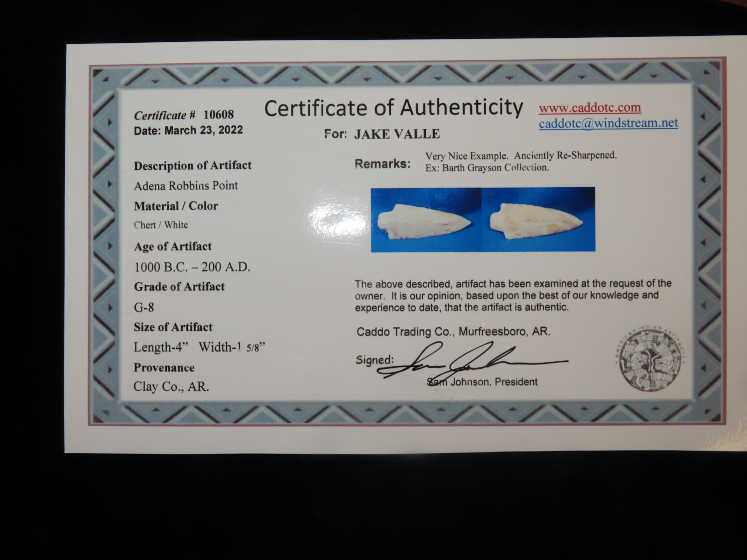 4" Adena Robbins, Johnson COA, Found in Clay Co, Arkansas