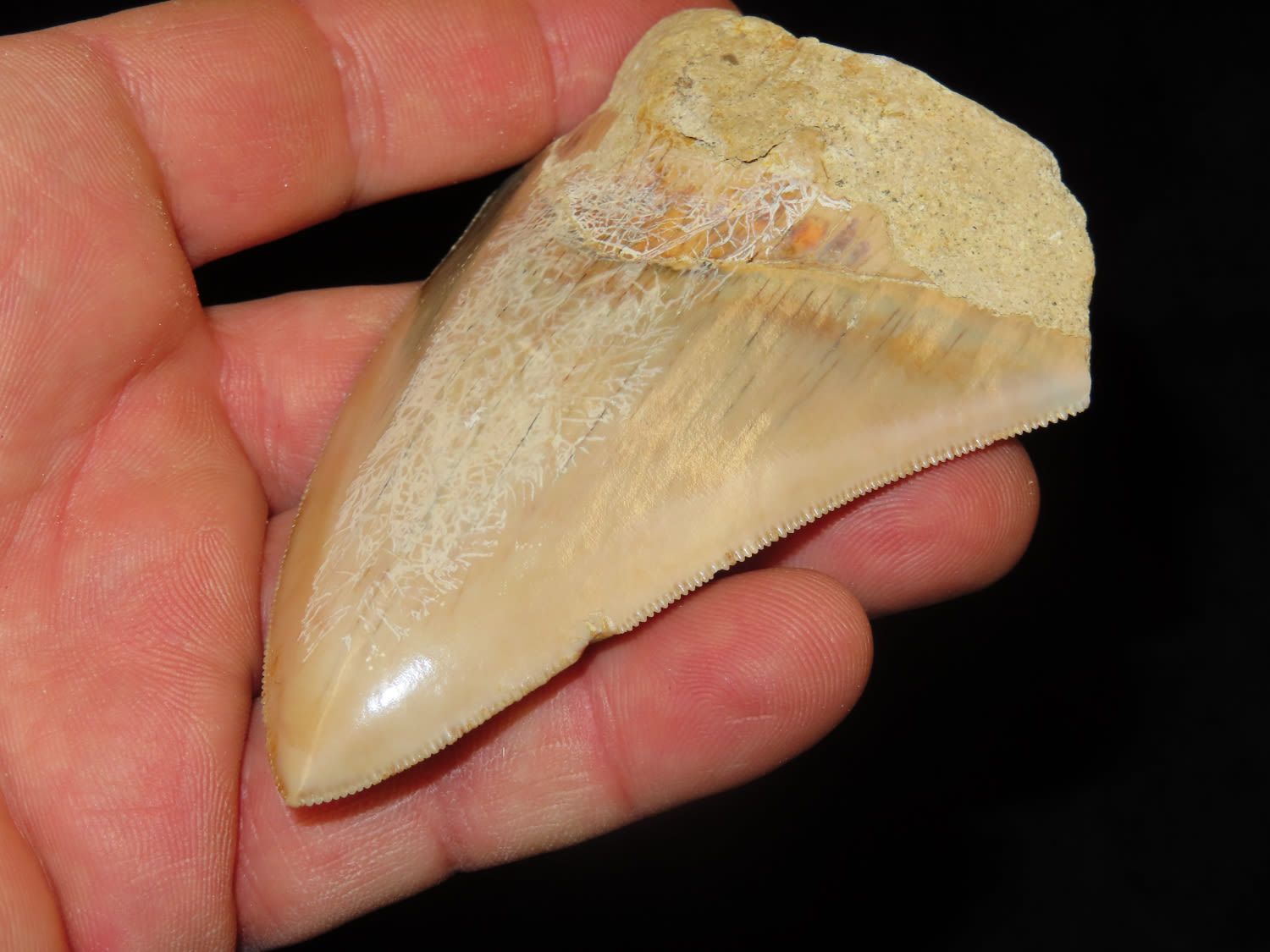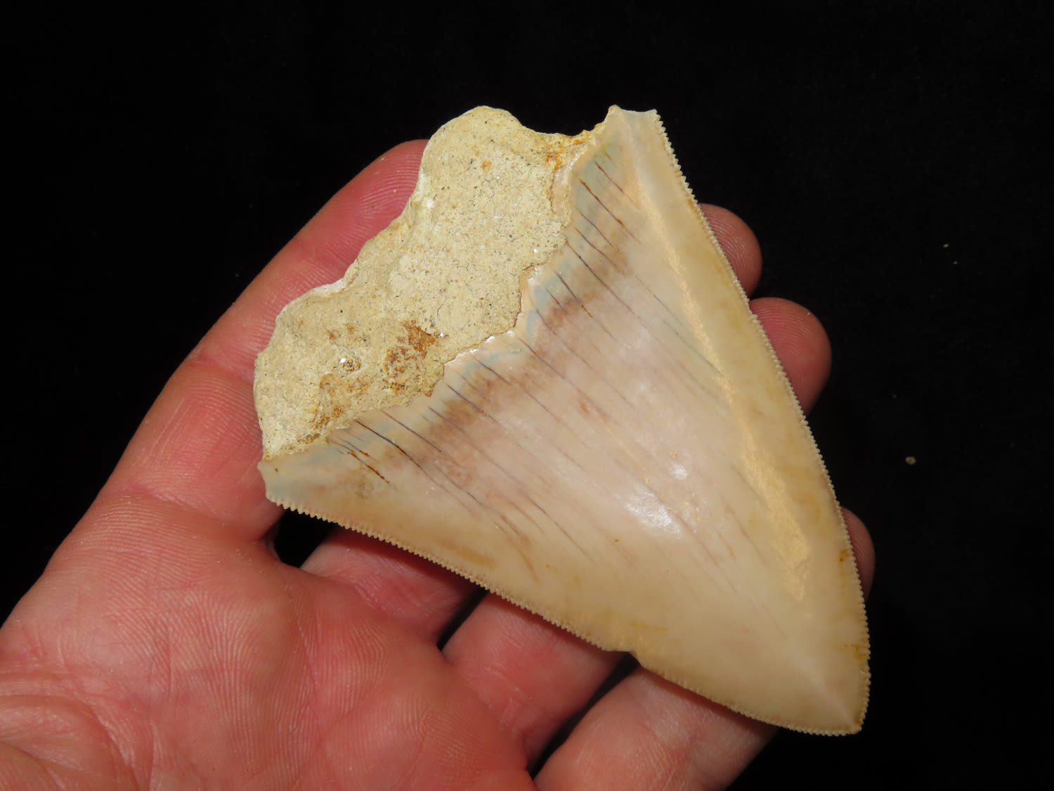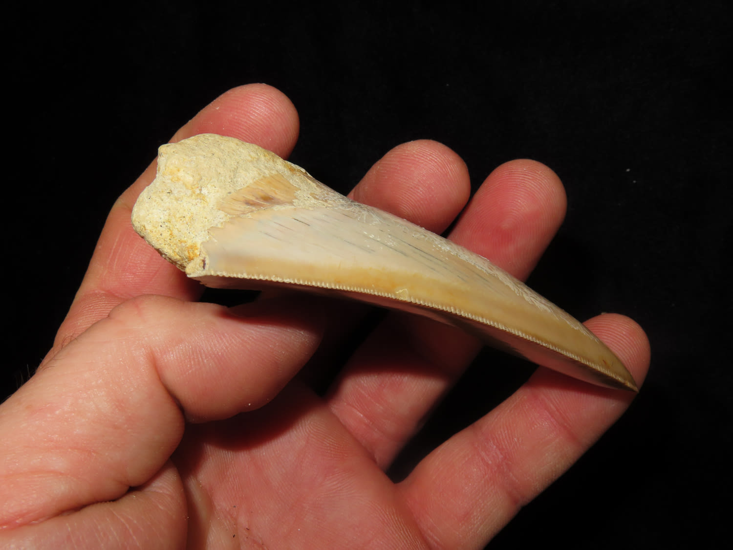 3 1/2″ Fossilized Megaladon Tooth with Super fine Serration on Edges