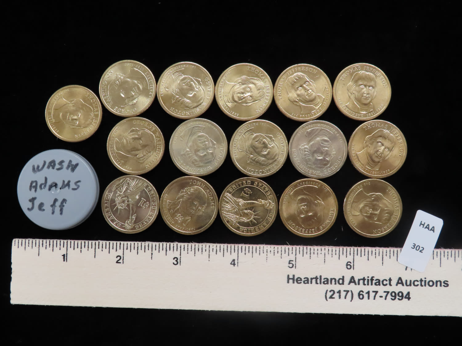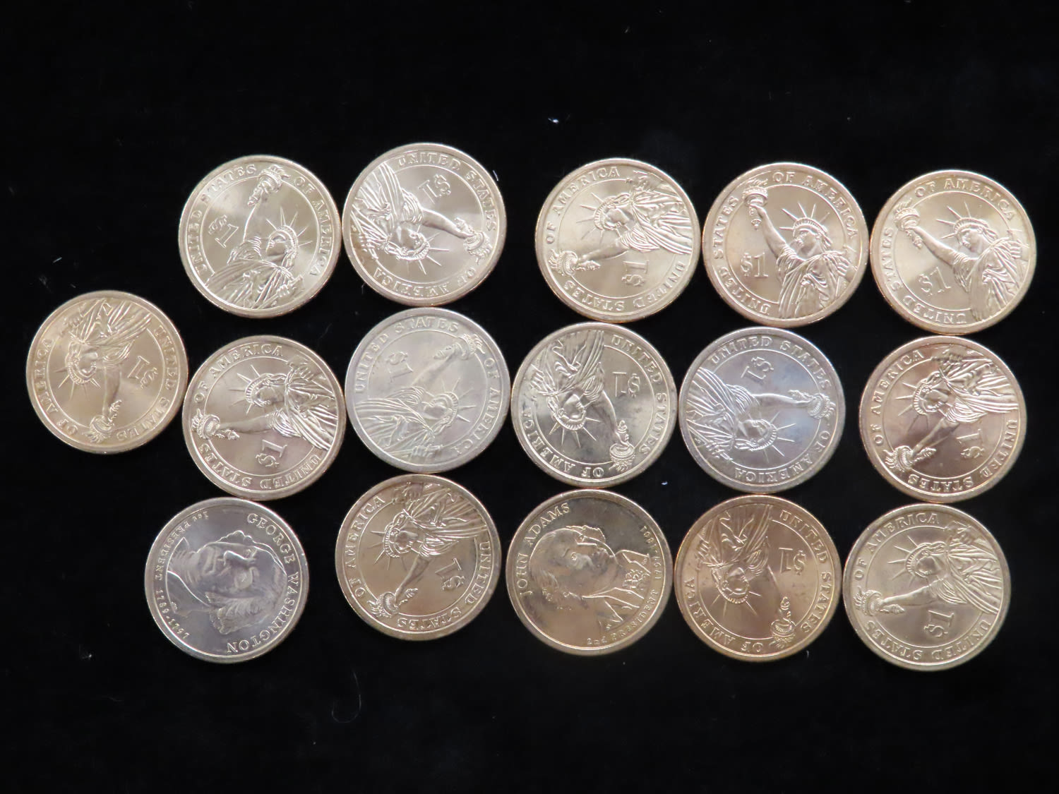 Sixteen US Mint $1 Coins featuring Pres. Washington, Adams, and Jefferson