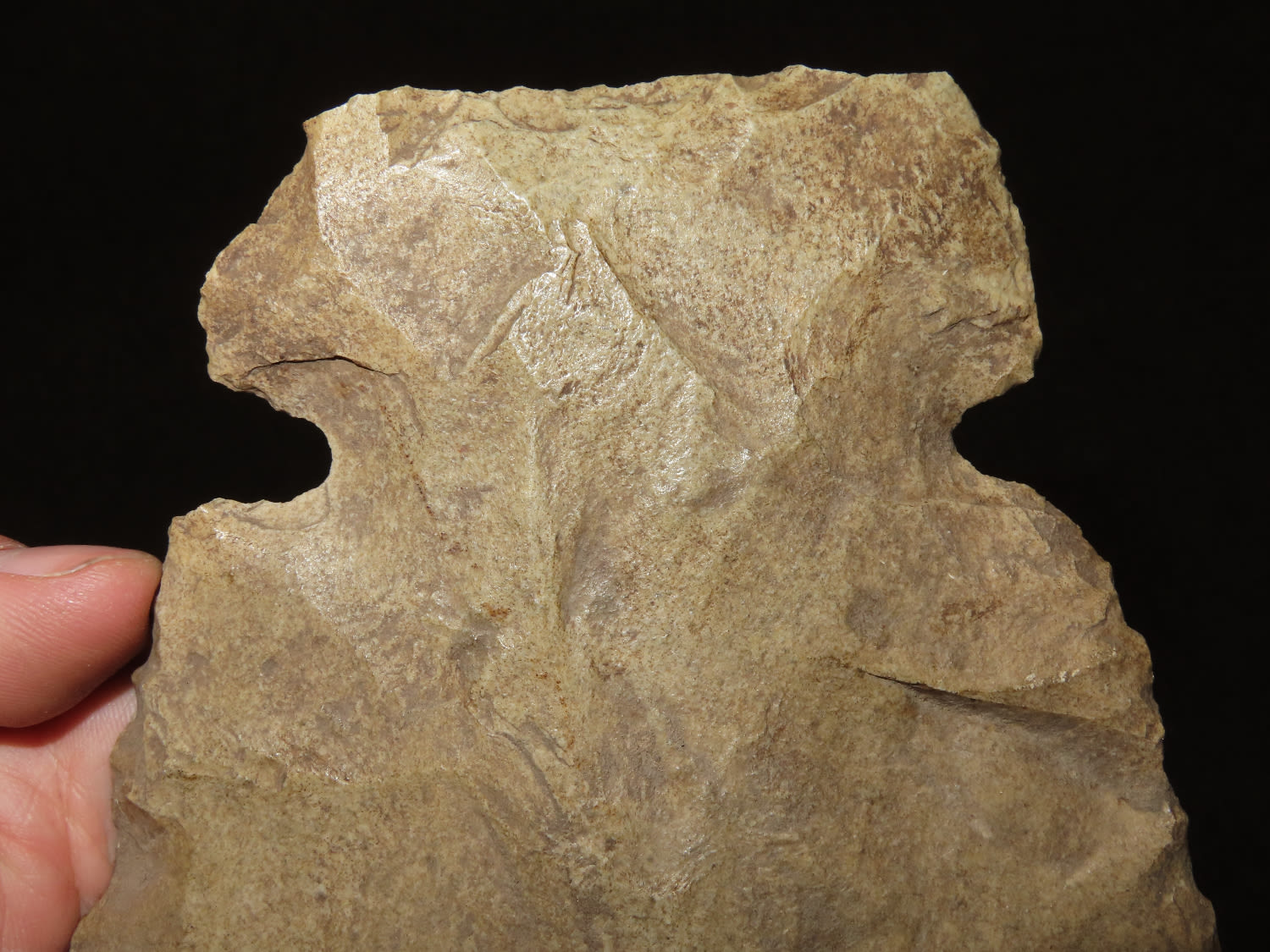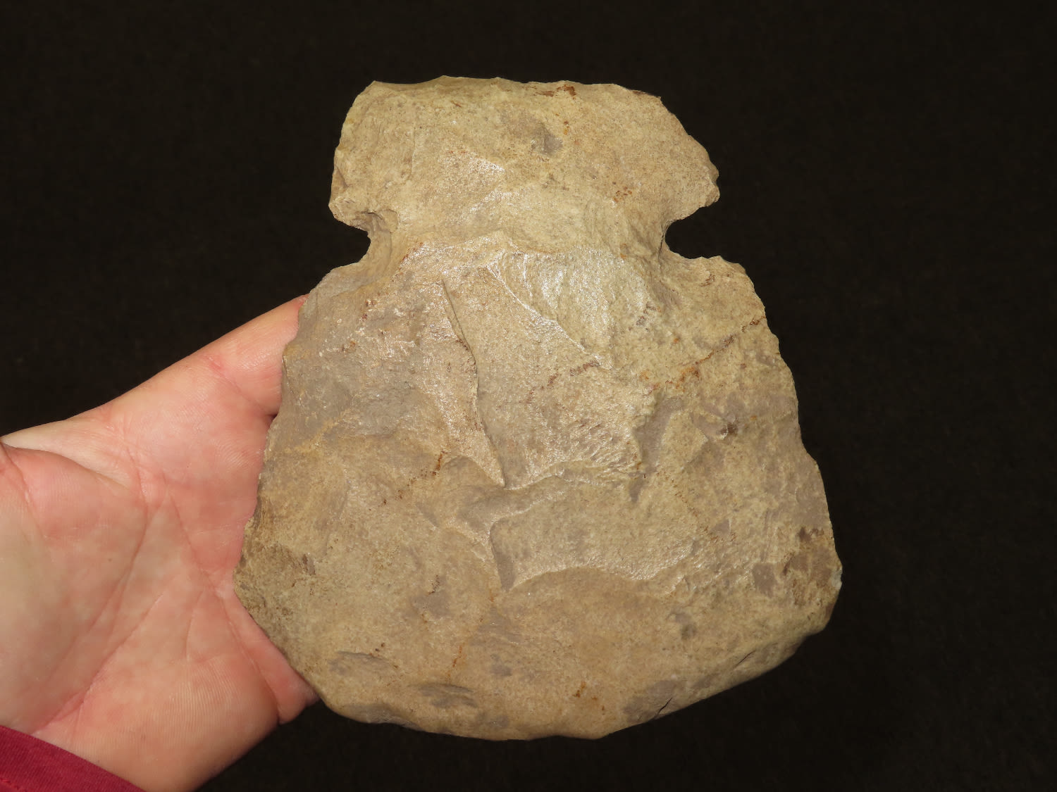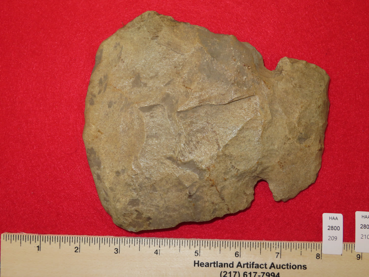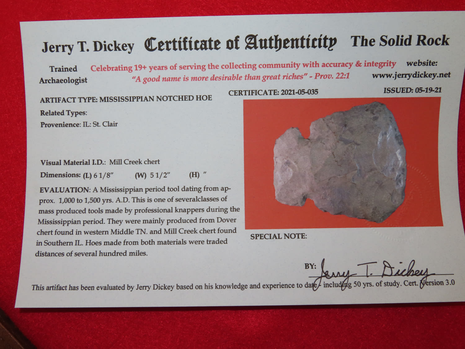 6 1/8″ x 5 1/2″ Mississippian Notched Hoe, Dickey COA, made of Mill Creek Chert, found in St Clair Co, Illinois-Beautiful Polished Bit from Use, Stunning Addition to any Collection!