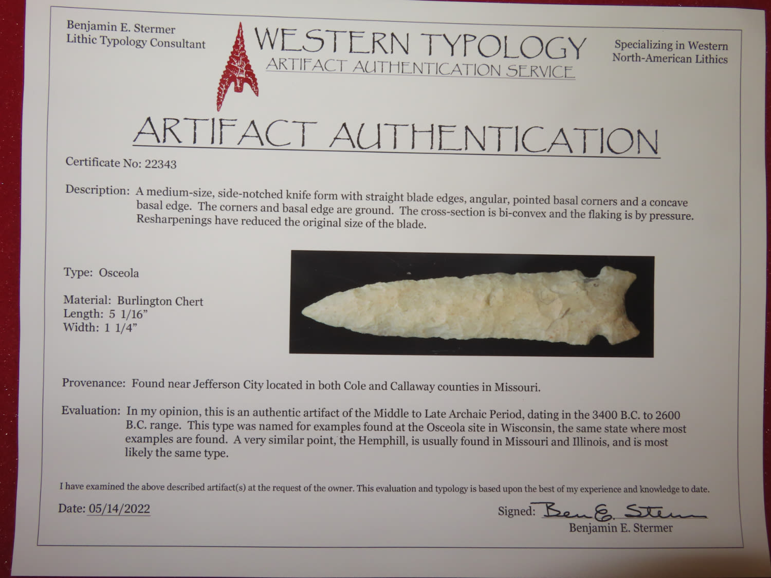 5 1/16″ Gorgeous Osceola Knife; Ben Stermer COA, Found near Jefferson City, located in both Cole and Callaway Counties in MO.