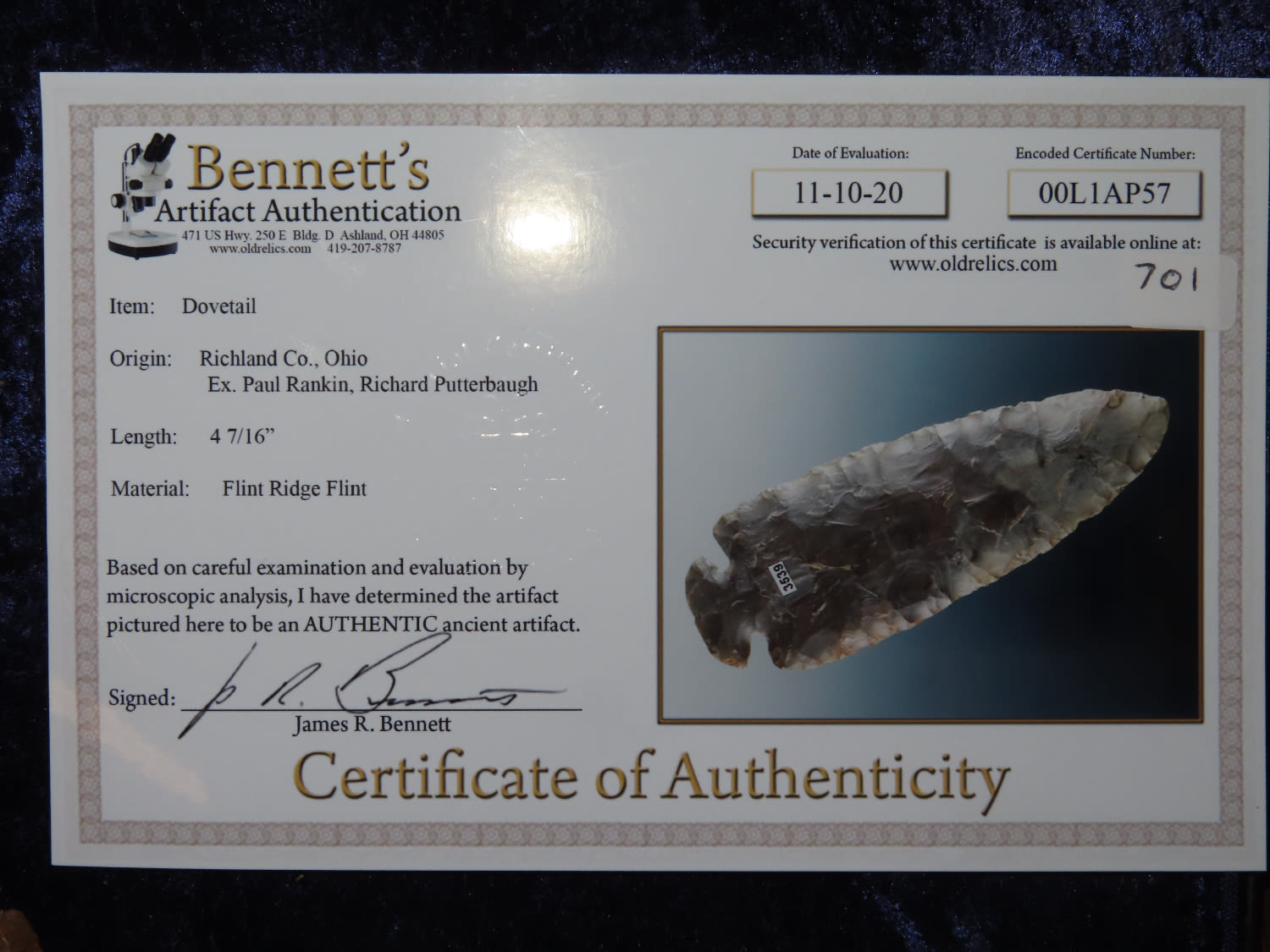 Super 4 7/16″ Dovetail, Bennett COA, Flint Ridge Flint, Found in Richland Co., Ohio, Ex. Paul Rankin & Richard Puitterbaugh