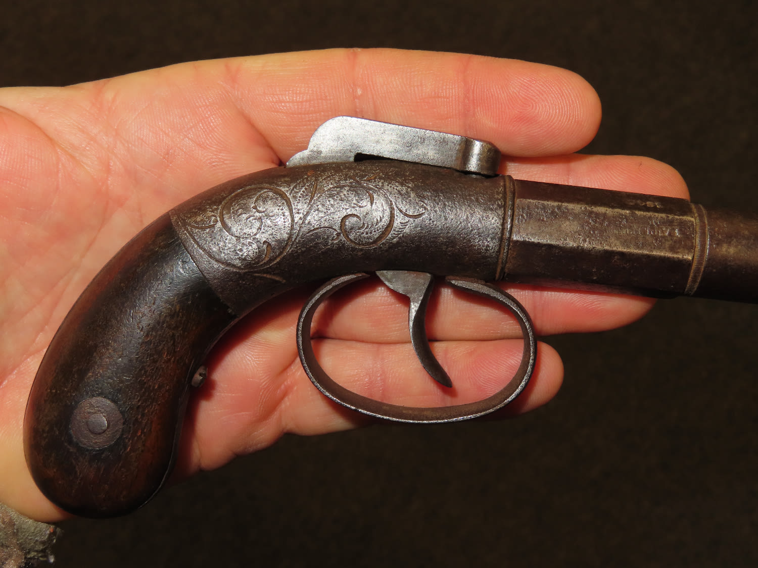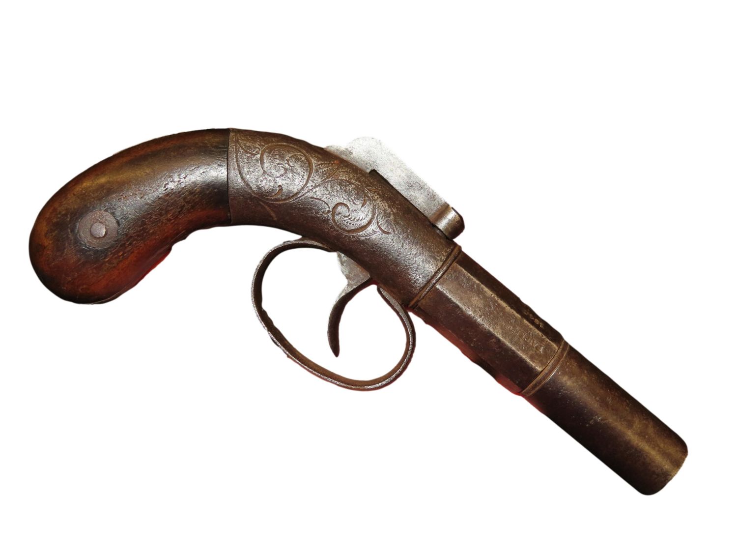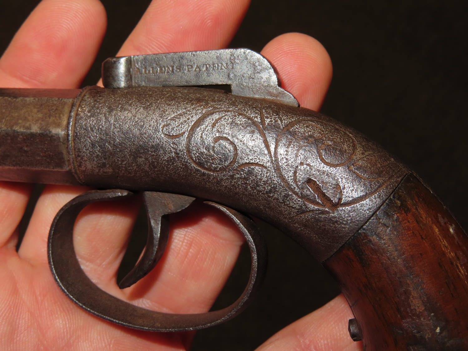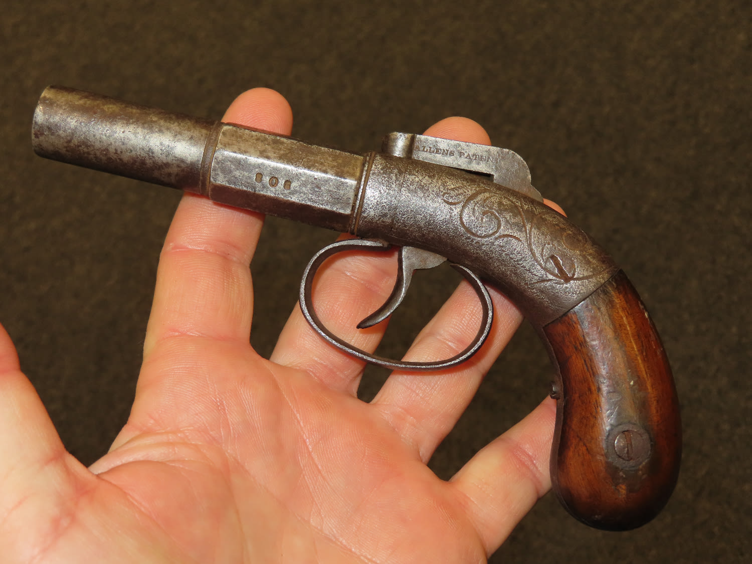 Allen & Wheelock Bar Hammer Pistol Serial # 828. .36 caliber black powder percussion single shot pistol with a 3” half round, half octagon barrel. The bore is fair to good with some light rust. The steel barrel frame is in fair to good condition showing a grey patina. The plain hardwood grips are in fair condition with finish wear and some dents and dings. Action works OK. Allen & Wheelock was in business from 1857 until 1864