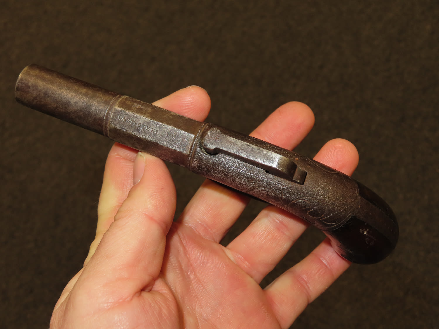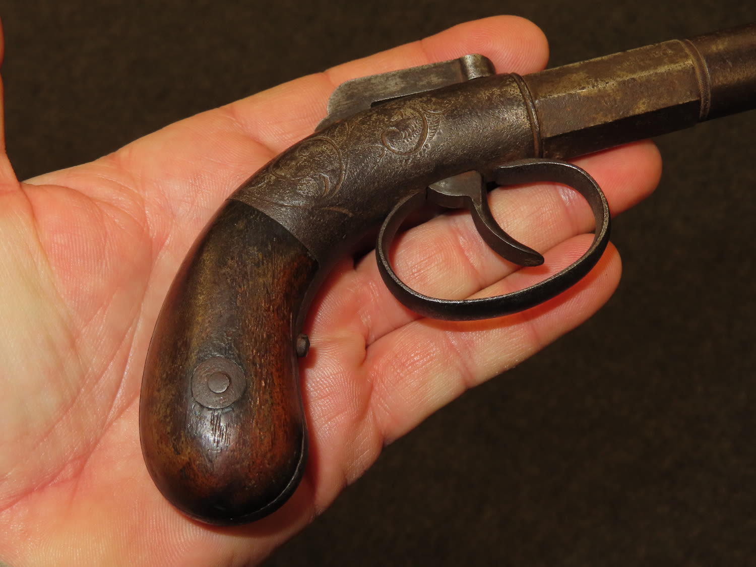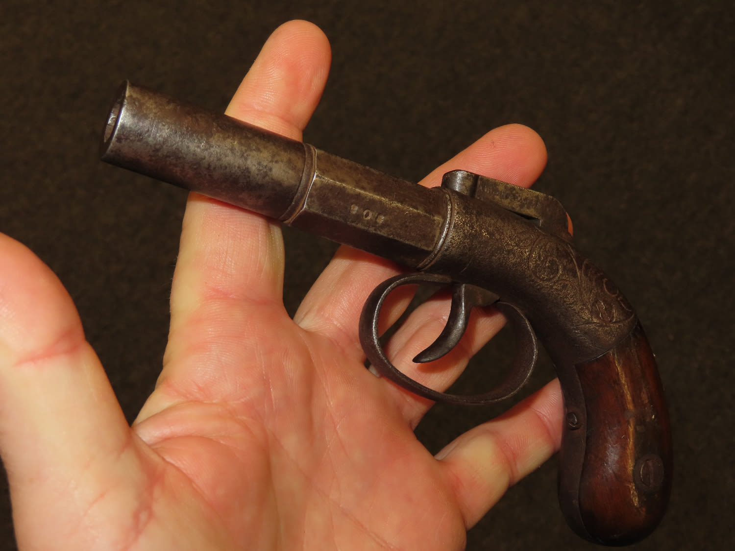 Allen & Wheelock Bar Hammer Pistol Serial # 828. .36 caliber black powder percussion single shot pistol with a 3” half round, half octagon barrel. The bore is fair to good with some light rust. The steel barrel frame is in fair to good condition showing a grey patina. The plain hardwood grips are in fair condition with finish wear and some dents and dings. Action works OK. Allen & Wheelock was in business from 1857 until 1864