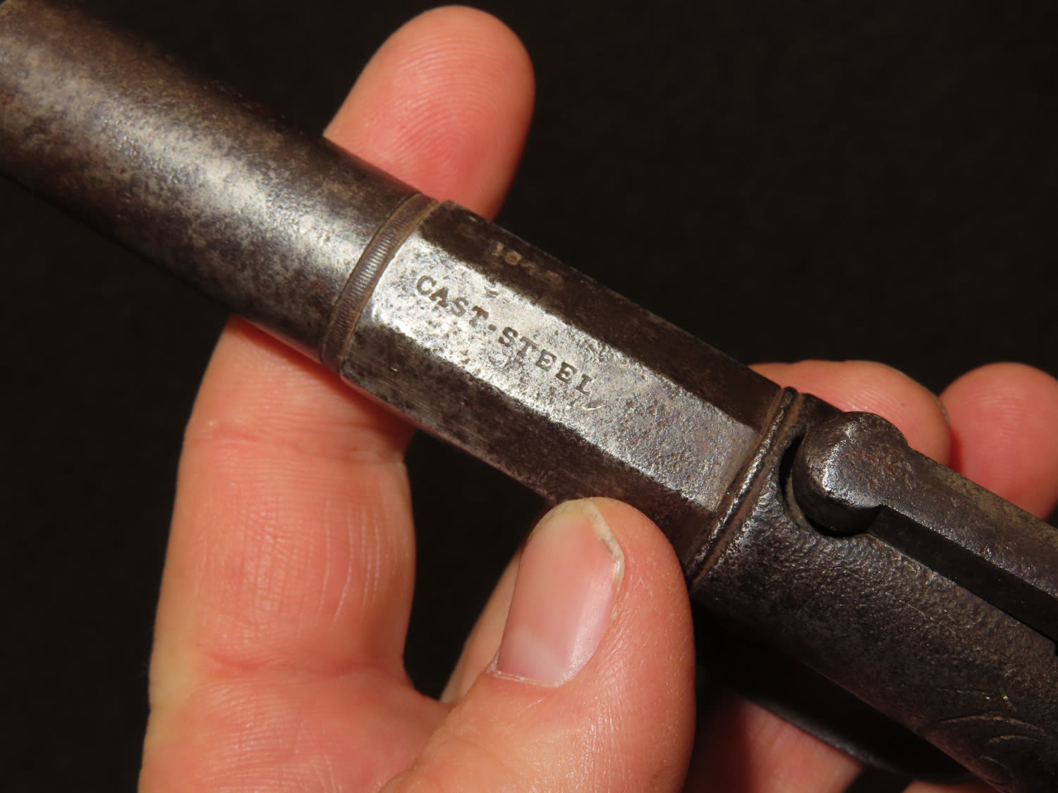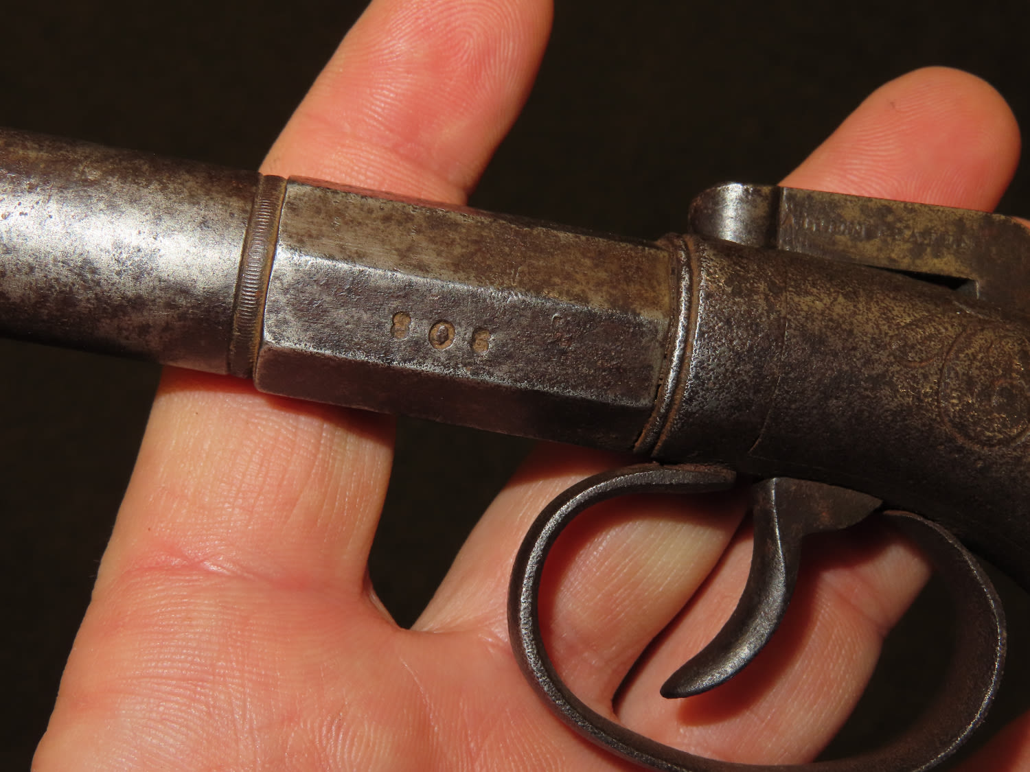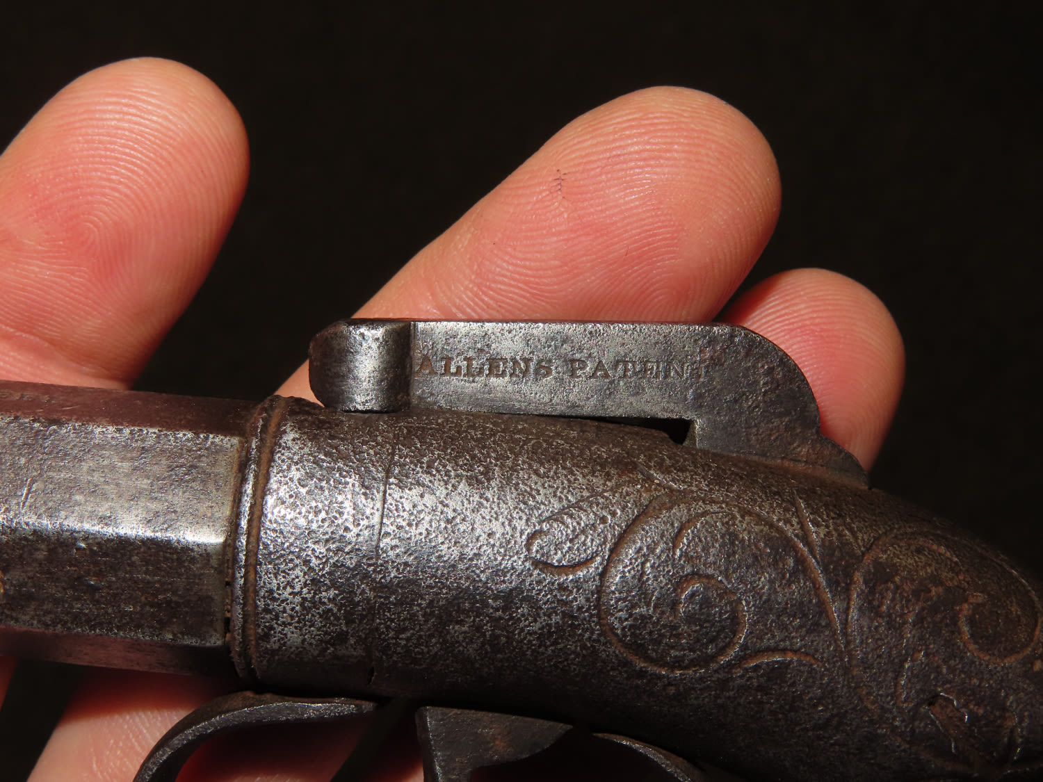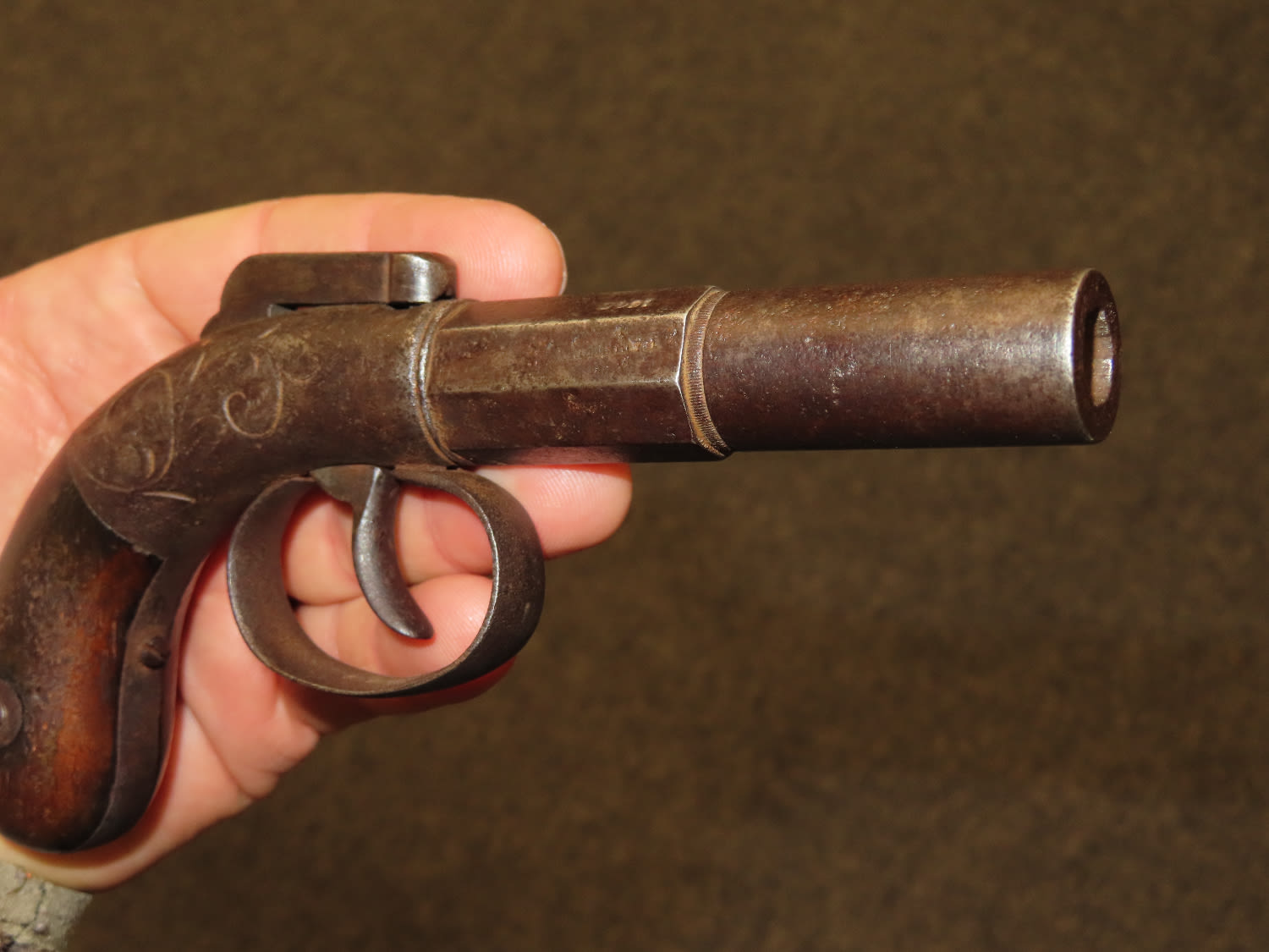 Allen & Wheelock Bar Hammer Pistol Serial # 828. .36 caliber black powder percussion single shot pistol with a 3” half round, half octagon barrel. The bore is fair to good with some light rust. The steel barrel frame is in fair to good condition showing a grey patina. The plain hardwood grips are in fair condition with finish wear and some dents and dings. Action works OK. Allen & Wheelock was in business from 1857 until 1864