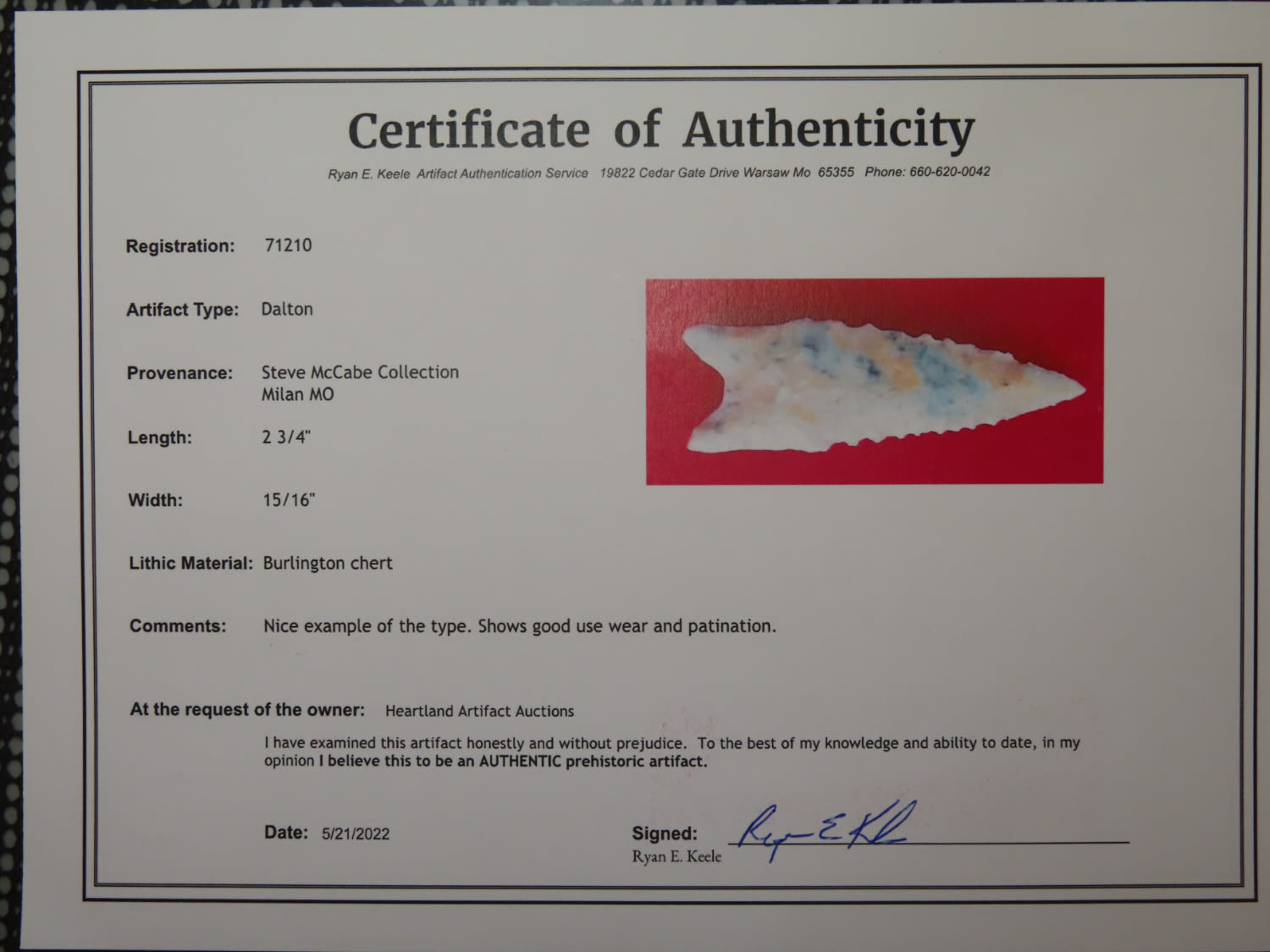 2 3/4″Colorful Dalton; Ryan Keele COA; EX. Steve McCabe Collection from Milan, MO.