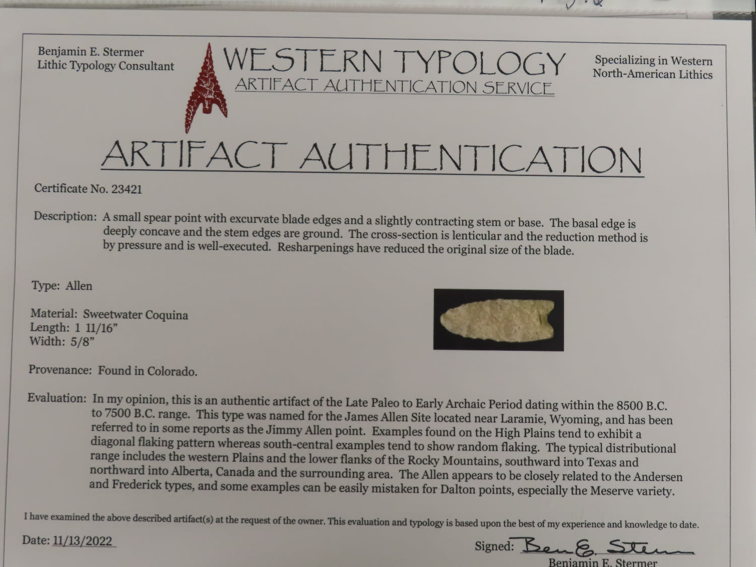 1 11/16" Late Paleo/ Early Archaic High Plains Allen (8500 BC - 7500 BC)1", Made of Sweetwater Coquina; Ben Stermer COA; Found in Colorado