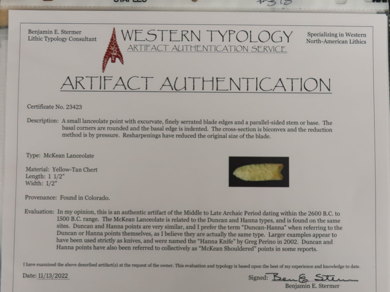 1 1/2″ High Plains McKean Lanceolate, yellow-Tan Chert Material; Ben Stermenr COA; Found in Colorado