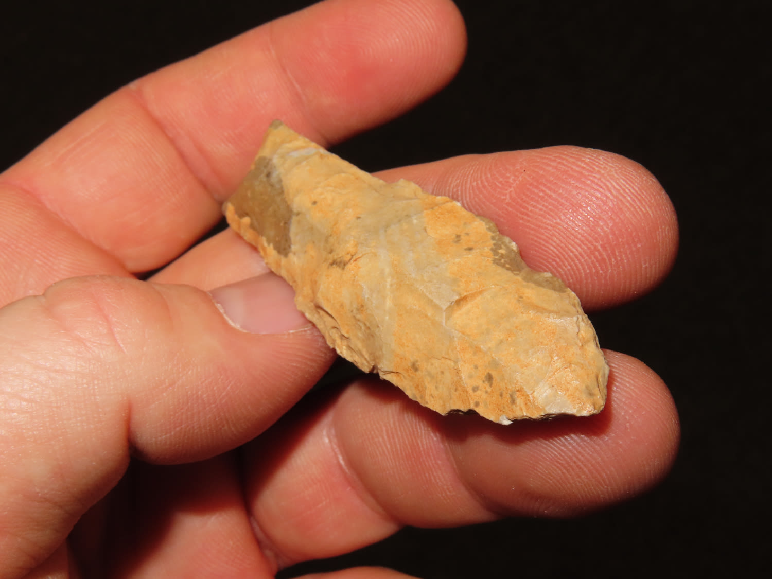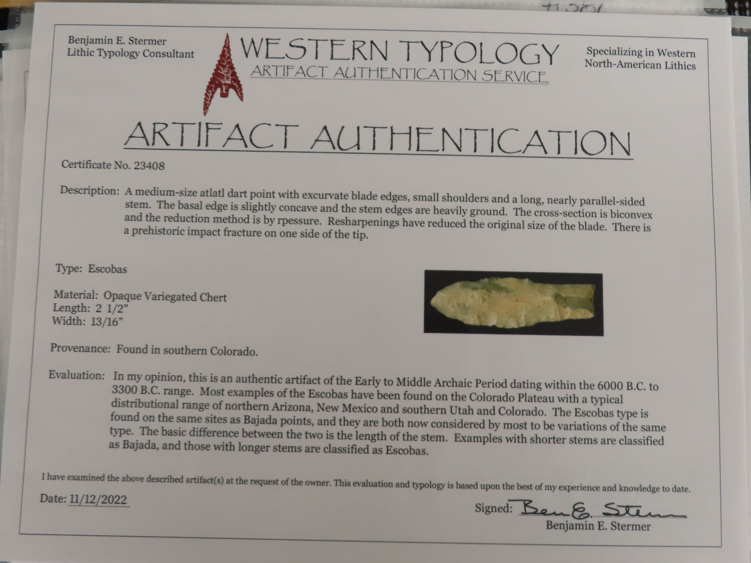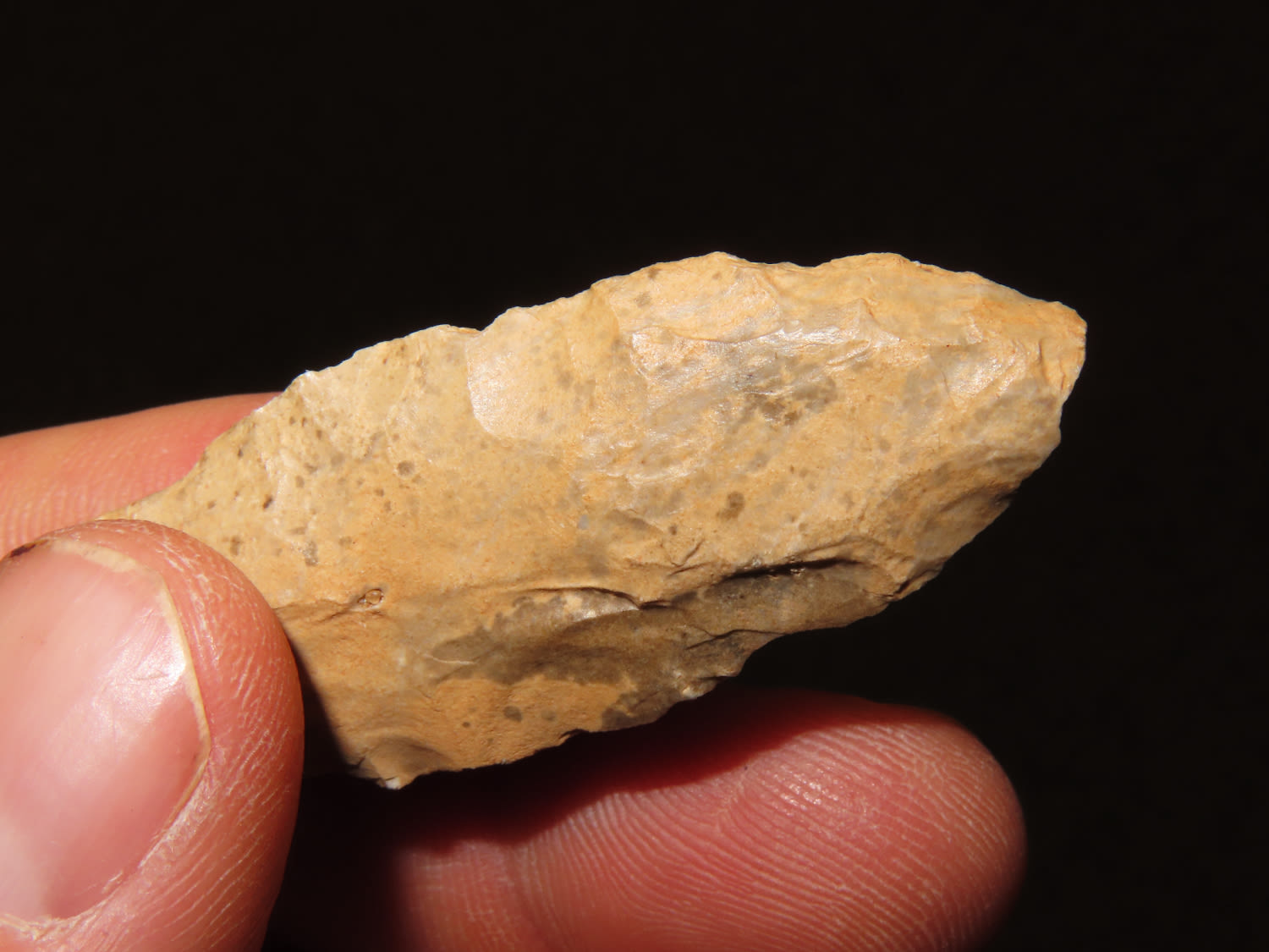 2 1/2″ Early- Mid Archaic High Plains Escobas (6000 BC – 3300 BC) Opaque Variegated material; Ben Stermer COS; Found Southern Colorado