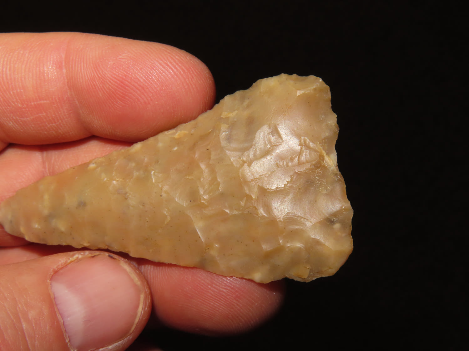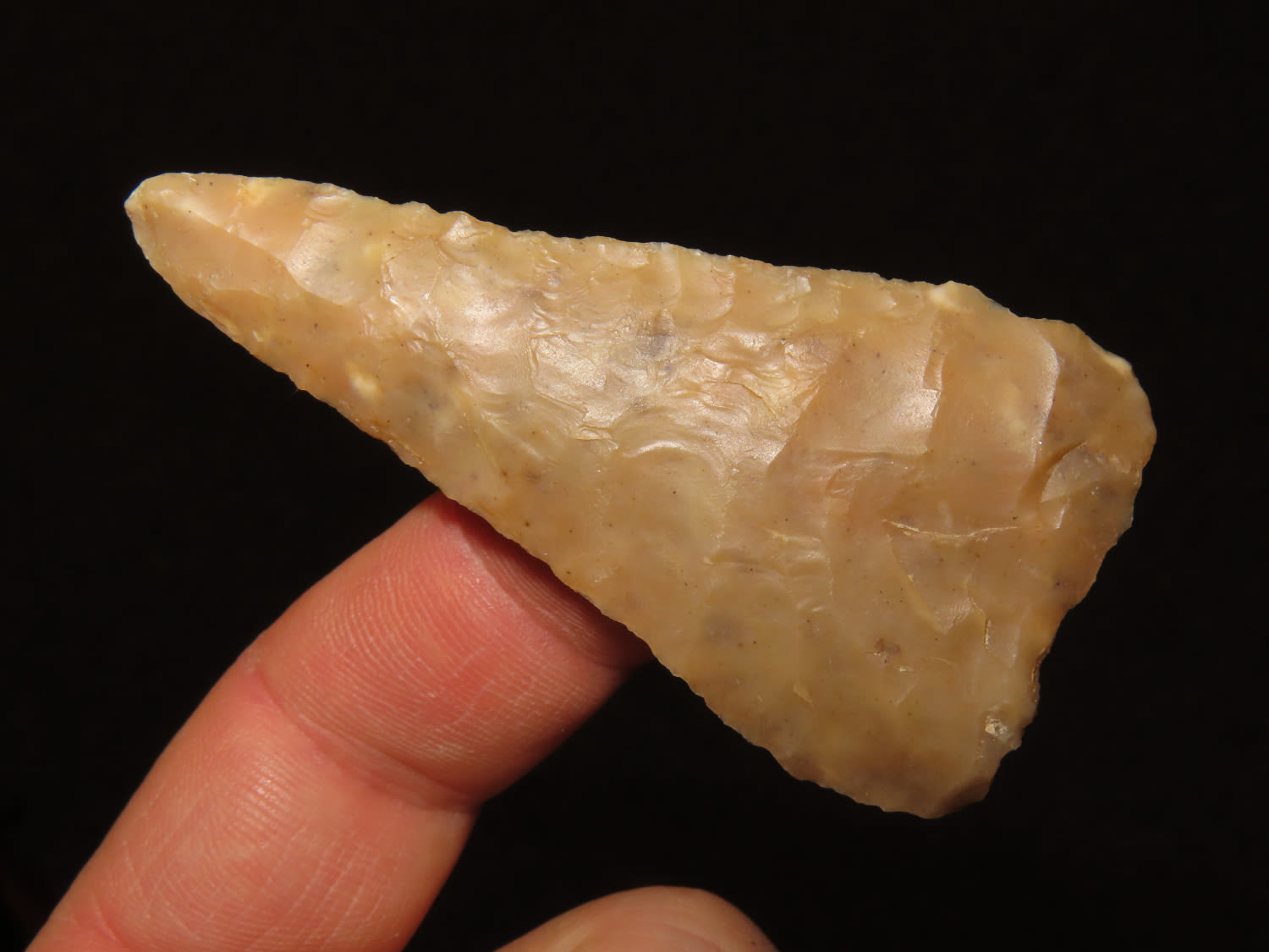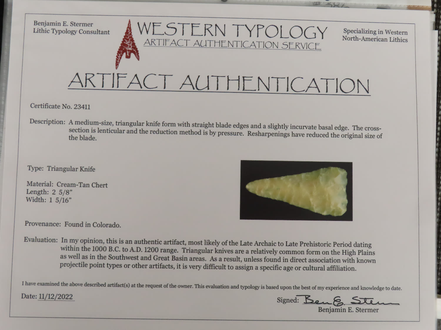 2 5/8″ Late Archaic/ Late Prehistoric High Plains Triangular Knife (1000 BC – 1200 AD range), Cream-Tan Chert Material; Ben Stermer COA; Found in Colorado